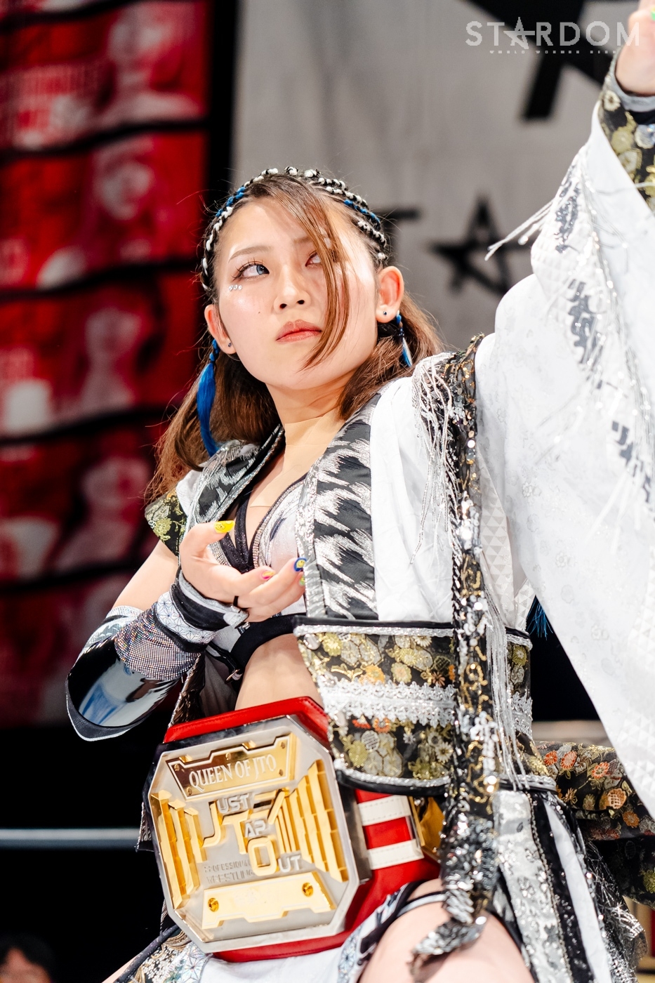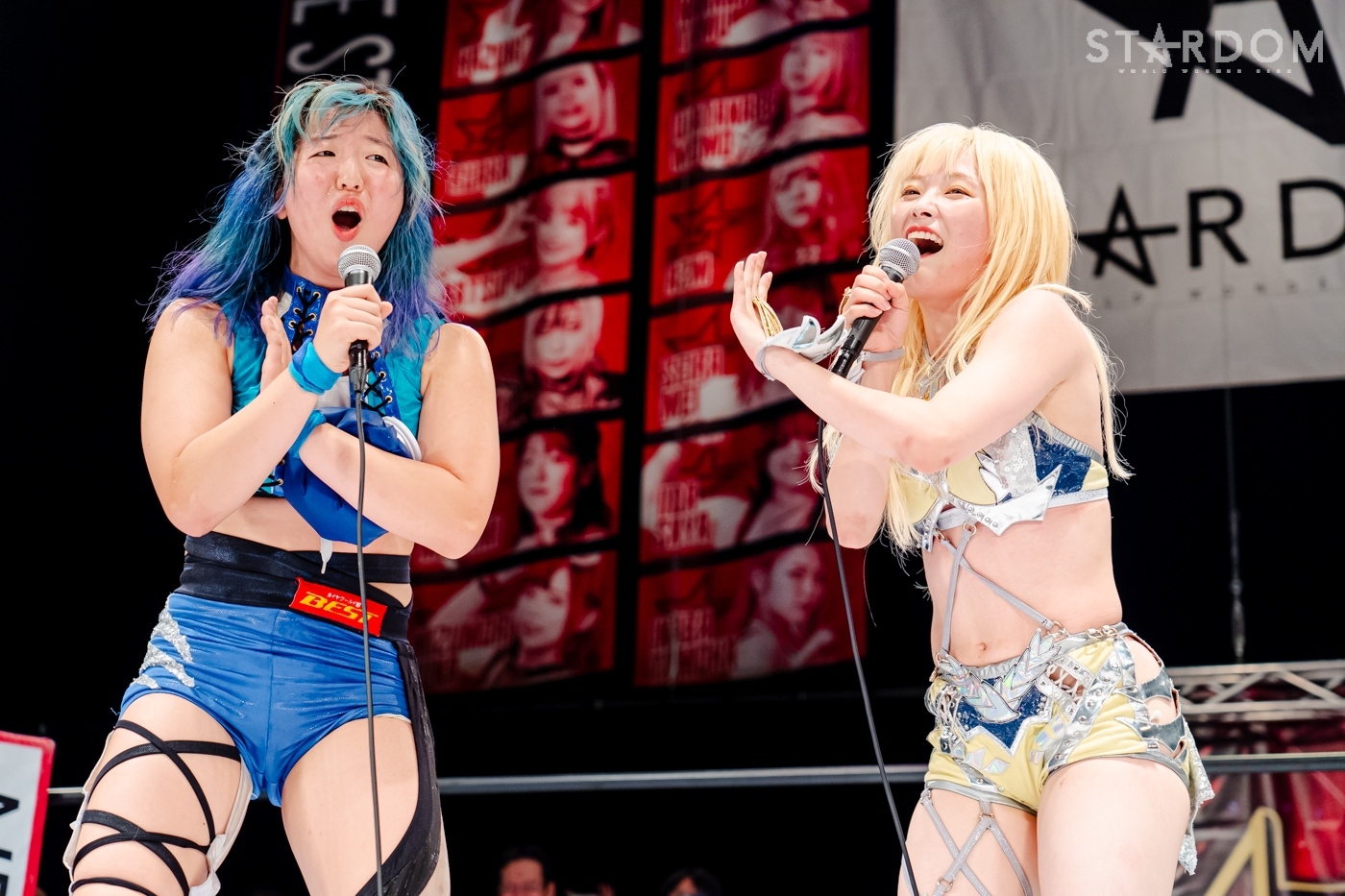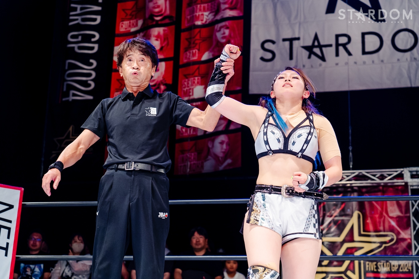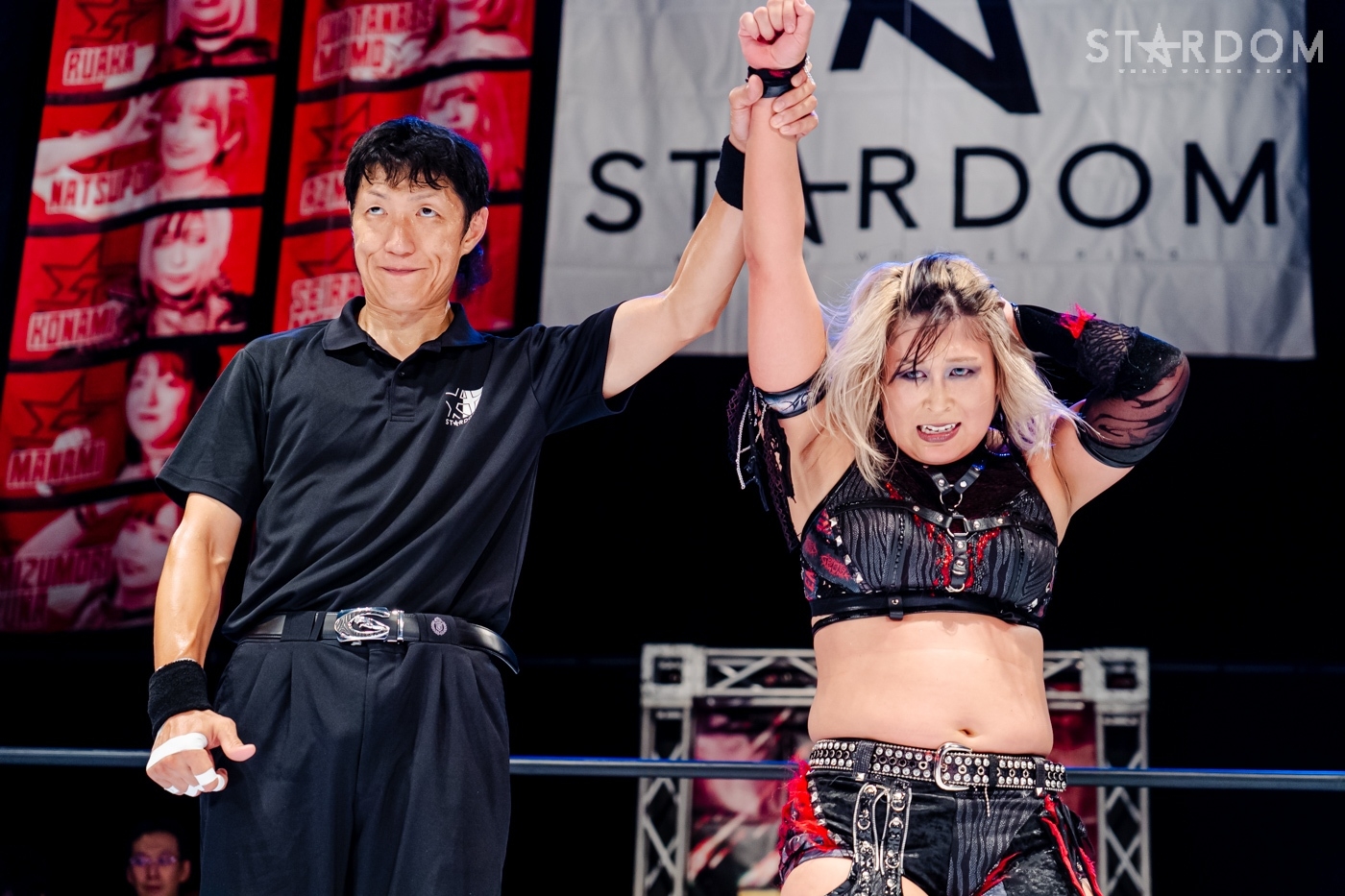 新宿で、このままいけば私1位通過だから、レッドスターズBの2位の人とやるのかな?わからないけど。そこでも勝って、31日武蔵野の森、両方勝ってスターダム初の全勝優勝者に必ず私がなります。清々しく今年こそは私の夏にして見せたいと思います。以上です。あ~疲れた」