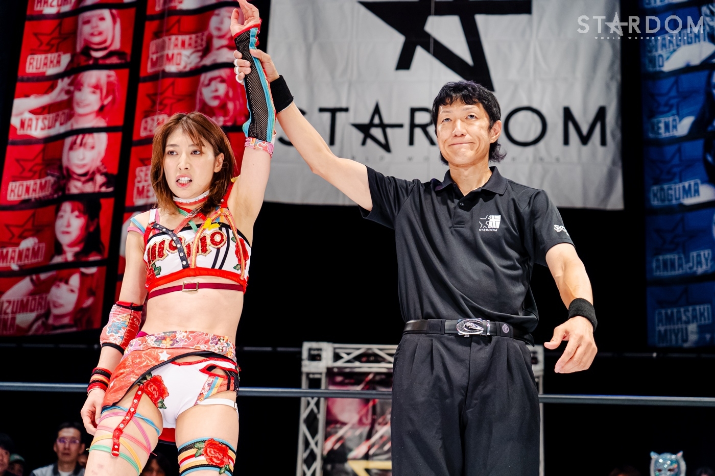 「5★STAR、8点目かな?何点だろう?たぶん8点目かな?獲得しました。仙台、フォー!のホームだったと思うんだけど、空気は読むもんじゃない、作るもんなんだって、どっかの誰かさんに言われたことあるからさ。今日は空気読まず、ちゃんと2点獲得しにいきました。愛海ちゃん、フォー!とぽいの闘いはまだ始まったばっかり。これからもっともっとお互いに成長して強くなって、また絶対にやりましょう。愛海ちゃんの強さ、奇声、スターダムの全部に伝わっていると思います。ぽいも絶対に負けません! そのときまで、ばいぽーい!」