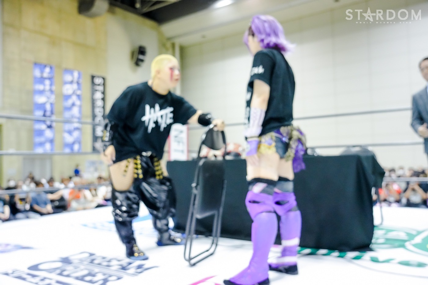 試合前、8・31調布でおこなわれるワールド・オブ・スターダム選手権試合、刀羅ナツコvs中野たむの調印式がおこわれた。調印書にサインを入れ、王者・ナツコ、挑戦者・中野がコメント。
