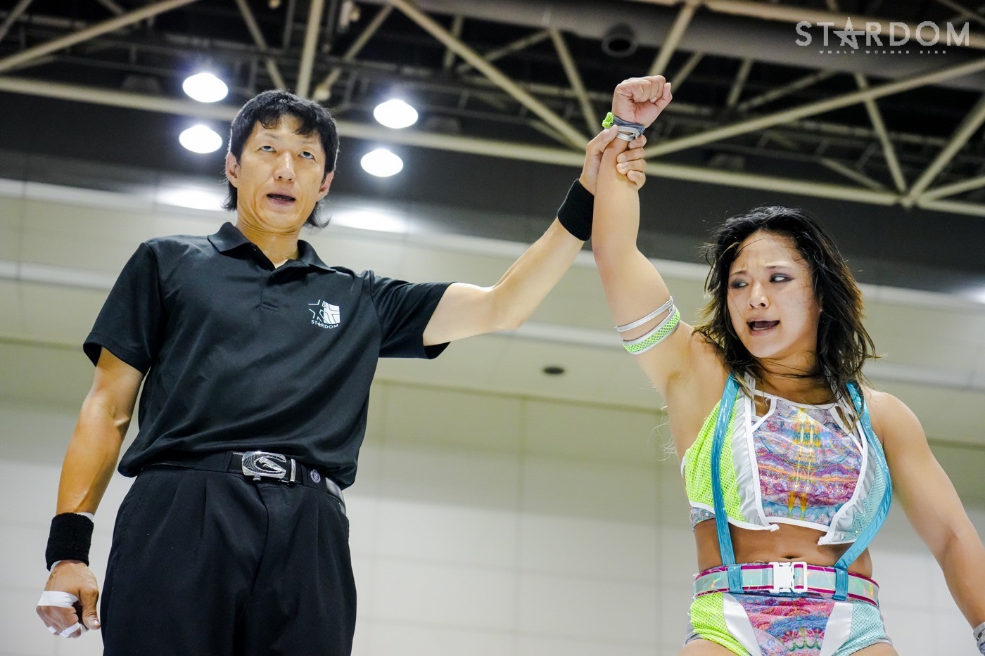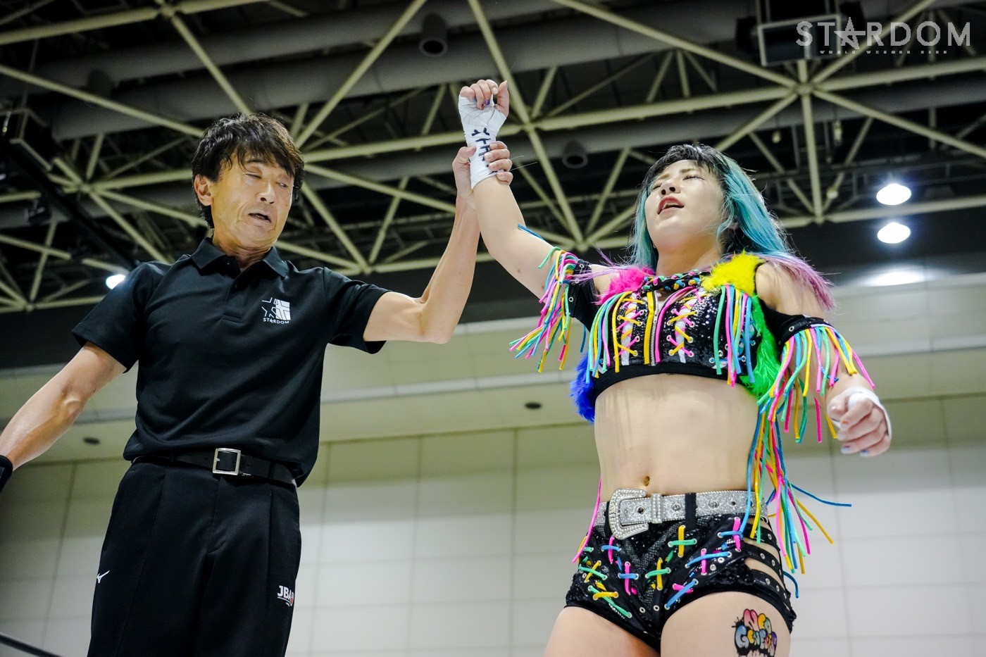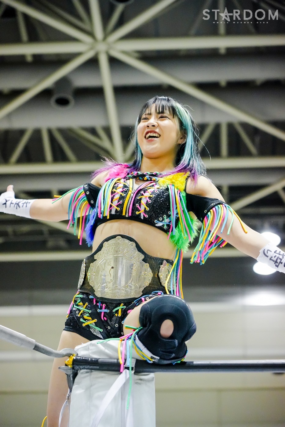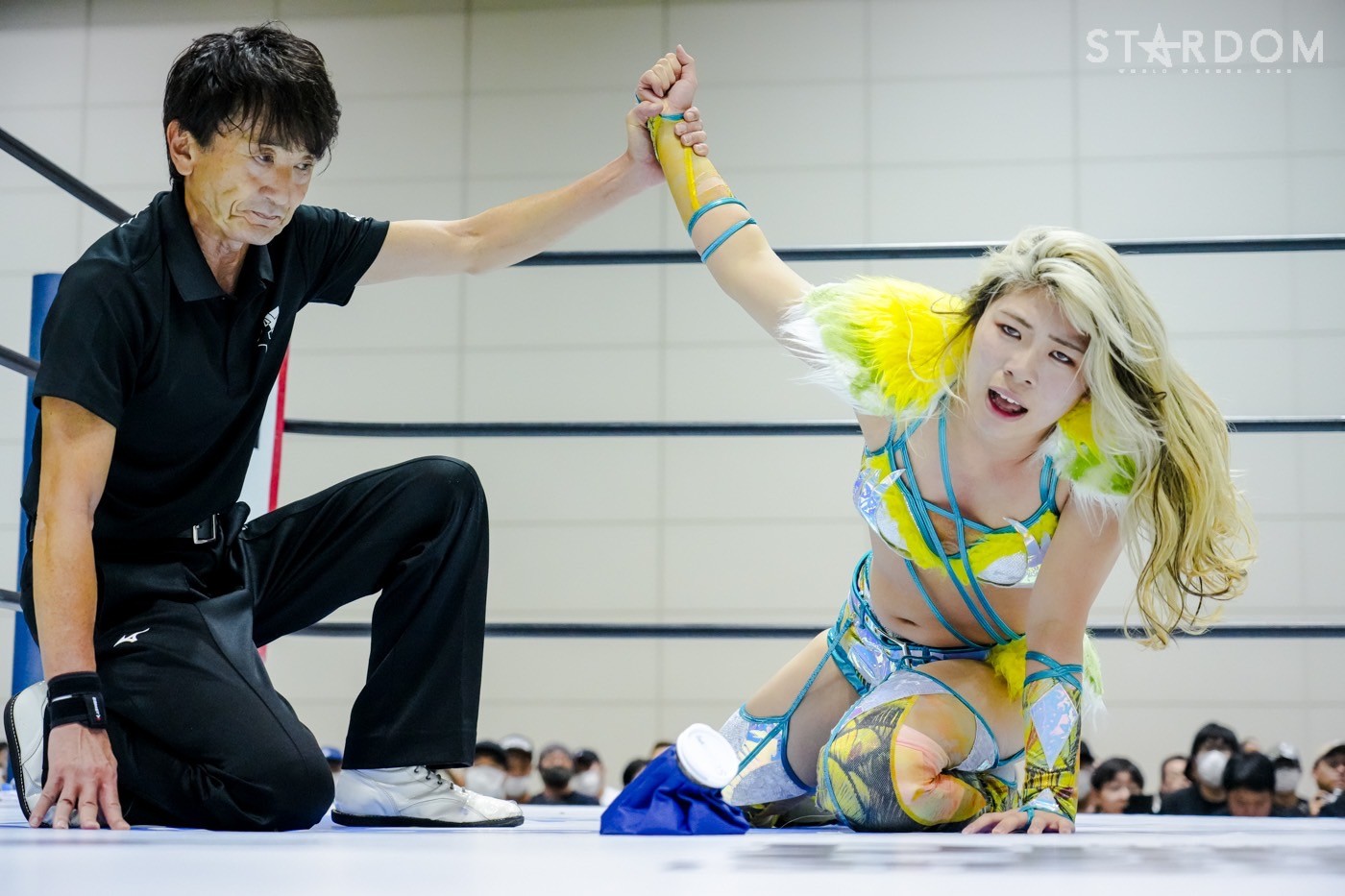 「ギリギリ、ギリギリ3カウント取りました。これで10点。今日で10点。首位? 1位ですか? 1位? 予選1位? マジか、うれしい。この前の星来芽依との試合でめっち ゃ首が痛くて今日は押さえ込むのに必死で。メンタル的にちょっときつい闘いだったけど、1位だよ。予選1位。あとはもうあれするから。優勝して、王冠とマント被って、アイツをIWGP(女子)のベルトに逆指名したいと思うので、期待してみなさん楽しみにしててください」