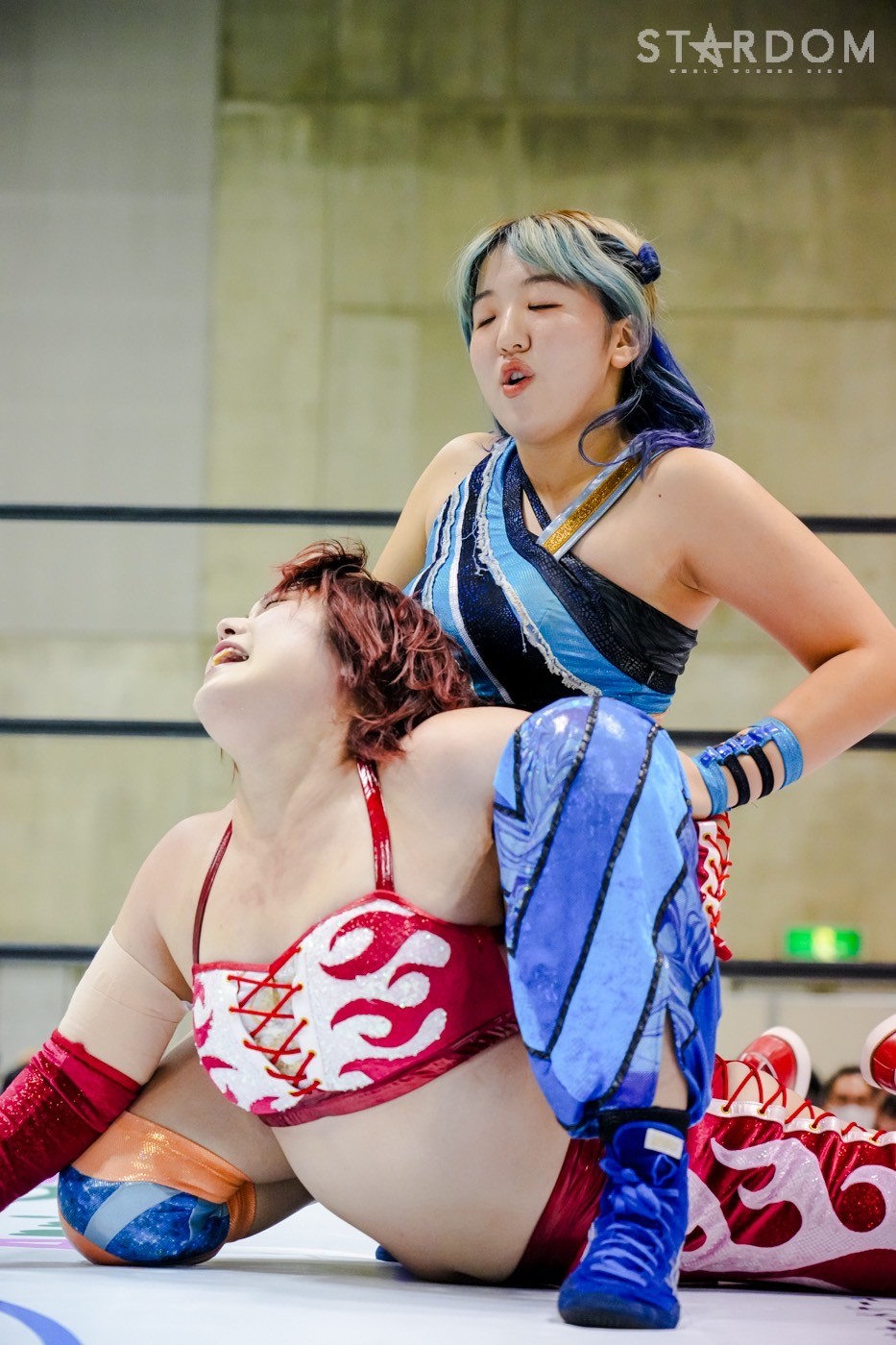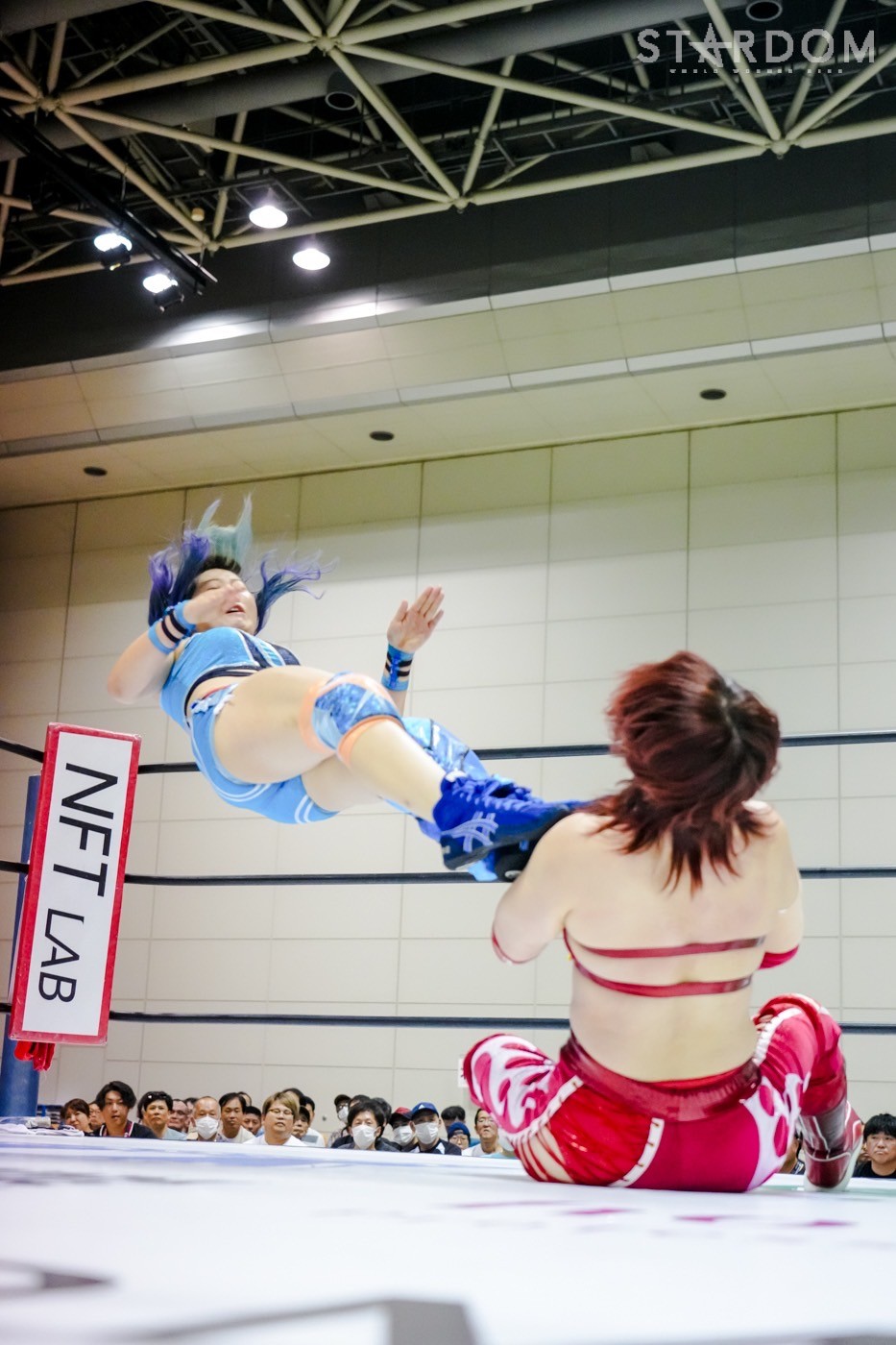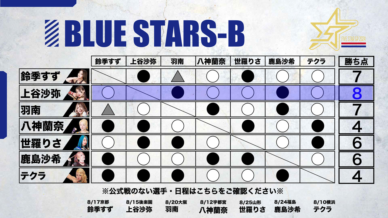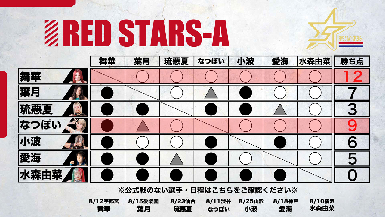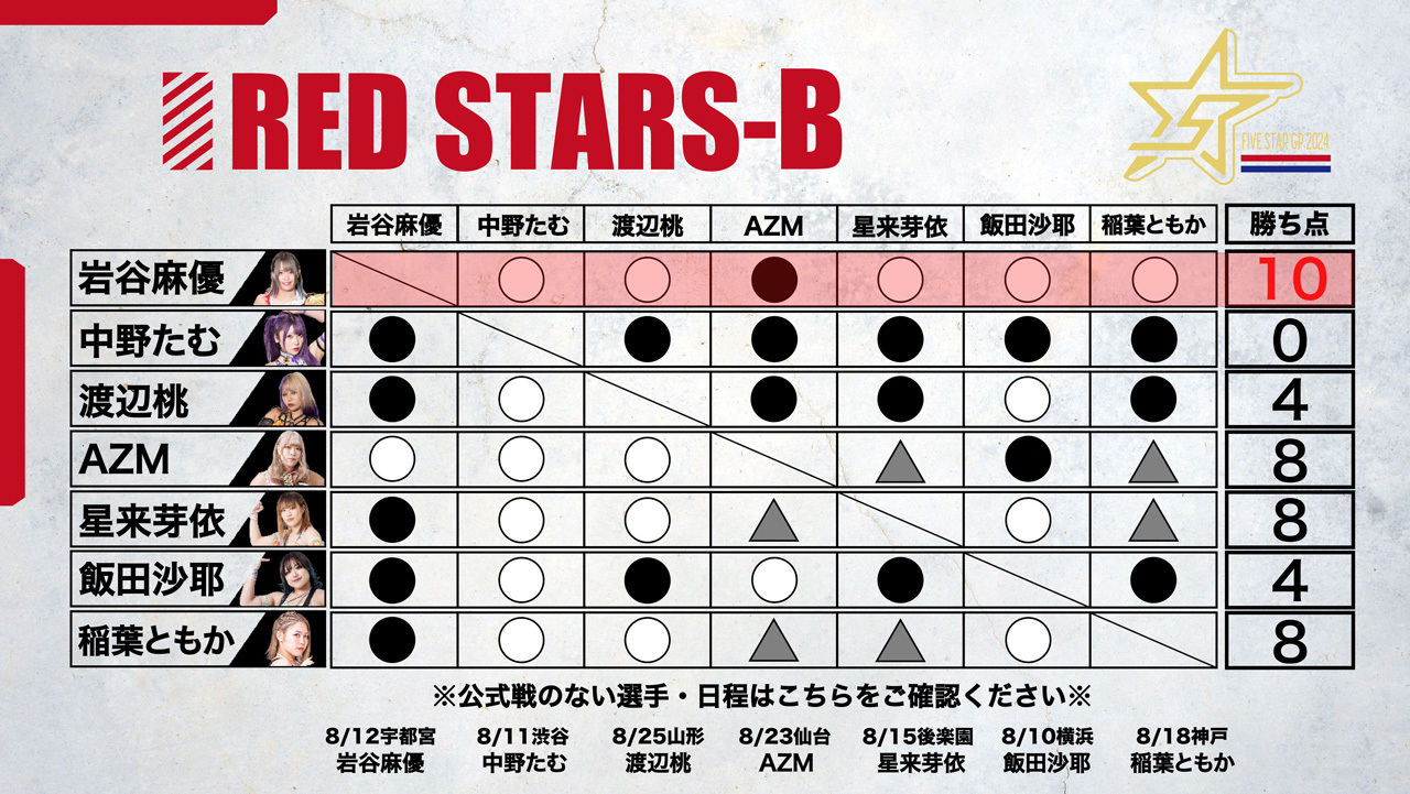 星来が蹴りを入れ、ともに振り合う。ロープワークから星来がクロスボディー。中野の蹴りをかわした星来だがドロップキックをかわされる。視殺戦から星来が握手を要請。中野は慎重に応じるが星来が足を踏む。中野が寸前でかわして「大人をなめんなよ」と串刺しエルボーアタック。前後から蹴りを入れてカカト落とし。星来が返すと、中野がコーナーで宙吊りスリーパー、ダイビングボディーアタック。中野が星来のドロップキックをかわしてドロップキック。星来がドロップキックを決めて中野が場外転落。星来がコーナーに駆け上がると中野が追いついてコーナー上でエルボー連打。カカト落としを星来が止めてレッグブリーカー、中野が転落。星来は左脚をエプロンに乗せてフットスタンプ。星来が中野をリングに戻してレッグロック。中野がなんとかエスケープに成功。星来が左脚をロープにかけてドロップキックを連打。ロープに振られた中野が転倒。エルボーの打ち合いから星来がフェイントをかけて足を踏む。星来がドロップキックも、中野がこらえてバックドロップ。中野の突進をかわし星来がジャーマン。中野もジャーマン。丸め込みの応酬から中野がジャーマン。中野がタイガーの構え、星来が切り返すが中野がスピンキック。星来がドロップキック。中野がスピンキック、星来がヒザへドロップキック、スタンディングヒールホールド。中野がかわすと星来が丸め込みの連続。中野が丸め込むも星来が返す。中野の突進に星来がドロップキック、変型弓矢固めから両腕を取り、ドラゴンスリーパーに移行。レフェリーがゴングを要請し星来の勝利となった。この結果、レッドスターズBブロックは稲葉ともか、星来、AZMが並び、直接対決でも引き分けのため、8・28新宿で決勝トーナメント進出をかける巴戦をおこなうことになった。