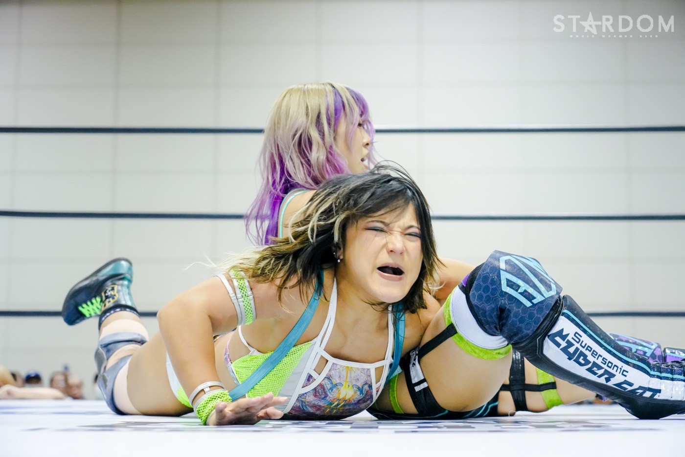 天咲がヒザにドロップキック、DDT、背後からドロップキックの奇襲攻撃。朱里が串刺しニーアタックを連発も2カウント。朱里はスリーパーに捕らえるが、天咲がロープへ。