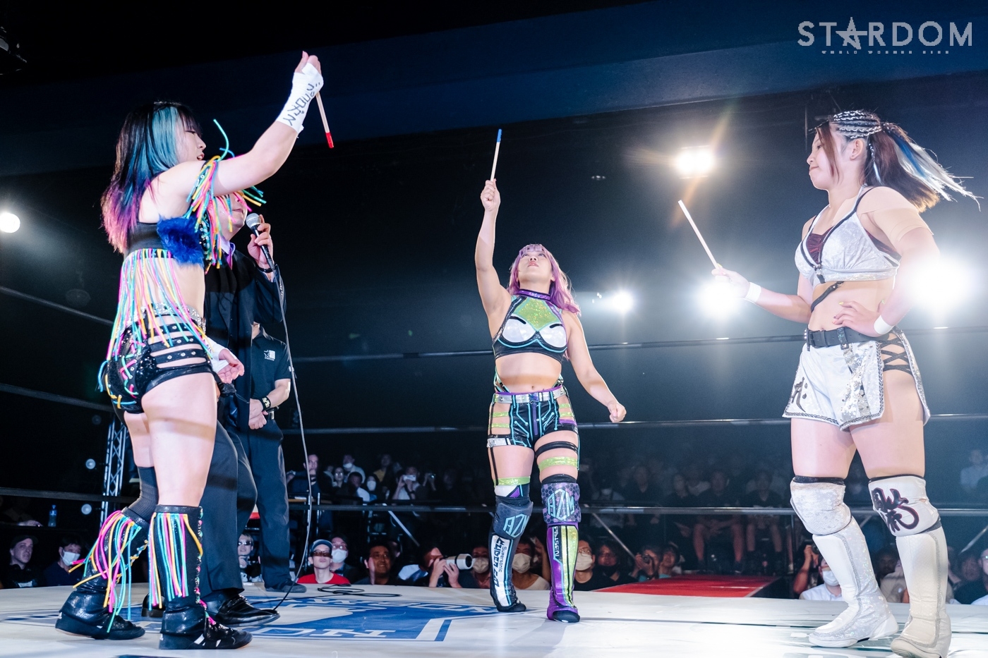 ナツコと中野が先発。リング中オデ睨み合いナツコが突き飛ばす。中野はエルボーを叩き込み。ナツコもやり返す。エルボーの応酬中野が連打し突進、ナツコが足をすくい吏南と合体ボディープレス。妃南がカットすると吏南が捕まえナツコと合体。妃南は吏南を払い腰。中野のアシストを得てナツコにも決める。中野が場外へプランチャで飛ぶがかわされてしまう。ナツコが中野を客席に叩きつける。14カウントで中野を戻すと、ナツコが左ヒザにエルボードロップを連発。吏南は左ヒザにニークラッシャー、ロープ際で踏みつけると中野が悲鳴を上げる。中野に走らせず持ち上げようとした吏南だが、切り返されてネックブリーカーを食らう。妃南が吏南に串刺しニーアタック、ドロップキック。吏南が返すとビッグブーツ、ドロップキック。妃南が返すと、卍固めを切り返し大外刈り。妃南がカウンターで払い腰。髪をつかみ合い、妃南がエルボー連打、吏南が髪を引いて倒すとノーザン狙い。妃南が切り返すがビッグブーツを食らう、妃南が先を読んでネックブリーカー。吏南がノーザンライト、妃南が変型ロックボトム。中野がタッチを要請し、ナツコにドロップキック。ナツコがニーをかわしブレーンバスター。中野が返すと、ナツコが足をロック、慌てて中野がロープに逃れる。中野がバックを取るがナツコがラリアット。ダイビングボディースラムは中野がかわしてバイオレットシューティング。10分経過。中野がコーナーに上がるがナツコがかわしてイスで殴打。妃南がカットし中野がトラースキック、スピンキック、タイガースープレックス。しかし吏南がカットする。中野がバイオレットシューティングにいくがナツコがイスを投げつけ脚をロック。中野がなんとかエスケープに成功。ナツコはフィニッシュを宣言して突進、中野がイスを投げつけスピンキック。ナツコがこらえてラリアット。中野が返すと、吏南がナツコとの合体を要請しバックドロップ。吏南がダイビングダブルニードロップ。ナツコがスワントーンボム。デスバレーボム狙い。中野が切り返して丸め込むと3カウントが入った。