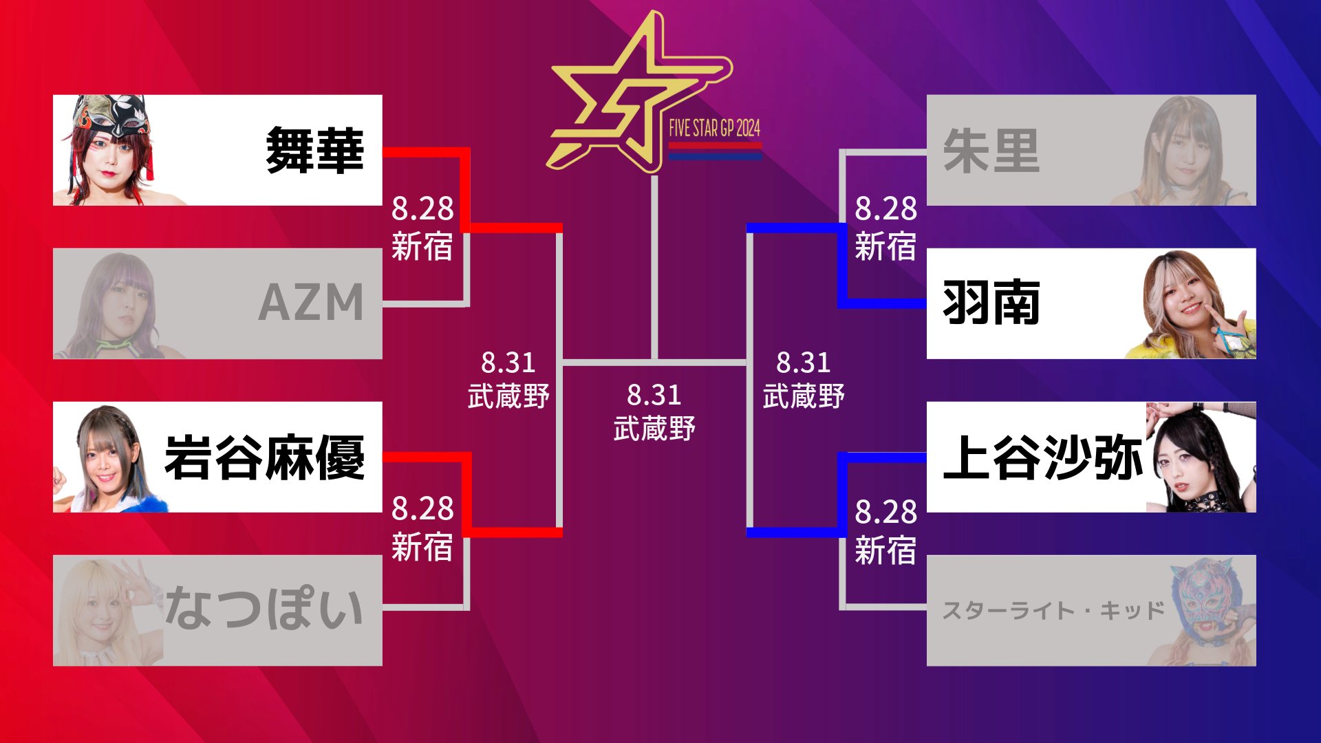 5★STAR GP優勝者が決まる8・31調布で、ワールド・オブ・スターダム王座とフューチャー・オブ・スターダム王座のタイトルマッチもおこなわれる。今大会では2大タイトル戦に向けて最後の前哨戦。赤いベルトを争う刀羅ナツコと中野たむ、フューチャーの防衛新記録がかかる吏南と妃南。中野は妃南と、ナツコは吏南とのH.A.T.E.で臨む。