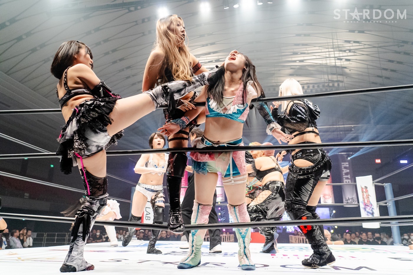 コール時に朱里と小波がロープ際でつかみ合い。テクラが朱里を突き落とし、場外戦で試合がスタートする。桃が鹿島をリングに入れて押さえ込む。鹿島が返すと桃がヘアーホイップ、コーナーに追い詰め顔面を踏みつける。そこに小波が髪を引いて加勢する。桃が挑発しながらエルボー連打。テクラが鹿島に串刺しエルボーアタック、後頭部に蹴りを叩き込むとインディアンデスロック、鎌固め。しかし、ゴッズアイがカットに入る。顔面を蹴られた鹿島が「なめんな!」と向かっていく。テクラが「もっとこい」と挑発。鹿島がカウンターのトラースキック。レディがショルダータックルをテクラに連打。小波がカットしテクラと合体を試みる。しかしレディが鉢合わせにして、まとめてコブラツイスト。テクラがエスケープするが、レディはまとめて逆水平、まとめてネックブリーカー。朱里が串刺しニーからフロントネックチャンスリー。テクラが返すと朱里がニー連打、テクラがスピア。桃がテクラと合体、桃がPK。朱里が返して、ミドルキックを桃と打ち合う。桃の突進を読んで、朱里がニー。朱里がコーナーに上がると小波がカットして桃がデッドリードライブ、蒼魔刀。朱里が返して丸め込みからジャーマン。桃が投げっぱなしドラゴン、朱里がハイキックで両者ダウン。替わった小波と鹿島がエルボーの応酬。鹿島の突進をかわし小波が腕固め。テクラと小波が合体して朱里と鹿島にぶら下がり腕十字の競演。H.A.T.E.が次々と鹿島に串刺し攻撃、小波がPK。返した鹿島が小波にハイキック。鹿島が打撃の連続も小波が返す。10分経過。鹿島がダブルアームの体勢、小波が切り返し突進すると朱里とレディが鹿島を援護、鹿島と朱里がキックの競演、鹿島がダブルアーム式フェースバスター。乱戦から朱里のニーがかわされレフェリーに誤爆。鹿島が小波に起死回生もレフェリーが不在。桃がバットで鹿島を殴打し小波がジャーマン。しかし、朱里のカットが間に合う。小波が鹿島にパントキック、バズソーキック。鹿島が返せず小波の勝利となった。