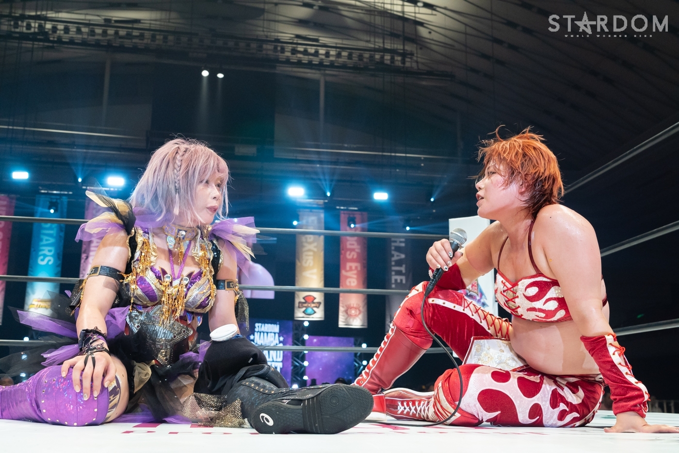 岩谷「大阪のみなさん、こんばんはー! はぁ~、すごい、すごい。すごいことになりましたね。トニー・ストーム? ちょっとゴメン、目が悪くてさ、何月何日って言ってました? 名古屋? 9月? 10月? 10月の名古屋、何日ですか? 5! 改めまして10月5日、名古屋大会、自分は名古屋で赤いベルトのチャンピオンだったときに、2分30秒でケガしてヒジ脱臼して、トニーにベルトを獲られました。10月5日、名古屋、自分のトラウマも乗り越えてトニー・ストーム…完全にスターダムのアイコンである岩谷麻優が勝って、このベルト防衛しますんで応援よろしくお願いします! AZM、このベルトは誰の挑戦でも、いつなんどきでも受ける。けど、トニー・ストームに勝ってくるから、ちょっと待ってて。AZMに誓うから、いや、ここにいる会場の、PPVをご覧のみなさんも、世界中にもIWGPの真のチャンピオンは岩谷麻優であることを誓います。応援よろしくお願いします!」