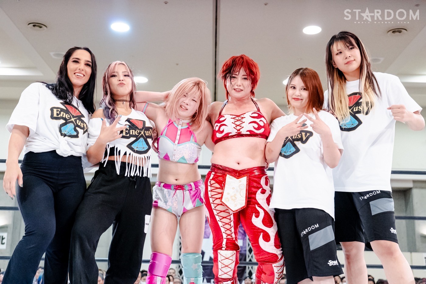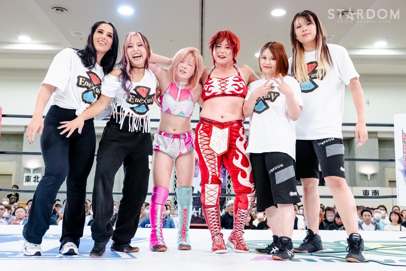 舞華「ってことなんですけど、みなさんどうですか!? そういうことなのでE neXus Vのみんな、ちょっとリングにいいですか?」