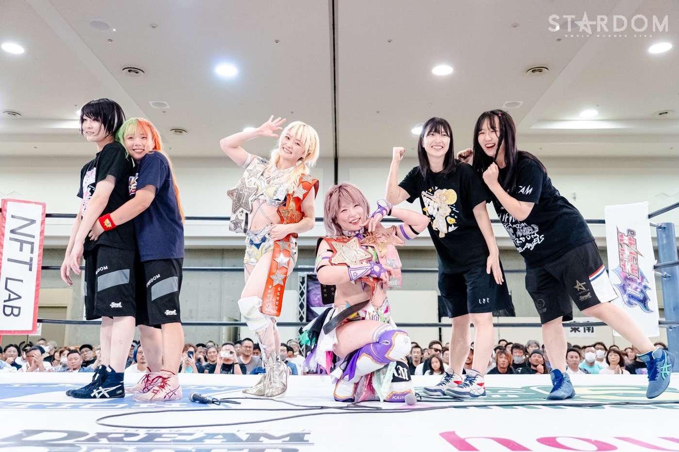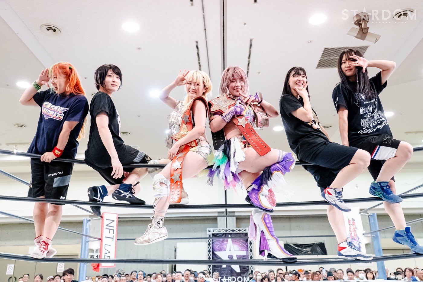 中野「いっぱい防衛して、またチャンピオンとしてこの場所に戻ってくるので、そのときまでみなさん待っていてください! コズエンのみんなリングに上がって。レディースエンドジェントルメーン、メイアイハブアテンションプリーズ、ウェルカムアボード。コズミックエンジェルズ! 本日の搭乗員を紹介します。くらら、さくら、ゆなもん、サオリ、なつぽい、たむ。ウイーアーナンバーワン、ウィーアーザベスト、ウィーアースーパーデリシャース。私たちもアナタたちも、デリシャース、ウ~~ンマ!」