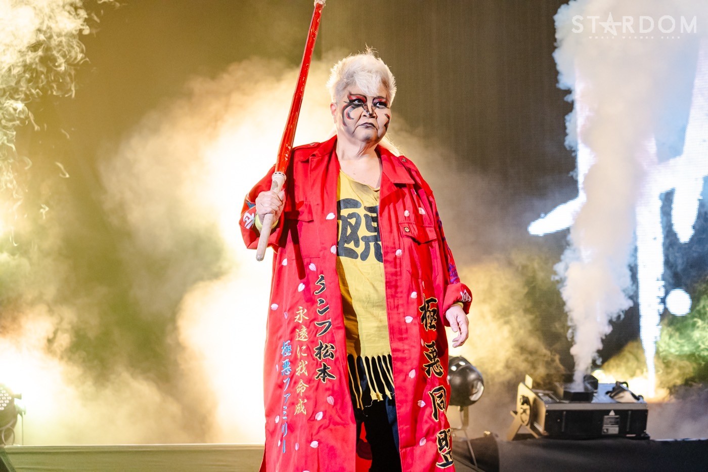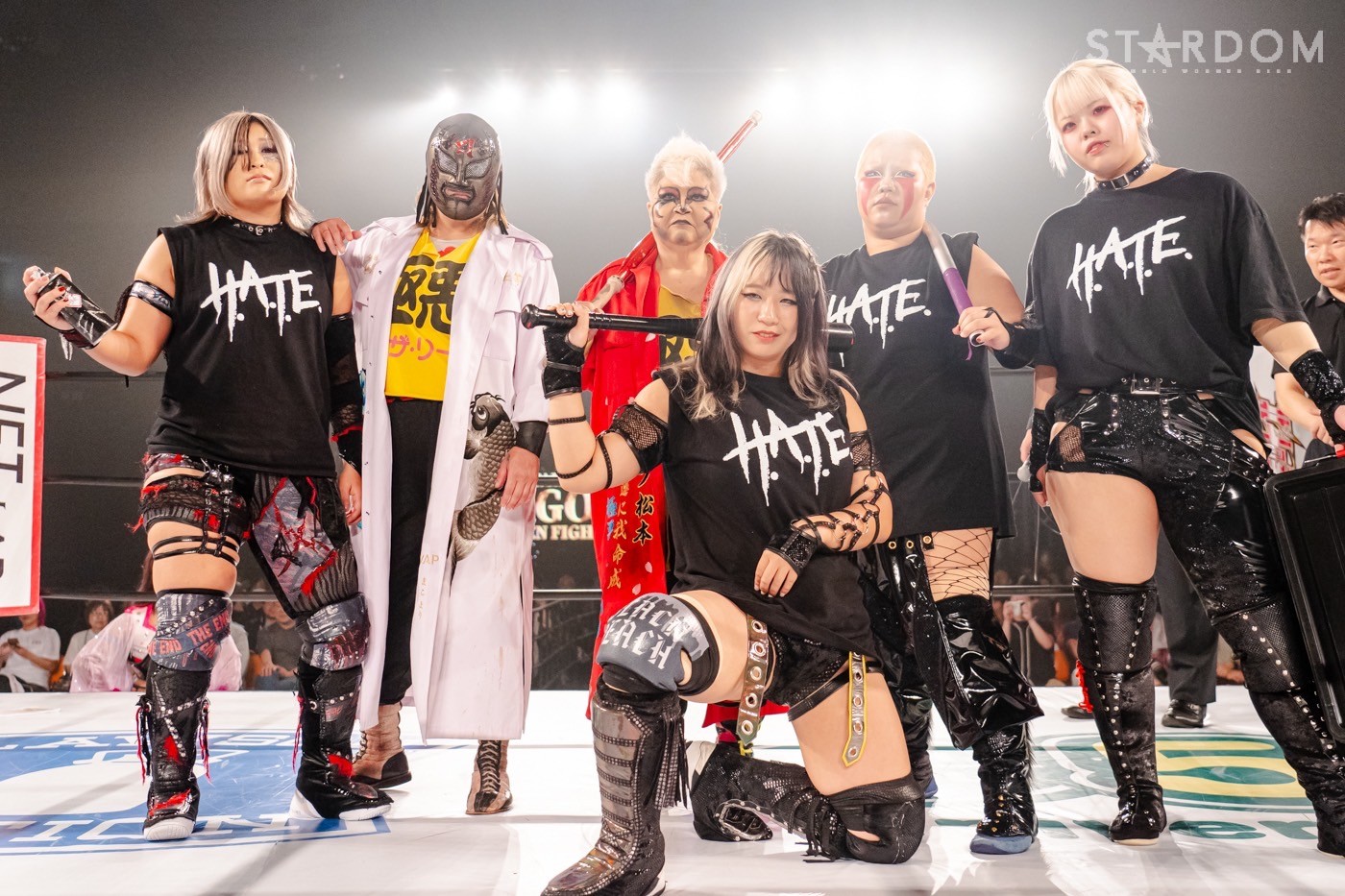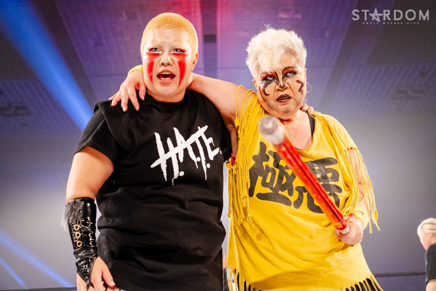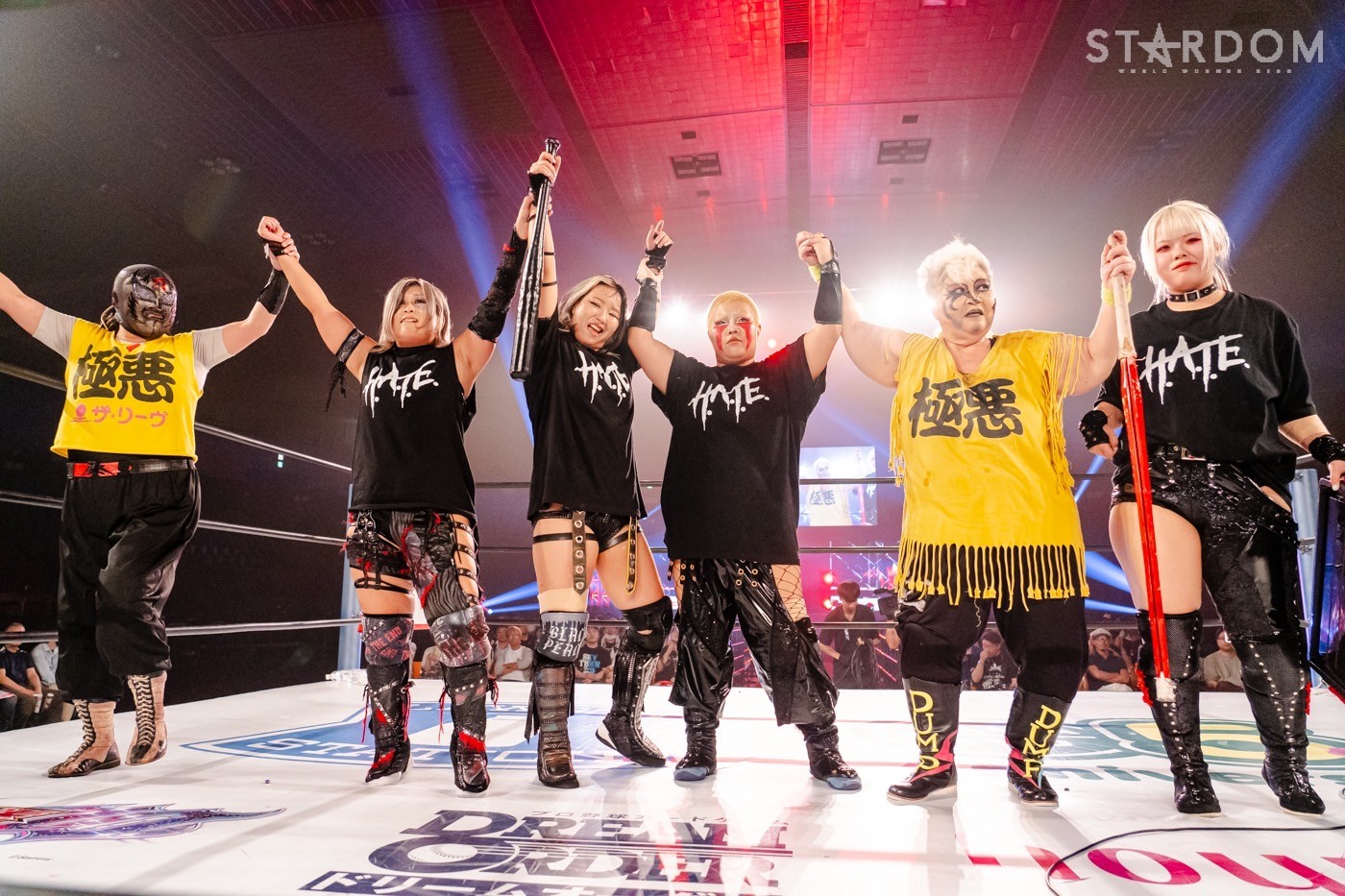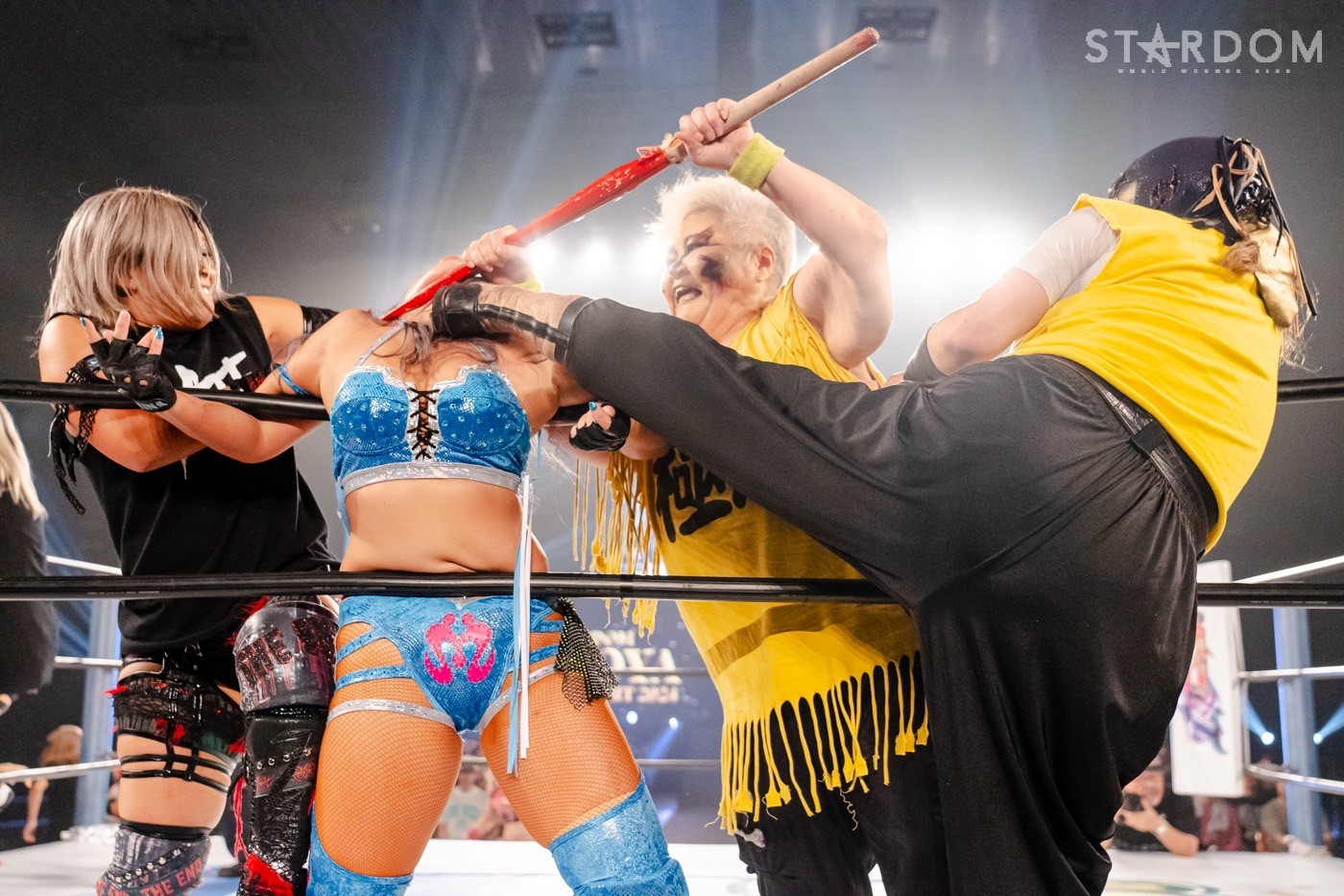 スターダムに“極悪女王”ダンプ松本が3度目の降臨、刀羅ナツコ率いるH.A.T.E.と合体し、E neXus Vと全面対決をおこなう。EXVは舞華&白川未奈&ジーナ&月山和香&HANAKO&梨杏組で、H.A.T.E.&極悪同盟連合軍はダンプ松本&ZAP&刀羅ナツコ&渡辺桃&小波&琉悪夏組という布陣。大荒れ必至のリングでサバイブするのはどちらか?