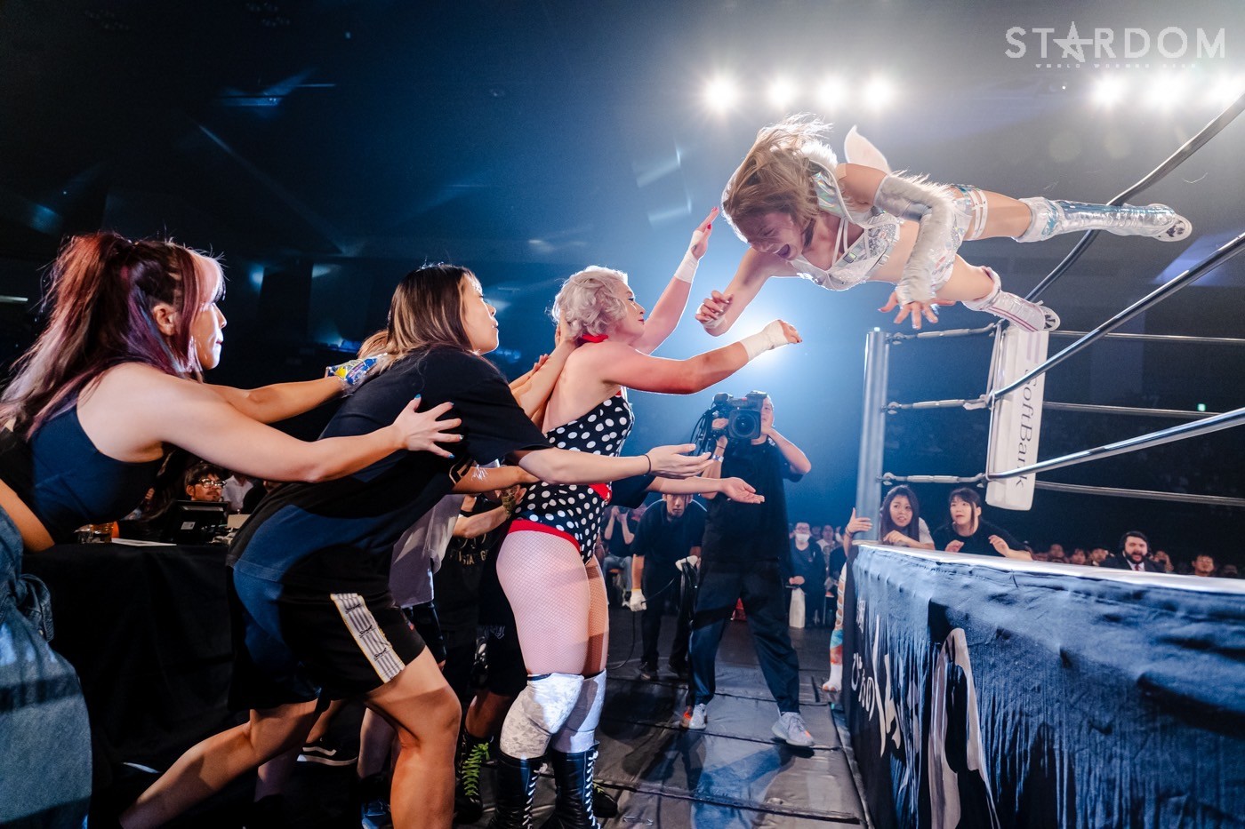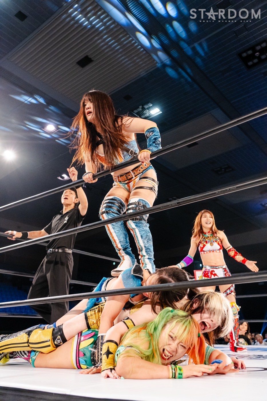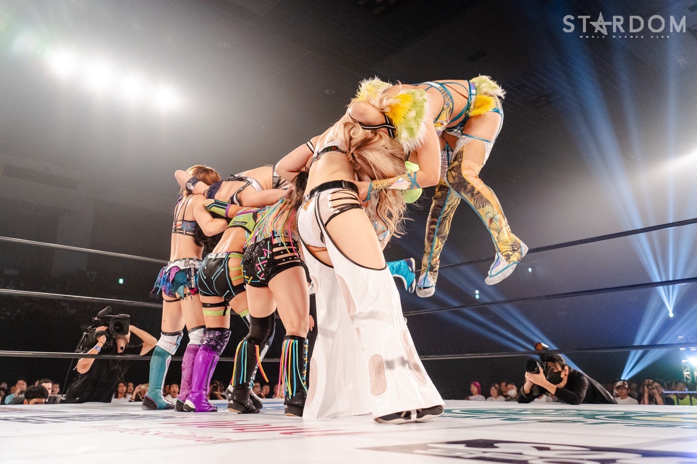 安納、朱里、AZM、羽南の先発でスタート。慎重に探り合い手四つの構え。朱里がハイキックにいくと全員がよけてAZMが捕まる。AZMがエプロンに出されるが、朱里とドロップキックの競演。朱里とAZMのハイが羽南と安納にかわされる。レディがさくらにビッグブーツ、さくらがかわし星来がロープワークを仕掛け、飯田とレディにミサイルキック。星来はさくらにブレーンバスターの構え。AZMがカットすると、安納もカット。飯田、レディ、羽南、朱里も加わりブレーンバスターの掛け合い。朱里が抜け出しミドルキック、レディサイドがブレーンバスターに成功する、レディは星来を受け止めてジャイアントスイング12回転。レディとさくらが共闘し飯田を捕獲。しかし飯田が全員を蹴散らし、羽南までにもチョップを放つ。飯田とレディがチョップの応酬。そこに安納とAZMがミサイルキックを叩き込む。安納とAZMがエルボーの応酬。安納の突進をAZMがかわしてブレーンバスター。安納が返すと、AZMが回転足折り固め。安納が返してジャーマン。AZMが返すと安納はコーナーへ。AZMが上がってエルボーを打ち合うと、飯田がまとめて雪崩式狙い。レディが加わり、まとめてパワーボム。レディは安納とAZMにチョークスラム狙い。こらえられると、飯田がカットもレディがチョークスラムを決める。羽南と星来がエルボーの打ち合い。朱里とさくらが入って分断すると、さくらが朱里にドロップキック。羽南がさくらにエルボーも星来がカット、朱里が星来にニー、ブレーンバスター。朱里が星来にミドルキック。朱里とさくらがクローズラインも、羽南と飯田がダブルチョップの競演。星来とAZMがかわして、羽南と飯田にドロップキックの挟み撃ち。