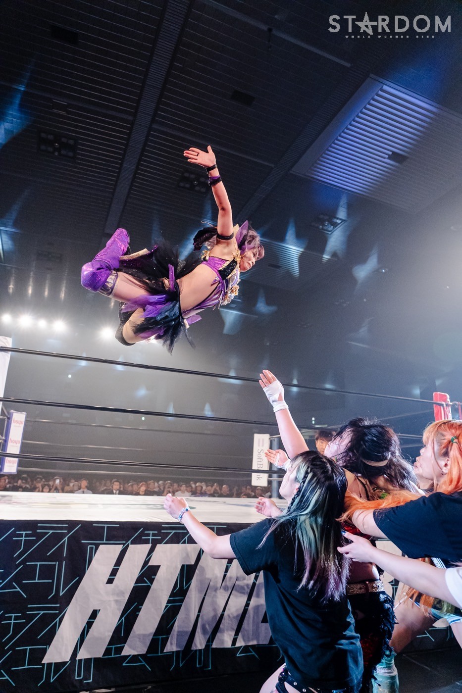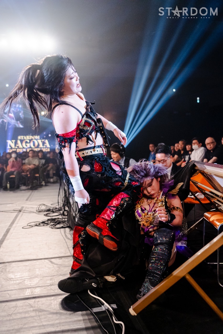 中野「(倒れた状態で)『頑張れ』って言って…。うふふふ。宇宙のみなさん、オ~ッス!名古屋ドルフィンズアリーナのみなさん、こんにちは! オッス。オッスだよ、オッス。今日も本当に長い時間、私たちと一緒に闘ってくれて、本当にありがとうございました! ありがとう。みなさんの温かい声援と、調子出てきたブーイングのおかげで私たちは本当に勇気がみなぎってきます。これからも一緒にスターダムを大きくしていきましょう。よろしくお願いします! いろいろ不安にさせちゃったりとか、なんだろイヤな気持ち? なんていうの? ミスしちゃったりとかするかもしれないけど、でもいままでも信じてよかったって思えてきたでしょ? だから信じてくれて大丈夫です。最後にみんなの声聞かせてもらっていいですか? 宇宙にきらめく、たむロードについてこい、ビリーブ・イン・たむ! ありがと」