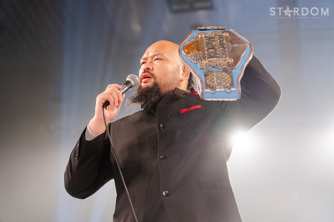 「ひれ伏せスターダムの愚民ども! 今宵この余が、プロレスキャリア最大のチャンスを恵みに来てやった。11月17日、エディオンアリーナ大阪のクロスオーバー、そこでこのKOPWを懸けて、スターダムの女と闘ってやるよ、オイ。このKOPWは世界でイチバン自由なベルトだ。男と女がベルトを懸けて闘うことができる。ルールも自由だ。そうだな、たとえば女だけ武器を使ってもいいぞ。女だけ多人数タッグを組んでもいいぞ? なぁ、どんなルールでこようが、この余が女ごときに負けるわけはねーがな! それでもだ、歴史に名を残したい者は名乗りをあげろ。ただしプロレスキャリア最大の痛みと屈辱を味わうことになるがな!」