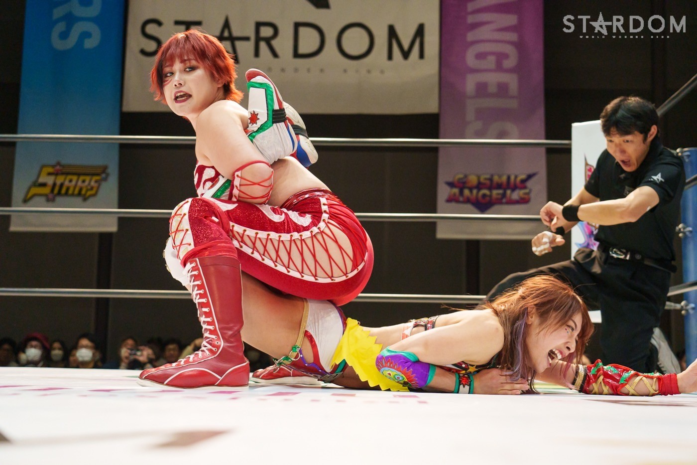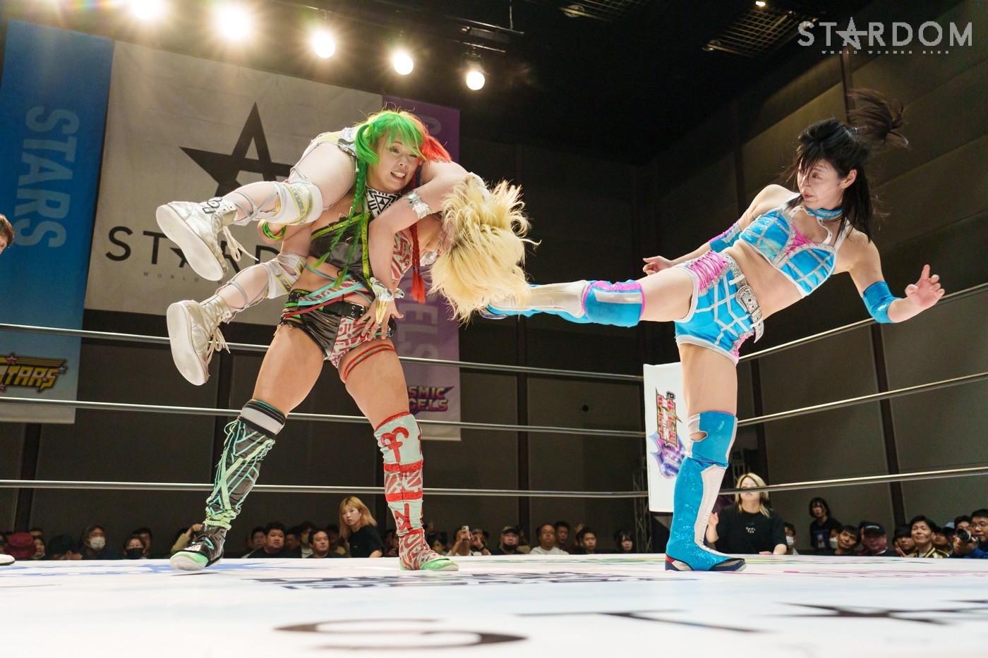 梨杏が返すと、朱里の突進をかわしてコルバタからドロップキック。朱里が梨杏の動きを読んでニーアタックから逆エビ固め。しかし背後から白川が忍び寄りサッカーボールキックでカットする。朱里と鈴季が合体を試みるが白川がまとめてネックブリーカー、梨杏が丸め込むがカットされる。白川が梨杏に託し、鈴季と場外へ。梨杏は朱里にフィッシャーマン狙い。切り返した朱里が逆片エビ固め。梨杏がなんとかエスケープに成功。朱里はフィニッシュを宣言し流炎の構え。梨杏が切り返して丸め込む。朱里が返すとニーアタック。梨杏が返すと朱里はサソリ固め。