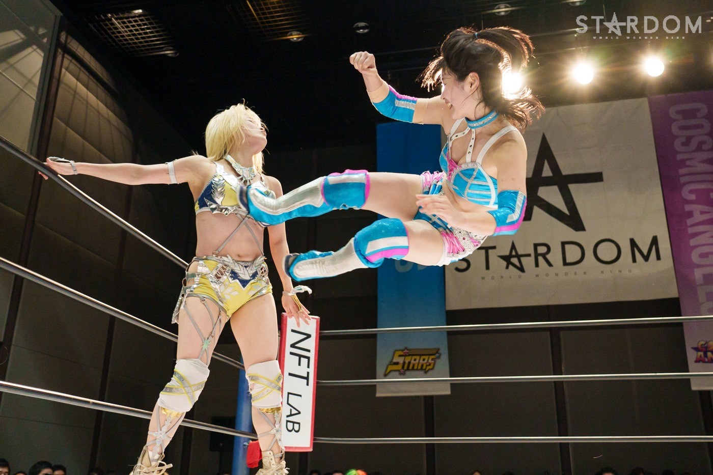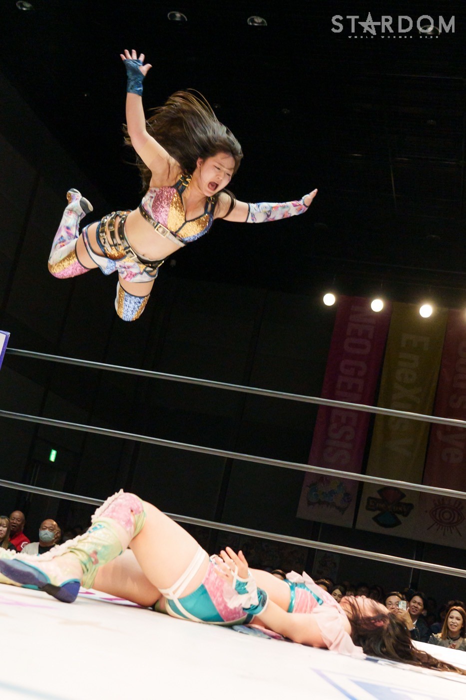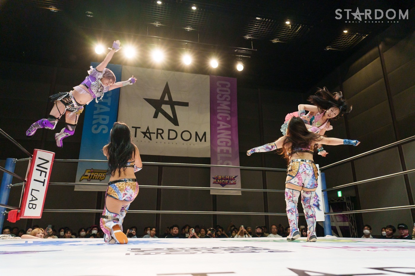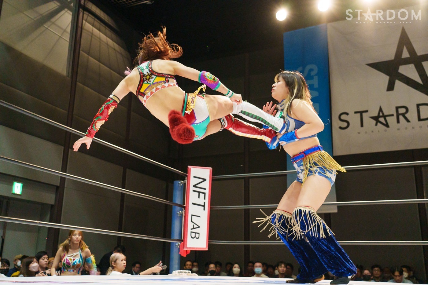 STARSの岩谷麻優&向後桃組とE neXus Vの舞華&HANAKO組によるタッグリーグ公式戦。岩谷&向後は開幕戦白星も2戦目で星を落とし1勝1敗。ここで勝って白星を重ねていきたいところだろう。対する舞華&HANAKO組は白星スタートでこれが2戦目。舞華は5★STAR GPに引き続き全勝での優勝を宣言しているが…。