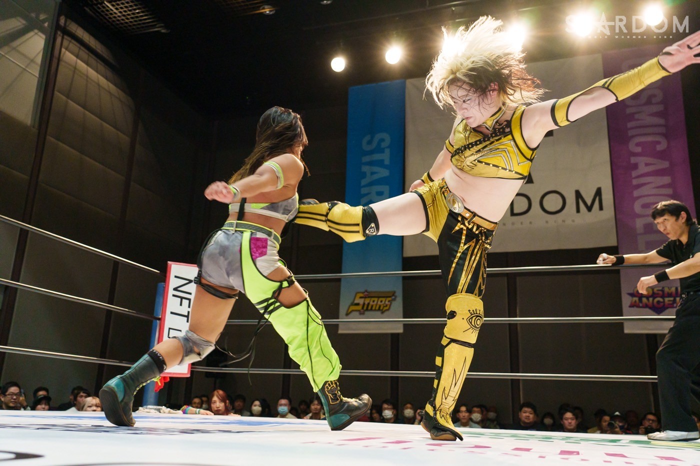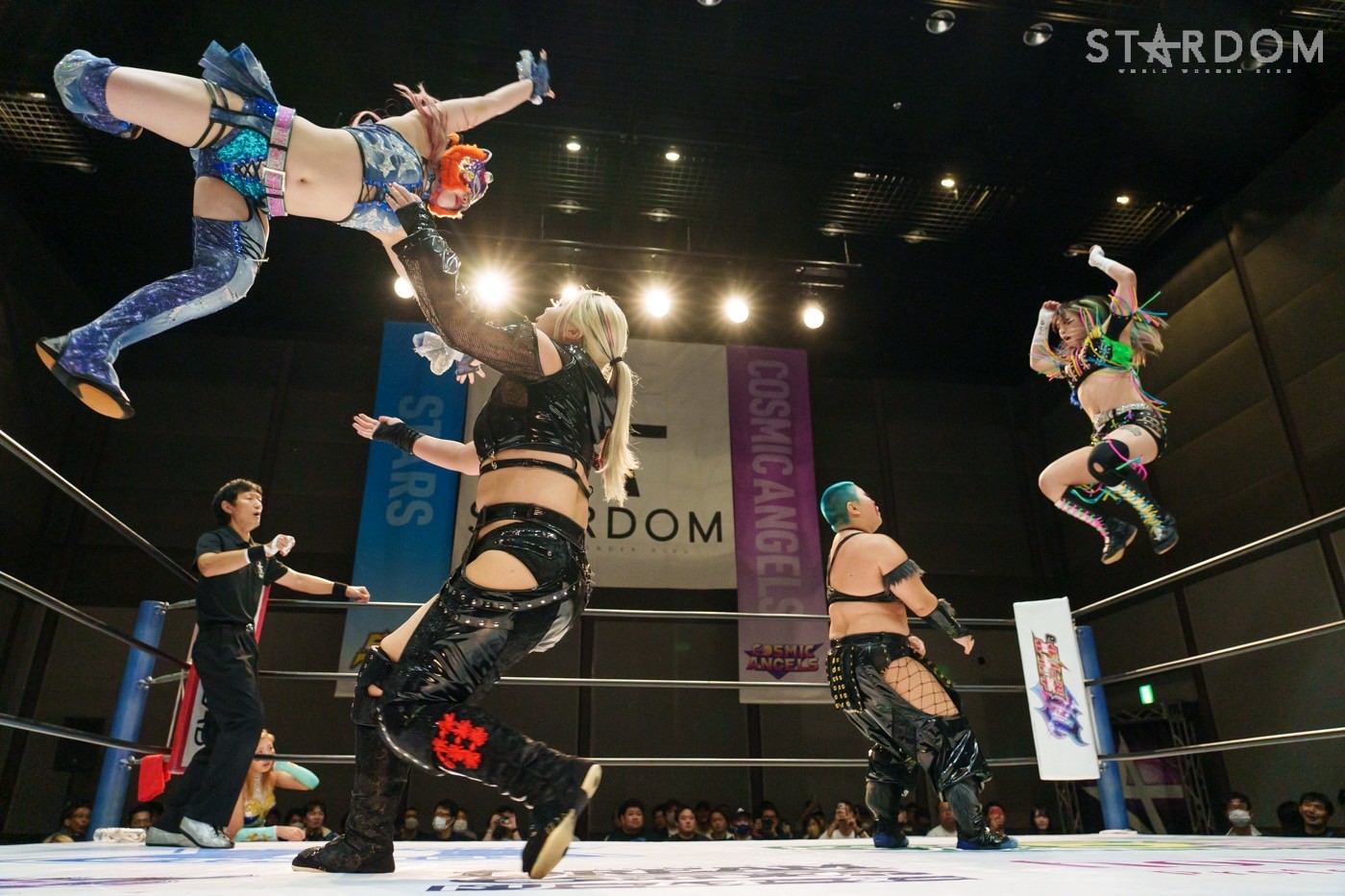 STARSの葉月&コグマ組とコズミックエンジェルズの中野たむ&玖麗さやか組によるタッグリーグ公式戦。葉月&コグマ組は1勝1敗で、中野&玖麗組は初戦。タッグのエキスパートにニュータッグチームがどんな闘いを挑むか。中野&玖麗組の可能性を探る試合となりそうだ。