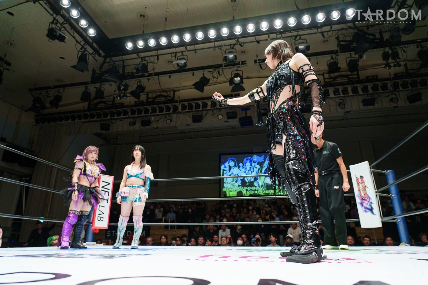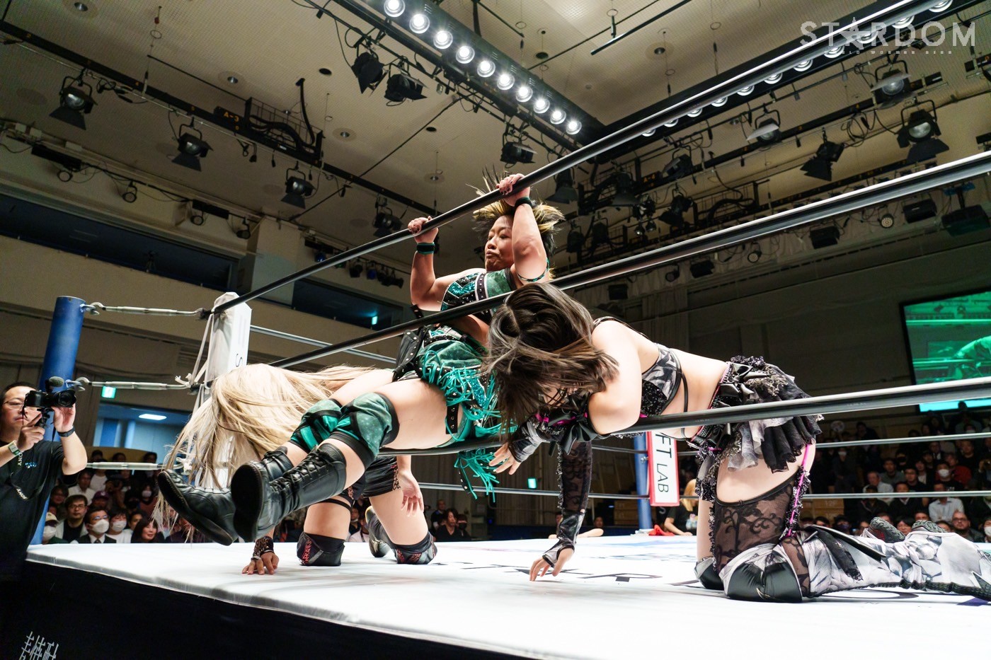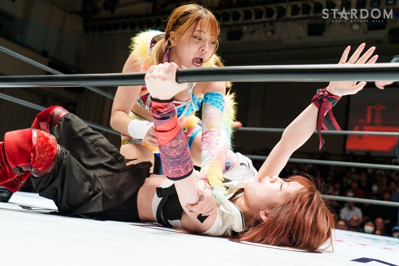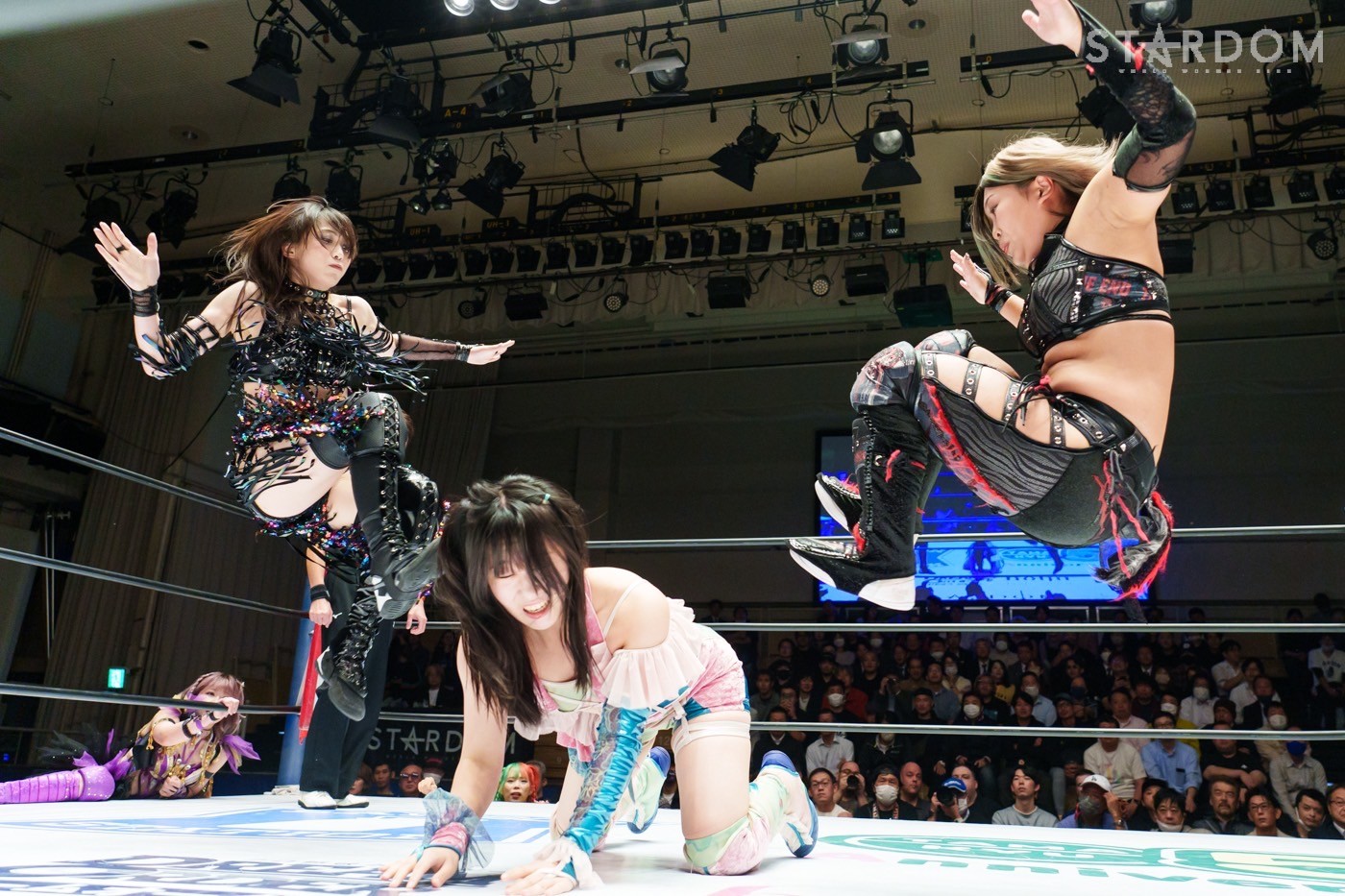 梨杏が先発に立候補し、キッドと対峙。ロックアップで組み合い、キッドが押し込んでチョップ。キッドが走ると月山が介入しダブルでヒップアタック。月山と梨杏が合体するがキッドと鈴季がカウンターでエルボー、エプロンに出して左右からドロップキックの挟み撃ち。キッドが梨杏、鈴季が月山にその場跳びムーンサルト。キッドが梨杏に逆エビ固め。鈴季が梨杏に串刺しエルボー、串刺しニー。梨杏が返してエルボー連打で向かっていく。鈴季が受けて立ち、ドロップックで吹っ飛ばす。梨杏がラリアットをかわしてクロスボディー。月山が鈴季にヒップアタック連打、串刺しヒップアタック、クロスボディー。月山の突進を読んで鈴季がスピア。キッドが月山に619,ヒザへのドロップキックを連発し、ニークラッシャー。月山がカウンターのクロスボディー、梨杏と串刺しエルボーで合体、月山の地獄突きから梨杏がクロスボディー。月山は極楽ドン狙い。キッドがこらえて鈴季がトラースキック、キッドがフィッシャーマン連打。しかし、梨杏がカットする。キッドは月山へストレッチマフラー。月山がエスケープすると、キッドがヒザへのドロップキック。月山がエルボー連打、キッドがドロップキック。黒虎天罰を切り返して月山がオースイ。梨杏がキッドにフェースクラッシャー、月山と合体でマットに叩きつける。キッドが返すと、月山はコーナーからミサイルキック。しかし、キッドが返してみせる。月山はカバーの連続。キッドがしのいで、月山の突進を鈴季が止めてキッドがフェースクラッシャー。キッドがストレッチマフラーも、梨杏がカット。鈴季が梨杏を捕獲、キッドが黒虎脚殺に移行すると月山がギブアップした。