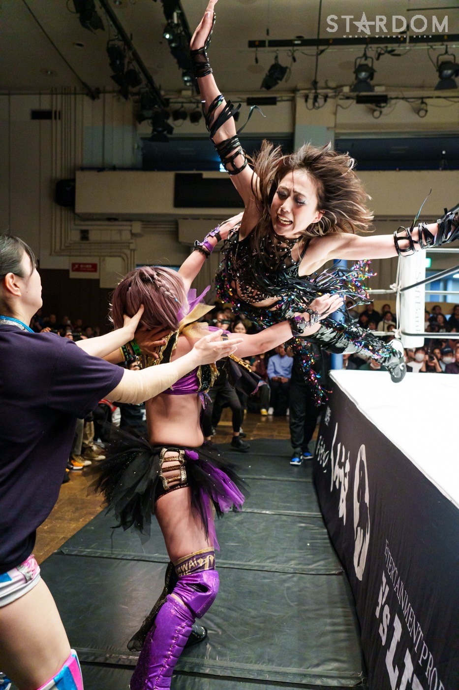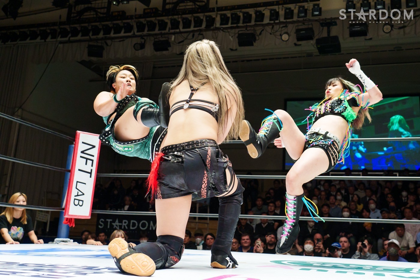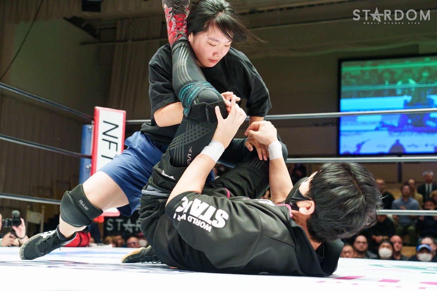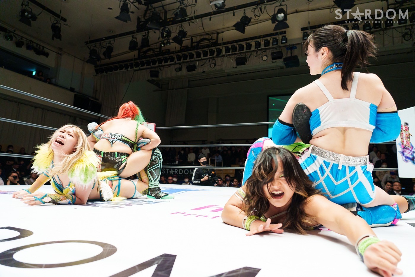 梨杏が先発に立候補し、キッドと対峙。ロックアップで組み合い、キッドが押し込んでチョップ。キッドが走ると月山が介入しダブルでヒップアタック。月山と梨杏が合体するがキッドと鈴季がカウンターでエルボー、エプロンに出して左右からドロップキックの挟み撃ち。キッドが梨杏、鈴季が月山にその場跳びムーンサルト。キッドが梨杏に逆エビ固め。鈴季が梨杏に串刺しエルボー、串刺しニー。梨杏が返してエルボー連打で向かっていく。鈴季が受けて立ち、ドロップックで吹っ飛ばす。梨杏がラリアットをかわしてクロスボディー。月山が鈴季にヒップアタック連打、串刺しヒップアタック、クロスボディー。月山の突進を読んで鈴季がスピア。キッドが月山に619,ヒザへのドロップキックを連発し、ニークラッシャー。月山がカウンターのクロスボディー、梨杏と串刺しエルボーで合体、月山の地獄突きから梨杏がクロスボディー。月山は極楽ドン狙い。キッドがこらえて鈴季がトラースキック、キッドがフィッシャーマン連打。しかし、梨杏がカットする。キッドは月山へストレッチマフラー。月山がエスケープすると、キッドがヒザへのドロップキック。月山がエルボー連打、キッドがドロップキック。黒虎天罰を切り返して月山がオースイ。梨杏がキッドにフェースクラッシャー、月山と合体でマットに叩きつける。キッドが返すと、月山はコーナーからミサイルキック。しかし、キッドが返してみせる。月山はカバーの連続。キッドがしのいで、月山の突進を鈴季が止めてキッドがフェースクラッシャー。キッドがストレッチマフラーも、梨杏がカット。鈴季が梨杏を捕獲、キッドが黒虎脚殺に移行すると月山がギブアップした。