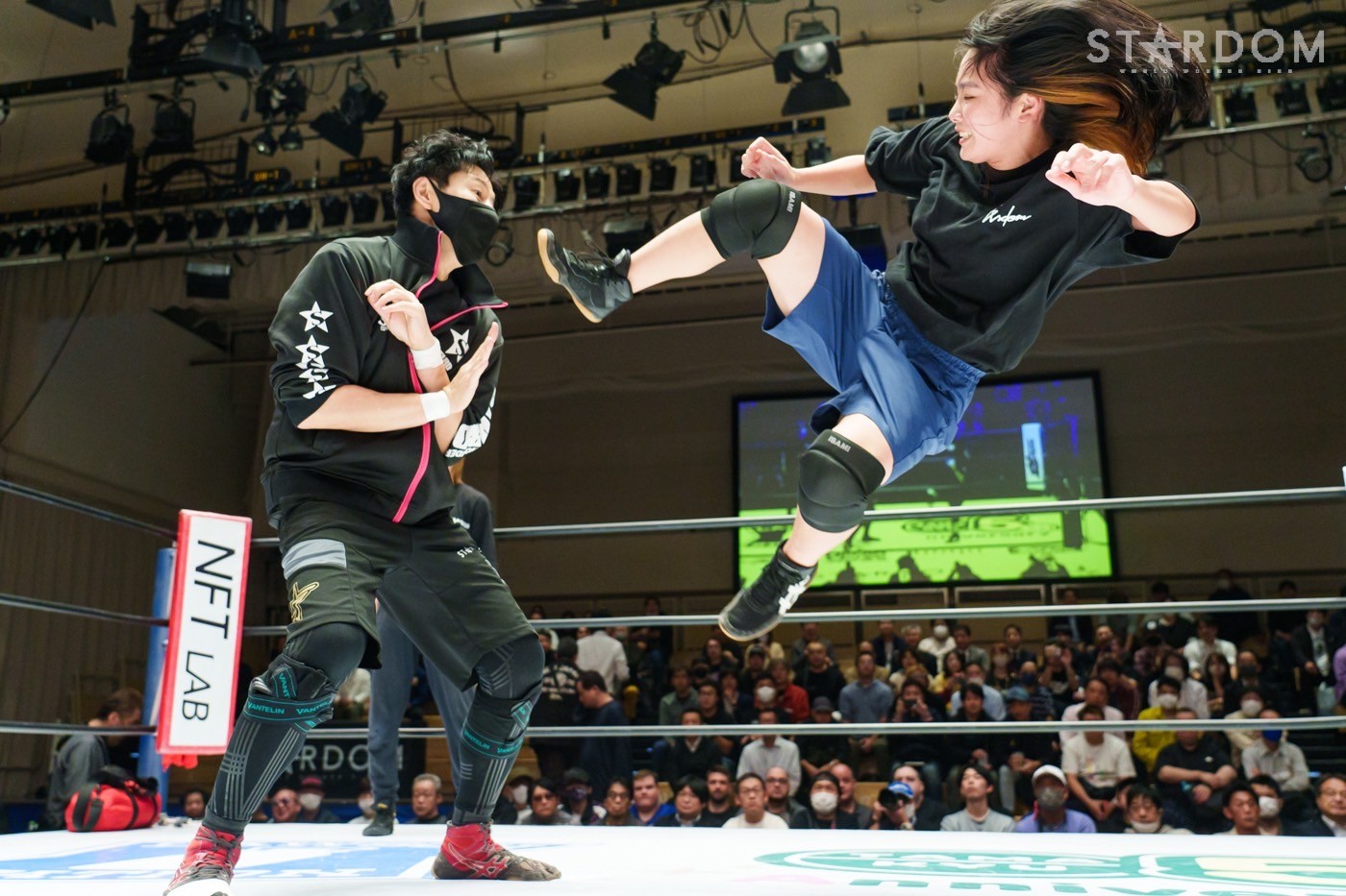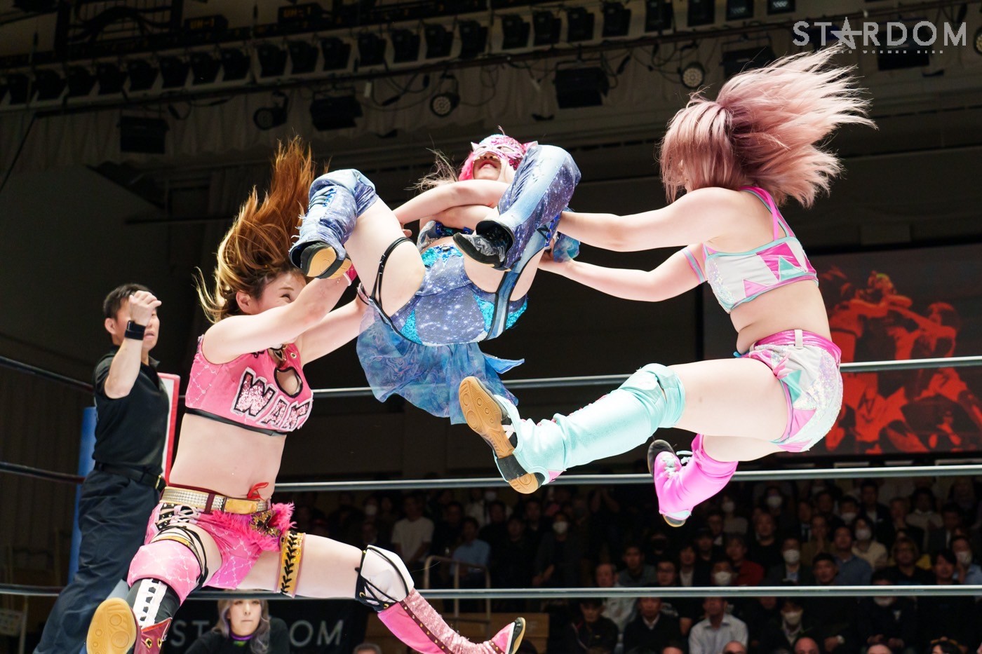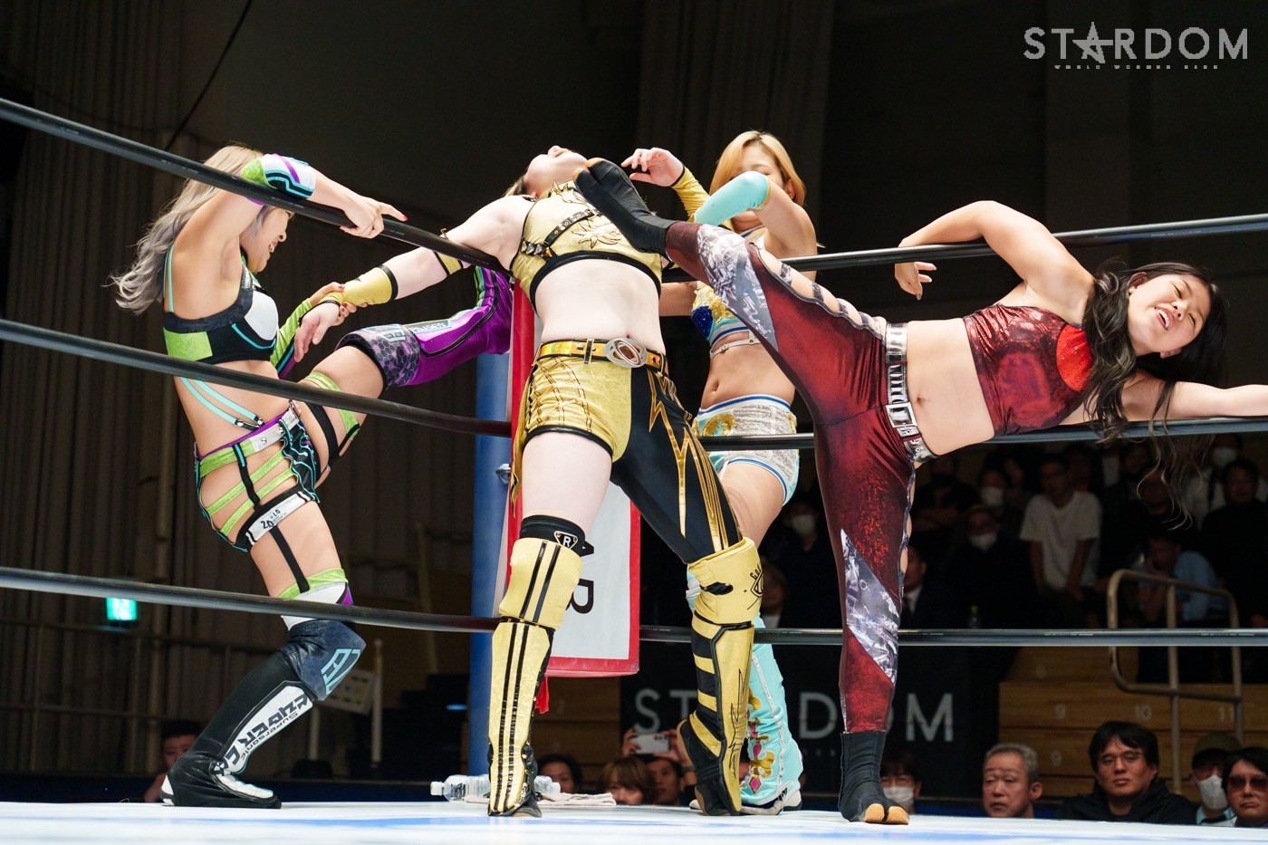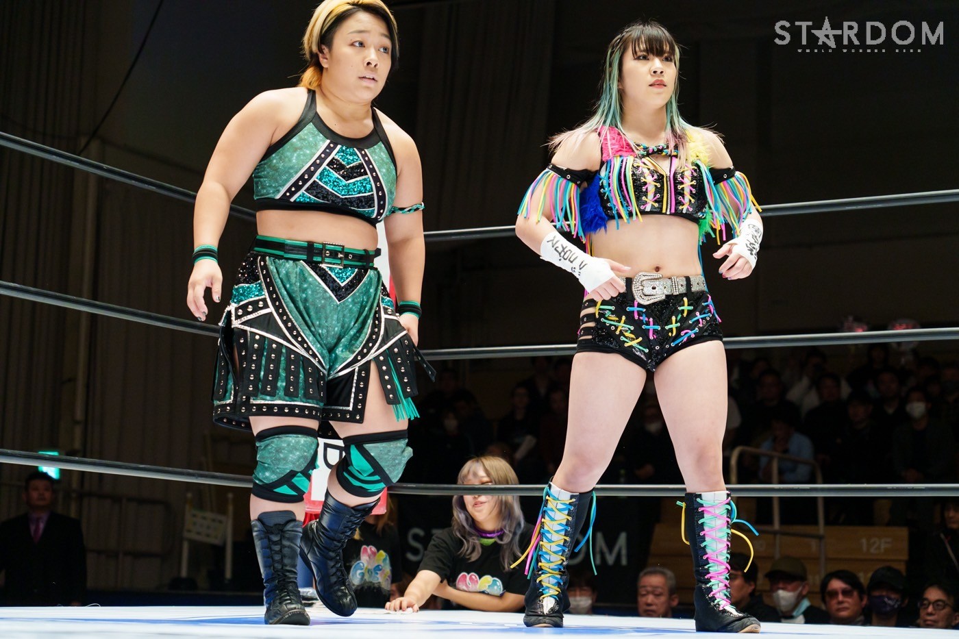 梨杏が先発に立候補し、キッドと対峙。ロックアップで組み合い、キッドが押し込んでチョップ。キッドが走ると月山が介入しダブルでヒップアタック。月山と梨杏が合体するがキッドと鈴季がカウンターでエルボー、エプロンに出して左右からドロップキックの挟み撃ち。キッドが梨杏、鈴季が月山にその場跳びムーンサルト。キッドが梨杏に逆エビ固め。鈴季が梨杏に串刺しエルボー、串刺しニー。梨杏が返してエルボー連打で向かっていく。鈴季が受けて立ち、ドロップックで吹っ飛ばす。梨杏がラリアットをかわしてクロスボディー。月山が鈴季にヒップアタック連打、串刺しヒップアタック、クロスボディー。月山の突進を読んで鈴季がスピア。キッドが月山に619,ヒザへのドロップキックを連発し、ニークラッシャー。月山がカウンターのクロスボディー、梨杏と串刺しエルボーで合体、月山の地獄突きから梨杏がクロスボディー。月山は極楽ドン狙い。キッドがこらえて鈴季がトラースキック、キッドがフィッシャーマン連打。しかし、梨杏がカットする。キッドは月山へストレッチマフラー。月山がエスケープすると、キッドがヒザへのドロップキック。月山がエルボー連打、キッドがドロップキック。黒虎天罰を切り返して月山がオースイ。梨杏がキッドにフェースクラッシャー、月山と合体でマットに叩きつける。キッドが返すと、月山はコーナーからミサイルキック。しかし、キッドが返してみせる。月山はカバーの連続。キッドがしのいで、月山の突進を鈴季が止めてキッドがフェースクラッシャー。キッドがストレッチマフラーも、梨杏がカット。鈴季が梨杏を捕獲、キッドが黒虎脚殺に移行すると月山がギブアップした。
