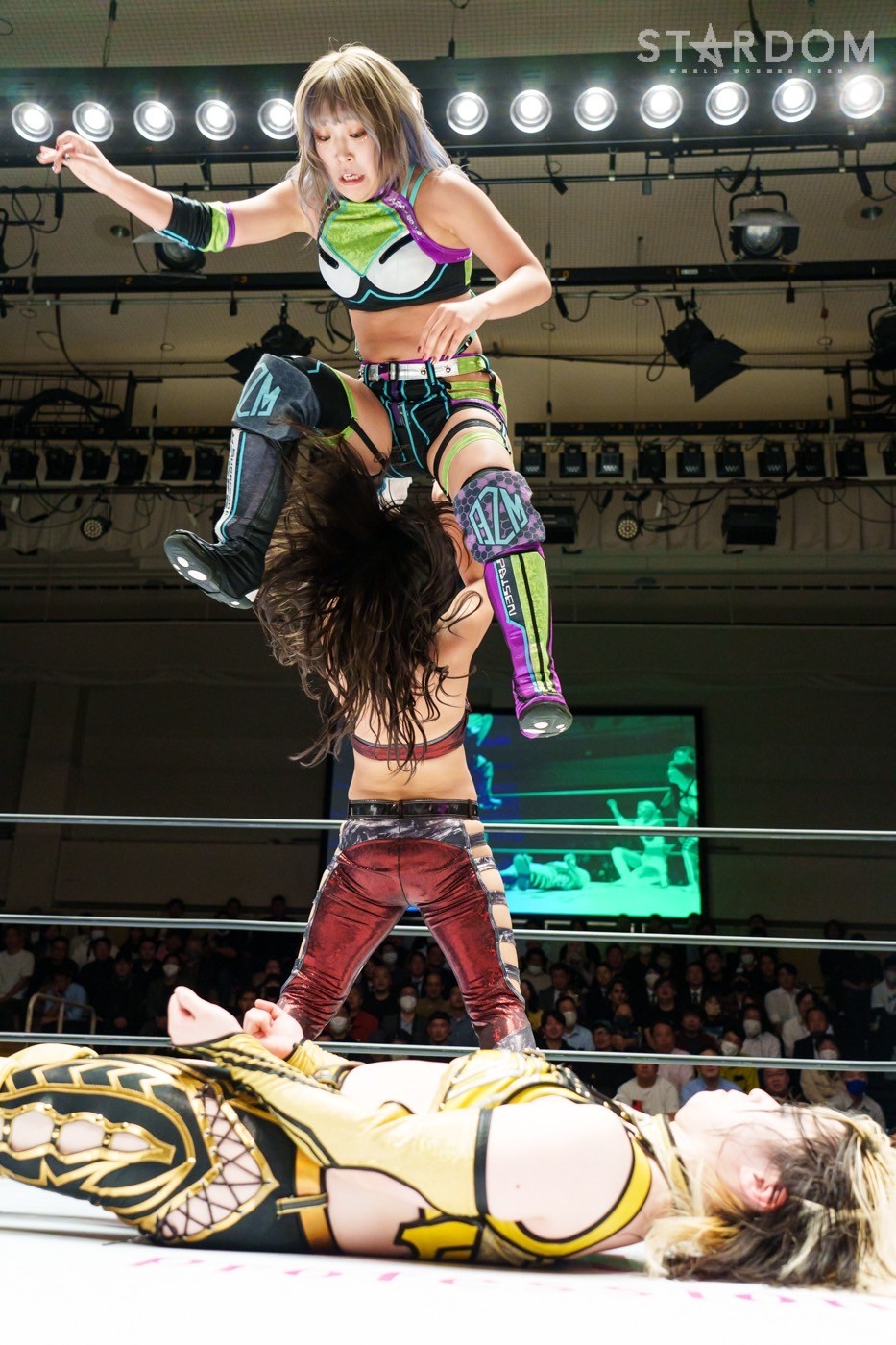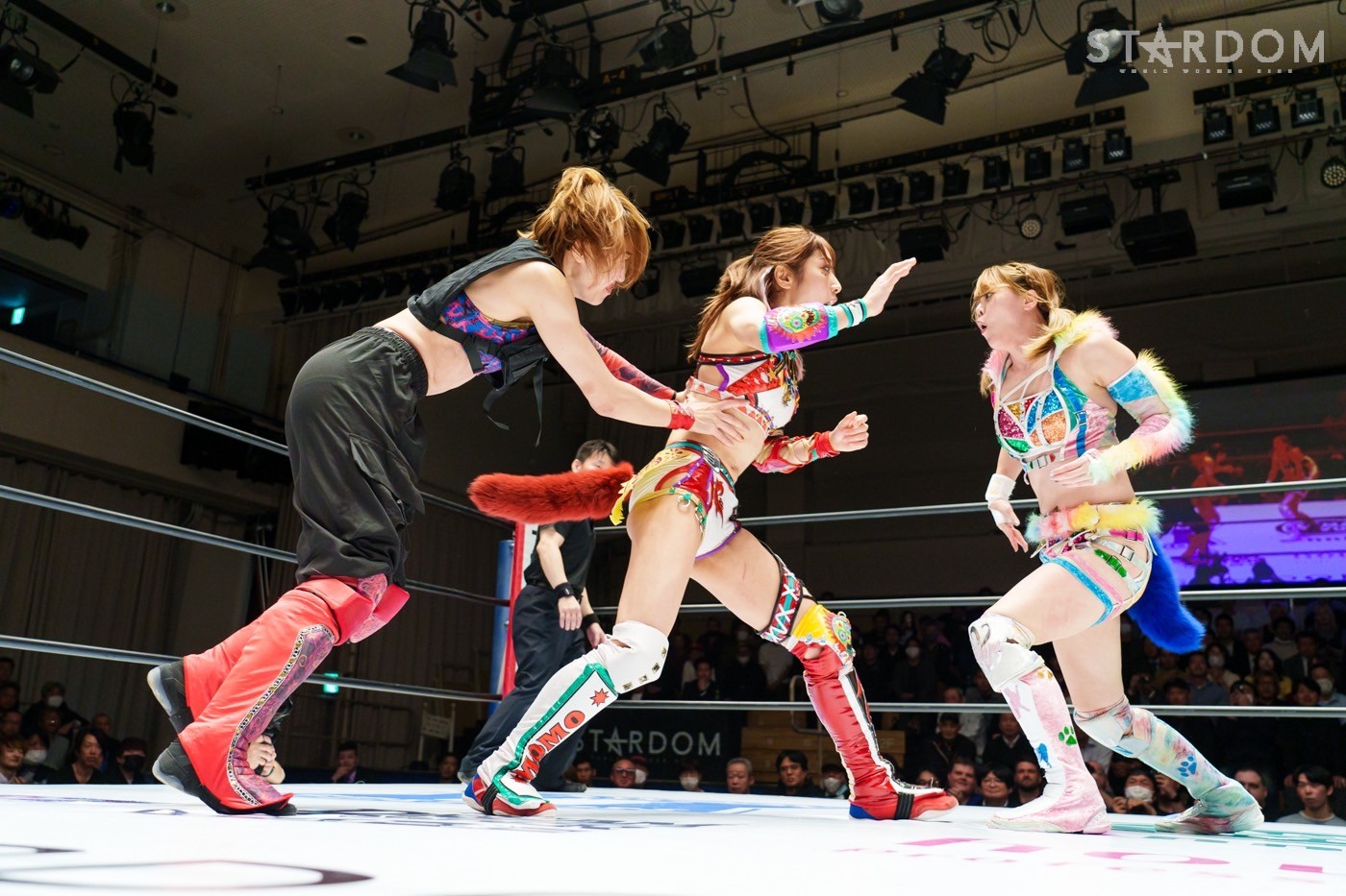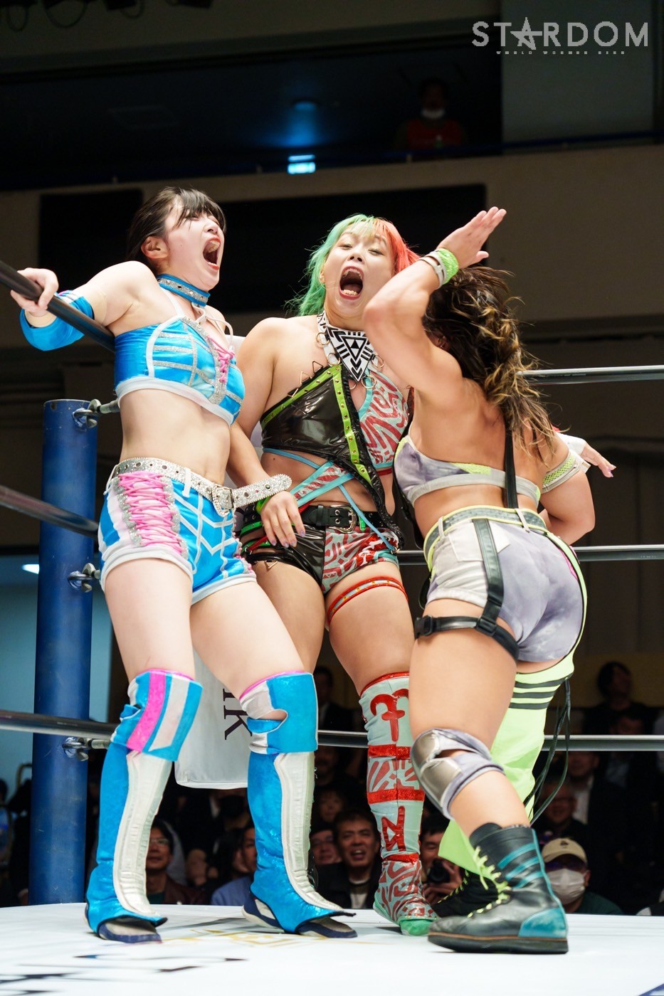 上谷が出てきて相手チームを挑発。中野が手を差し出すと、上谷が叩いてみせる。中野が蹴りを入れロープワークへ。上谷がアームホイップ、中野がエルボーも上谷がかわしてアッカンベー。中野がドロップキックからカバーするが2カウント。玖麗が上谷にドロップキック、エルボーの連打。上谷が先に高々とボディースラム。小波が入り上谷と合体、玖麗を振ると見せかけ後方に叩きつけストンピング連打、ドロップキックの挟み撃ち。小波は玖麗の顔面を踏みつけると、ロープに固定し上谷も加勢する。小波は玖麗にサッカーボールキックを放ち仁王立ち、挑発しながらエルボー連打を受けて立つ。小波はエルボー一発で玖麗を吹っ飛ばすが、玖麗がカウンターでドロップキック。ボディースラムを狙う玖麗だが、小波がこらえてハイキック。玖麗がかわして後方から飛び乗る。小波がコーナーに追い込むが、玖麗がドロップキック。中野が小波にダイビングボディーアタック、小波が突進をかわし上谷と合体。しかし中野が次々と串刺しエルボー、まとめてDDT。小波が返すと、中野の突進を止めてワキ固め。玖麗がカットに入るが、上谷が場外に引っ張り出す。小波は中野への腕固めを続行。中野の足がロープに届く。小波がPKで蹴り上げるも2カウント。上谷が中野へ串刺しニー、ドロップキック。中野が返してバックキック、上谷がカウンターのパンチ、中野がバックドロップ、ニーアタック。エプロンでポーズする中野が上谷とエルボーを打ち合う。上谷が連打し、エプロンでフィッシャーマン狙い。中野が内側からエルボー、小波が蹴りで妨害し上谷がスワンダイブ式ボディーアタック。中野がクローズラインをかいくぐり玖麗とドロップキックの競演。玖麗が小波、中野が上谷を引き起こすとコーナーからスリーパー。中野と玖麗がコーナーからミサイルキック。中野がカバーも上谷が返す。中野は上谷にタイガーの構え。上谷がコーナーに振られるが突進をかわし小波と串刺し攻撃の連続。中野がかわして玖麗が上谷にスピア。中野が上谷にタイガーも小波のカットが間に合う。上谷は中野を場外に堕してエプロンからダイブ。小波は別サイドで玖麗にキックを見舞う。上谷が中野をリングに戻し、ミサイルキック。しかし中野の手がロープに届く。上谷はフィニッシュを宣言して中野にスタークラッシャー狙い。中野が切り返しブレーンバスターの体勢、こらえられるとスピンキック、上谷がカウンターでスピンキック。小波と上谷が蹴りを見舞い、上谷がフィニッシュ宣言、ダブルで蹴り上げ、上谷がスタークラッシャーを旋回式で見舞う。3カウントが入り、上谷が勝利した。