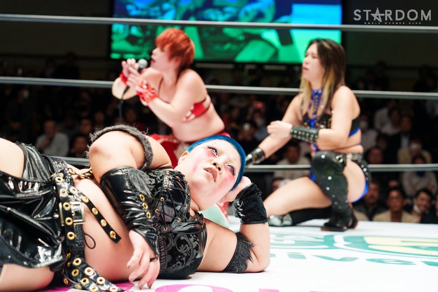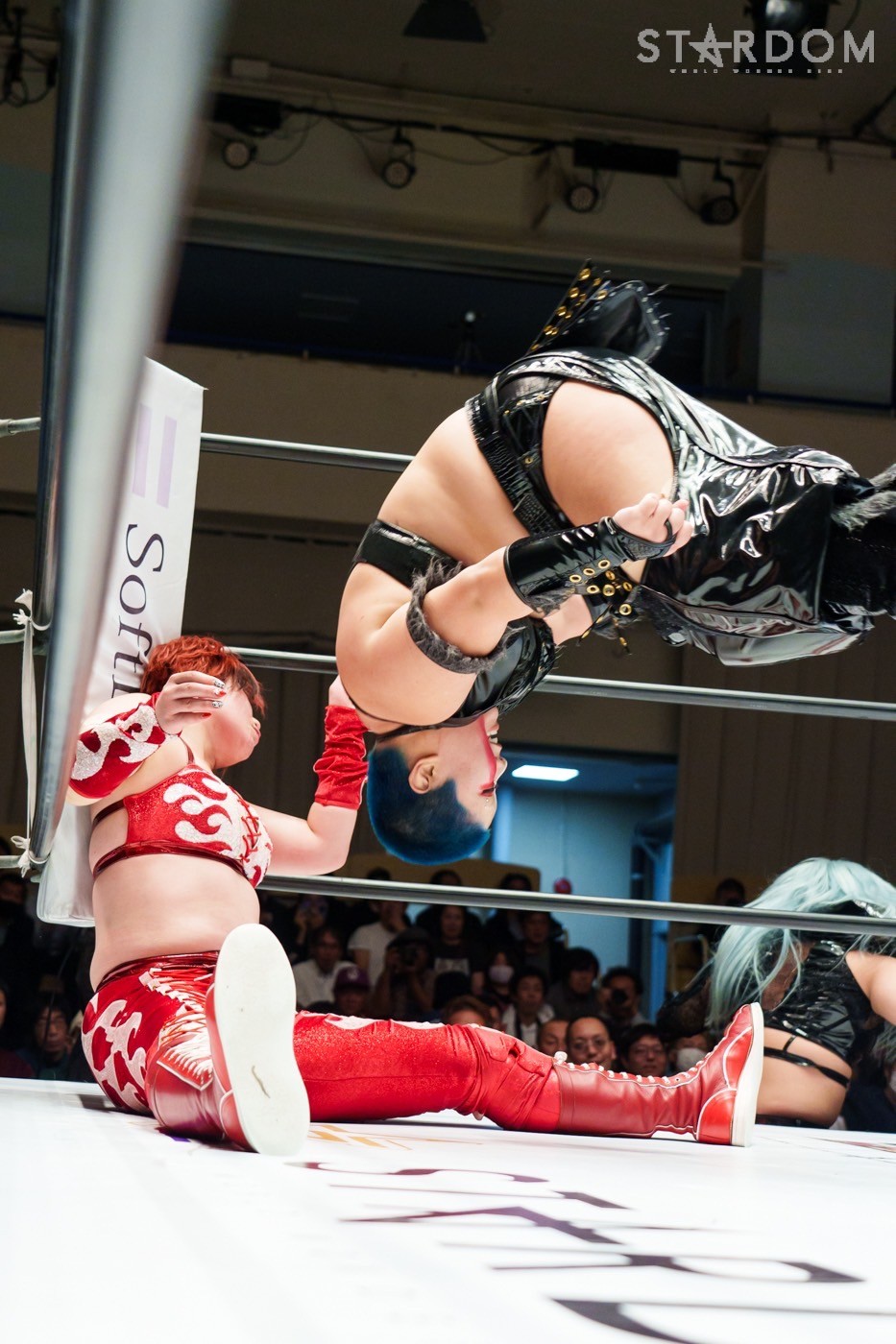 再度、狐伯が追い込むが、あずさが反転してストンピング連打。狐伯が腕を取ると、あずさも取り返して腕の取り合い、狐伯がネックロック、あずさが切り返すが狐伯がヘッドロック。あずさがヘッドロックで締め上げるが、狐伯がかいくぐって手を踏みつけDDT、ドロップキック。星来が入り、狐伯とドロップキックの競演。星来の突進を読んで吏南が乱入、あずさと合体。吏南が星来にヘアーホイップの連続。止めに入ったレフェリーと控えの狐伯に唾を吐きつける。あずさが星来にボディースラム、サッカーボールキック。あずさの突進を読んで星来がドロップキック。狐伯が入ると吏南が乱入、しかし、狐伯がまとめてドロップキック、あずさにミサイルキック。あずさが返すと、狐伯をかいくぐり打撃の連打、狐伯もいかいくぐってネックロック。あずさが抜けだしてバックキック。吏南が狐伯へビッグブーツ、ドロップキック。狐伯が返すと、ブレーンバスター、ニーアタック。星来が吏南にラリアット、ミサイルキック。吏南が返すと、星来が足をロックし髪を引く。星来がバックを取り狐伯がダッシュ。しあしリング下からあずさが足を引いて妨害。あずさの掌底から吏南が星来にダイビングダブルニー。星来が返すと吏南はピンクデビル。星来が返すと、吏南はコーナーへ。狐伯がカットしマットに叩きつけると、ダブルアームの構え。吏南が切り返すと星来と狐伯が2方向からミサイルキック。星来が吏南にジャーマン。吏南が返すと、星来はボム狙い。吏南が切り返すと丸め込みの応酬。吏南が突進すると星来が切り返し丸め込みの応酬。狐伯が吏南を起こして肩車、星来がコーナーに上がるが吏南がカット、星来のミサイルキックは誤爆、吏南が星来を卍固め、あずさの蹴りからチェックメイトで叩きつける。星来が返すと、吏南はピンクデビル狙い。あずさがニーを放ち吏南が星来にPink♥Devil、吏南が星来を押さえ込み3カウントをゲットした。