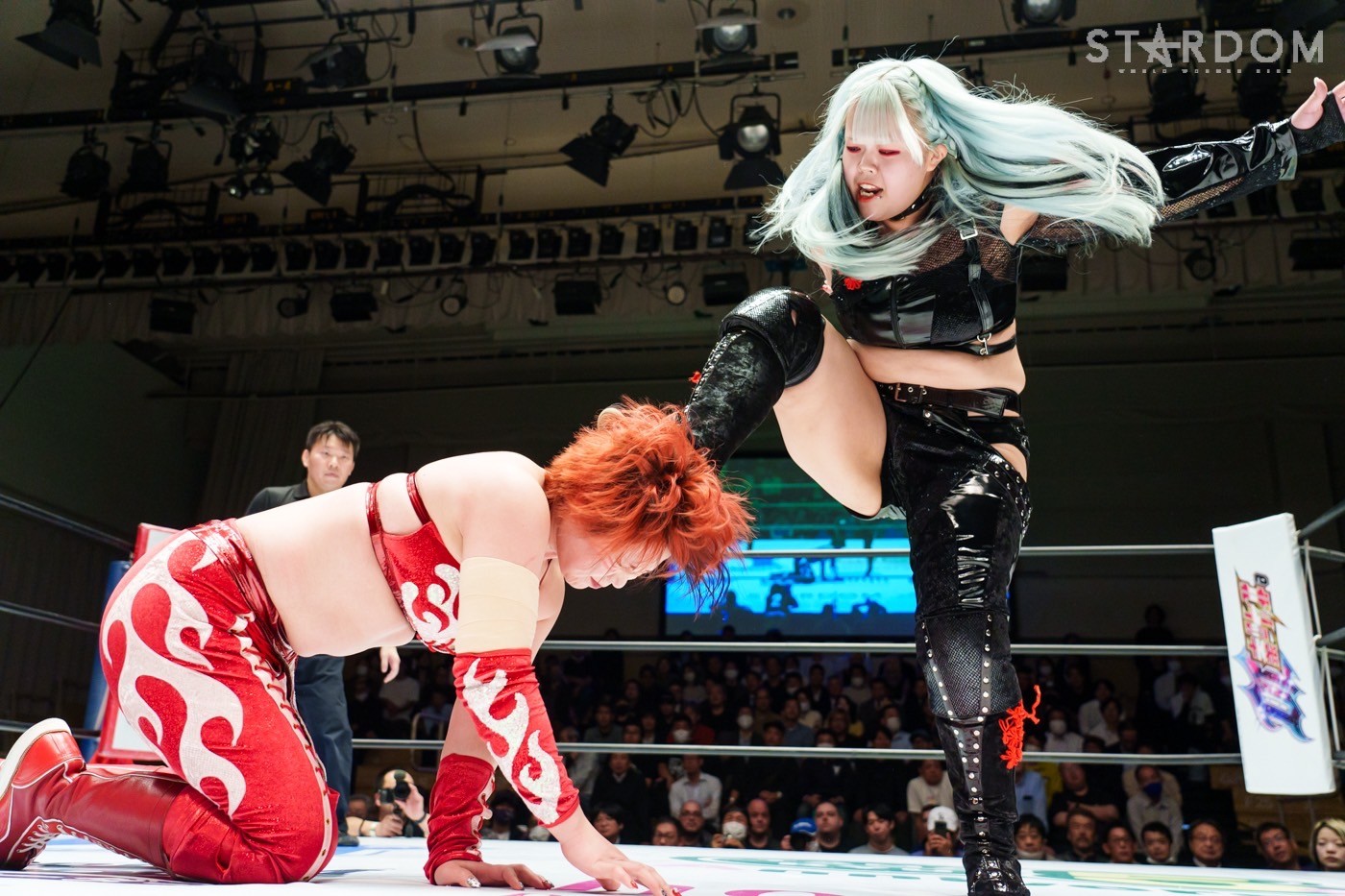1勝1敗1引き分けのスターライト・キッド&鈴季すず組と、まさかの連勝スタートを切った月山和香&梨杏組のタッグリーグ公式戦。ネオジェネシスの2人がE neXus Vの若手コンビの勢いを止めるか、それとも三度番狂わせが起こるのか?