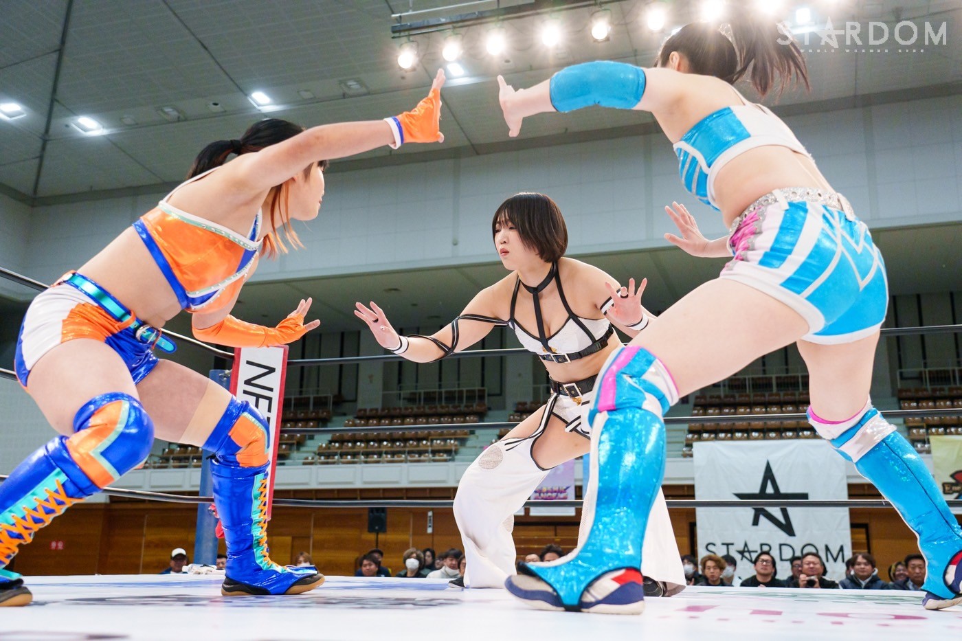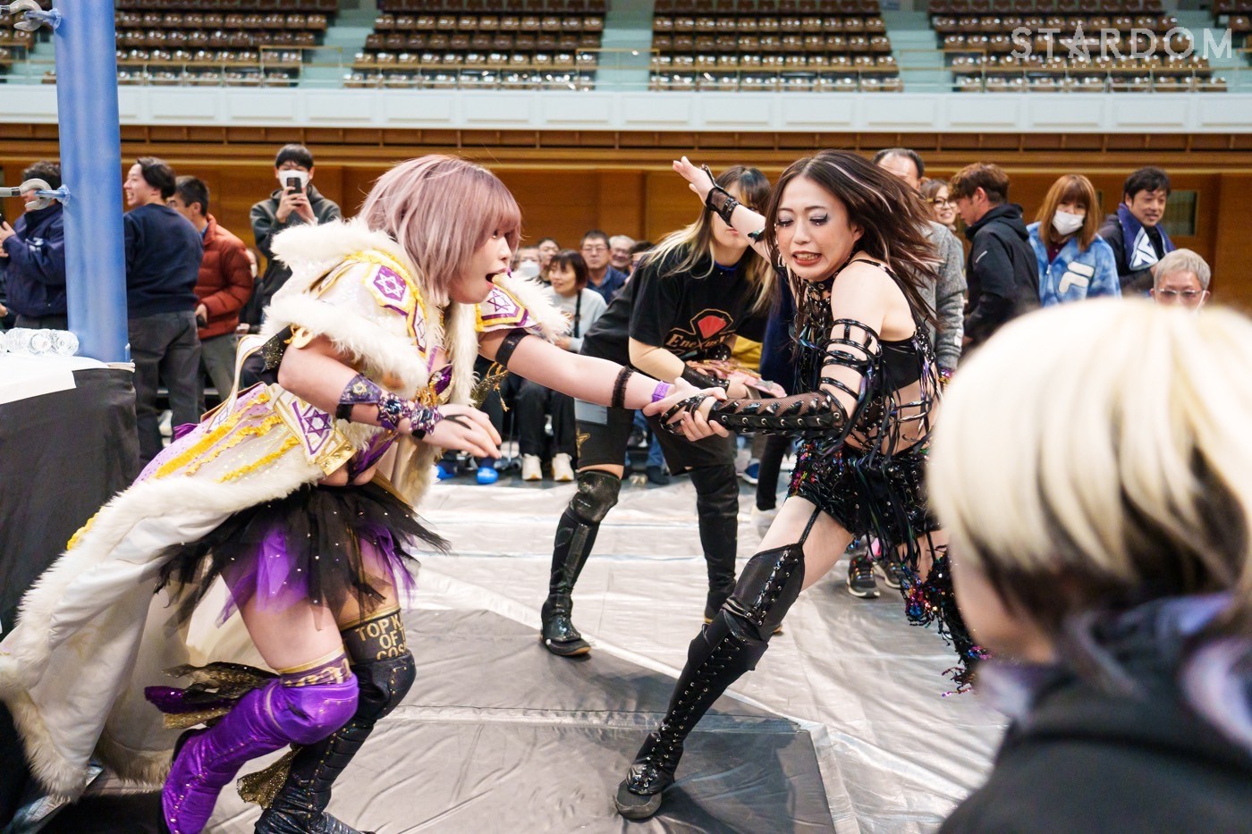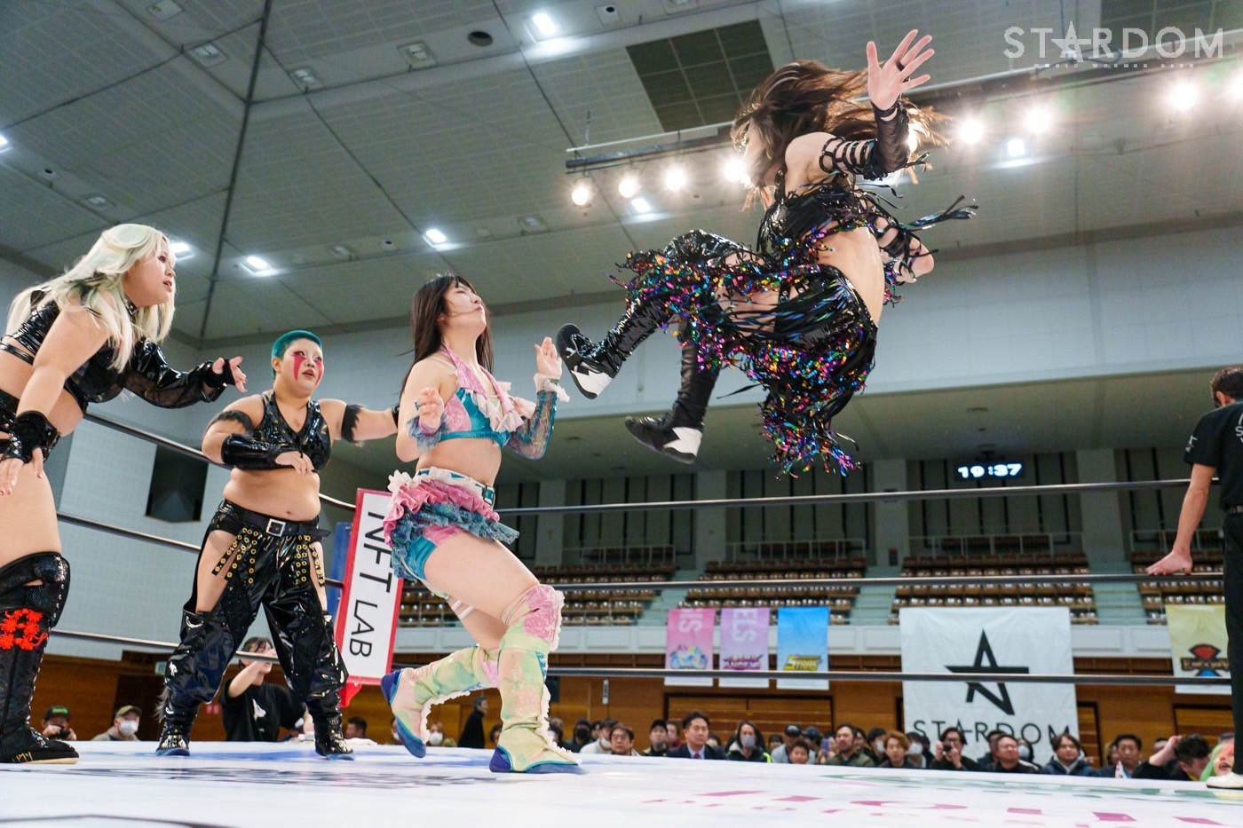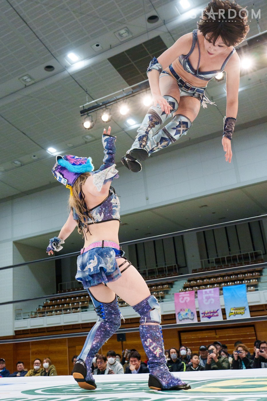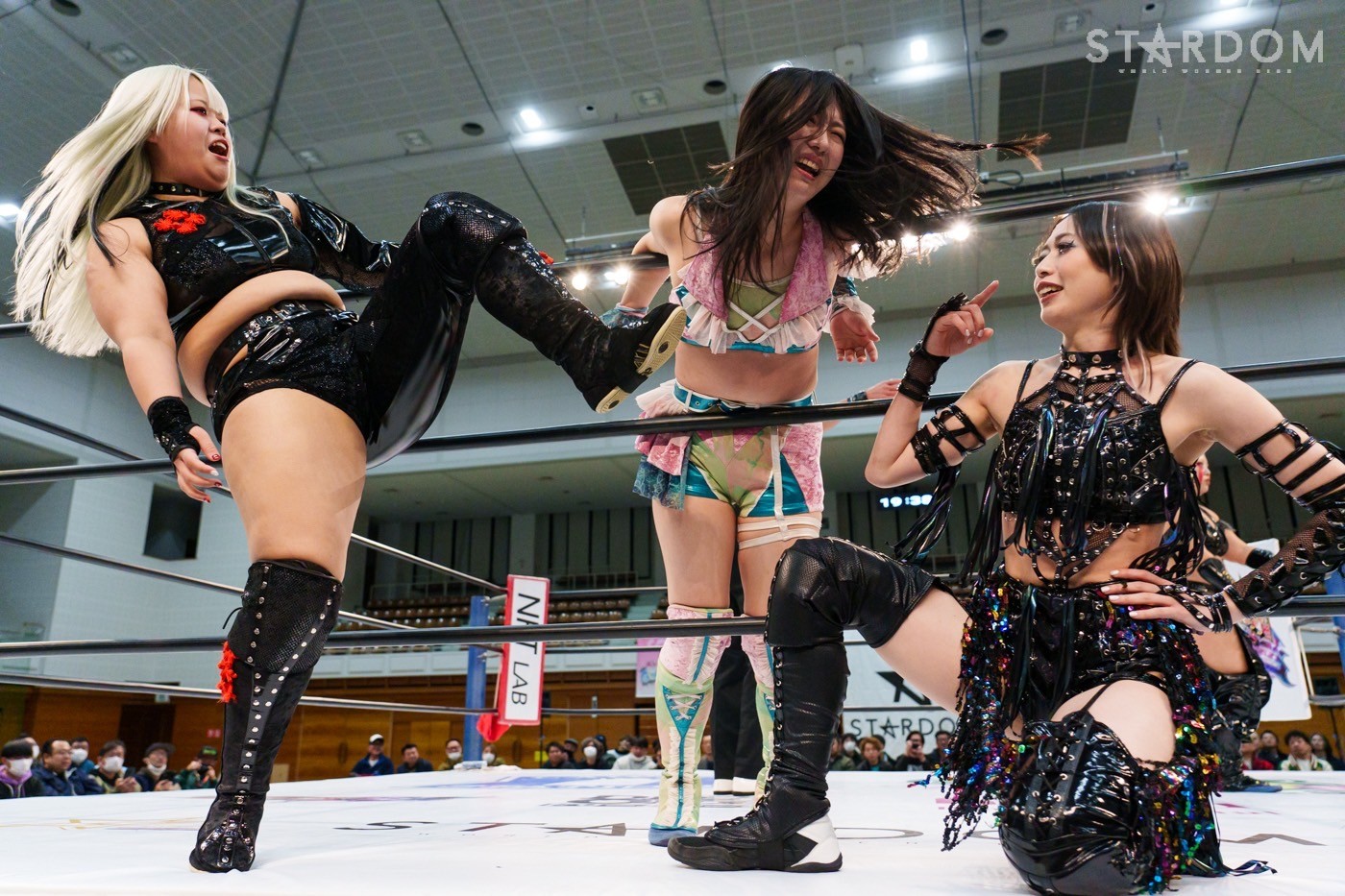 向後とあずさが先発で対峙。ロックアップから腕の取り合い。あずさがロープに振ると見せかけてヘッドロック。向後がロープに振り、アームホイップからドロップキック。岩谷が入りSTARSが合体。しかしダブルのドロップキックを仕掛けると、小波が岩谷の足を引き場外戦にもっていく。あずさが向後をリングに戻し「なめんなクソババア!」と顔面を踏みつける。小波が向後をロープに固定して攻撃すると、サッカーボールキック。向後が返してエルボーで向かっていくも、小波が仁王立ちで受けて立つ。向後は立ち上がりエルボー連打、小波が一発で吹っ飛ばす。小波の突進に向後がドロップキック、619をヒットさせる。岩谷が小波へドロップキック連打。背後からあずさが岩谷に襲いかかる。しかし、岩谷は二人捕まえてアームホイップからドロップキックで分断。岩谷と小波がハイキックをかわし合う。小波のワキ固めを岩谷が切り返し突進。すると小波が、エプロン際で腕を取ってぶら下がり式腕十字。あずさが岩谷に二段蹴り、ニーの連打。あずさが岩谷にヒザ十字、向後がカットしようとするが小波がスリーパーで阻止。岩谷がエスケープすると、あずさはフィニッシュを予告。岩谷が切り返しバックキック、エルボー。あずさが突進をかわすと小波とともに串刺し攻撃、あずさがフロントネックチャンスリードロップからランニング掌底。岩谷が返すと、向後があずさにトラースキック、岩谷がジャーマン。向後がトラースキックで小波を場外に送り出すと、小波が岩谷を呼び込む。岩谷があずさにトラースキック、向後がボディーアタック、岩谷がPK。10分経過。岩谷がフィニッシュを宣言しドラゴン狙い。あずさが逆さ押さえ込みに切り返す。岩谷がドドンパを決めると3カウントが入った。