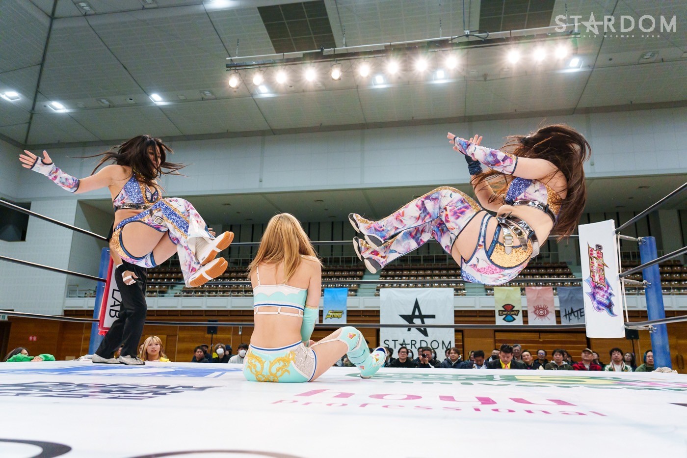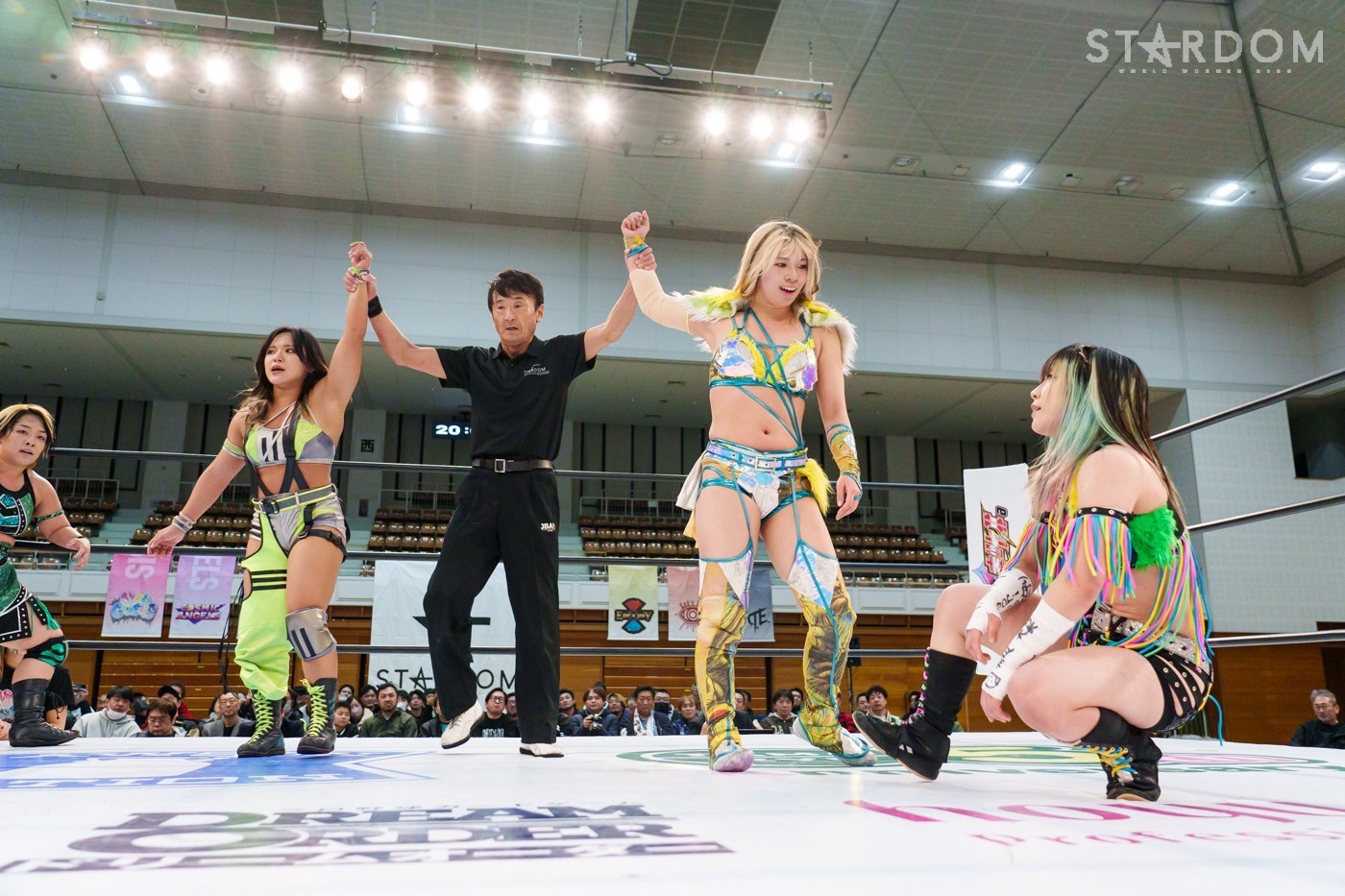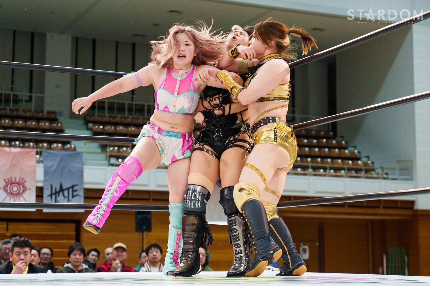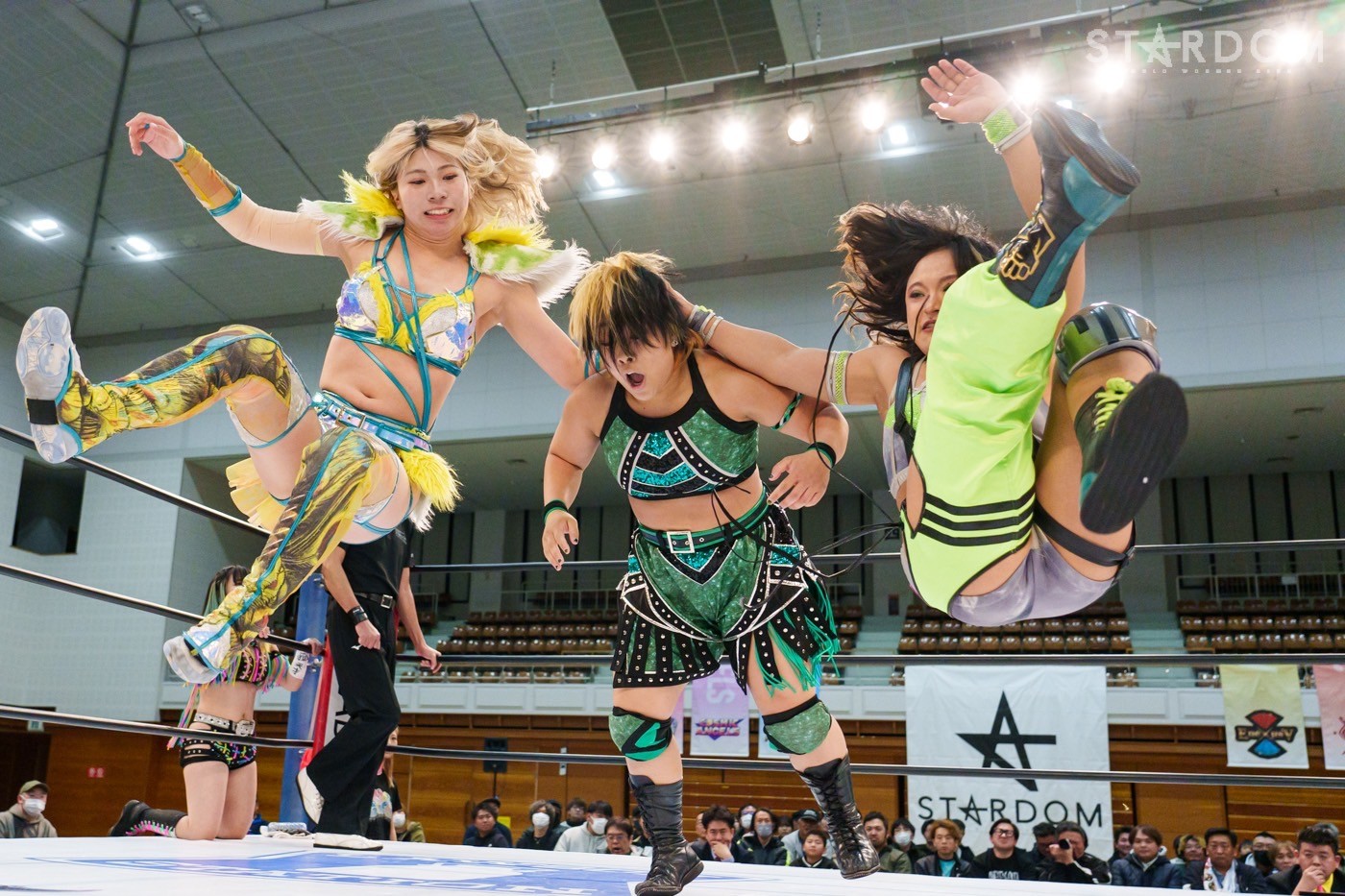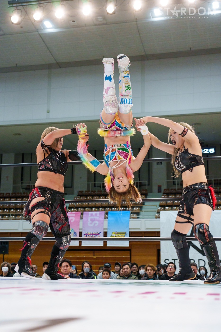 向後とあずさが先発で対峙。ロックアップから腕の取り合い。あずさがロープに振ると見せかけてヘッドロック。向後がロープに振り、アームホイップからドロップキック。岩谷が入りSTARSが合体。しかしダブルのドロップキックを仕掛けると、小波が岩谷の足を引き場外戦にもっていく。あずさが向後をリングに戻し「なめんなクソババア!」と顔面を踏みつける。小波が向後をロープに固定して攻撃すると、サッカーボールキック。向後が返してエルボーで向かっていくも、小波が仁王立ちで受けて立つ。向後は立ち上がりエルボー連打、小波が一発で吹っ飛ばす。小波の突進に向後がドロップキック、619をヒットさせる。岩谷が小波へドロップキック連打。背後からあずさが岩谷に襲いかかる。しかし、岩谷は二人捕まえてアームホイップからドロップキックで分断。岩谷と小波がハイキックをかわし合う。小波のワキ固めを岩谷が切り返し突進。すると小波が、エプロン際で腕を取ってぶら下がり式腕十字。あずさが岩谷に二段蹴り、ニーの連打。あずさが岩谷にヒザ十字、向後がカットしようとするが小波がスリーパーで阻止。岩谷がエスケープすると、あずさはフィニッシュを予告。岩谷が切り返しバックキック、エルボー。あずさが突進をかわすと小波とともに串刺し攻撃、あずさがフロントネックチャンスリードロップからランニング掌底。岩谷が返すと、向後があずさにトラースキック、岩谷がジャーマン。向後がトラースキックで小波を場外に送り出すと、小波が岩谷を呼び込む。岩谷があずさにトラースキック、向後がボディーアタック、岩谷がPK。10分経過。岩谷がフィニッシュを宣言しドラゴン狙い。あずさが逆さ押さえ込みに切り返す。岩谷がドドンパを決めると3カウントが入った。