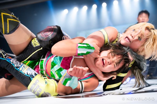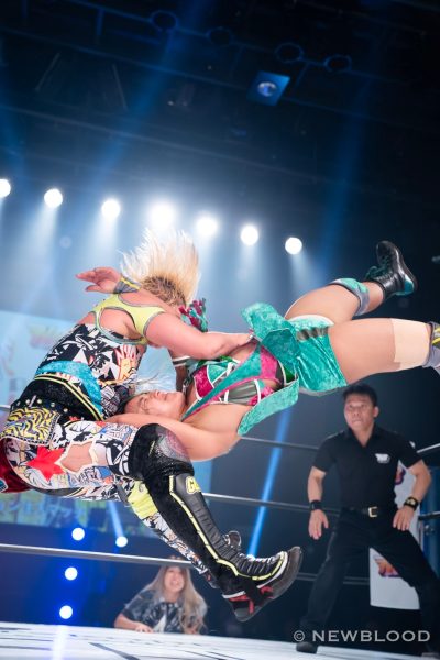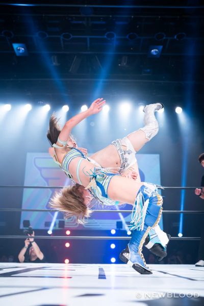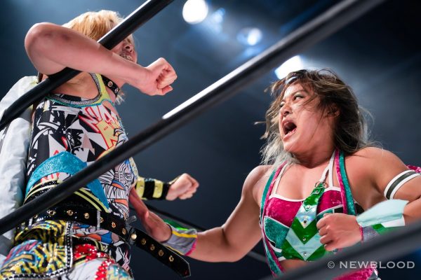 羽南&妃南の姉妹がユニットの枠を超越し、鈴季すず&星来芽依組とタッグ対決。ゴッデス・オブ・スターダム王座挑戦が決まった鈴季&星来組としては、絶対に星を落とせない試合でもある。