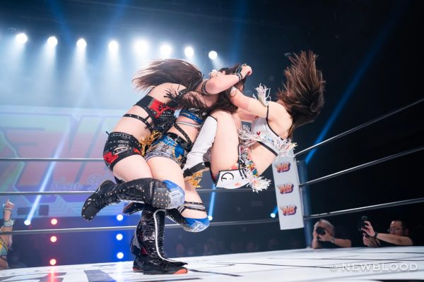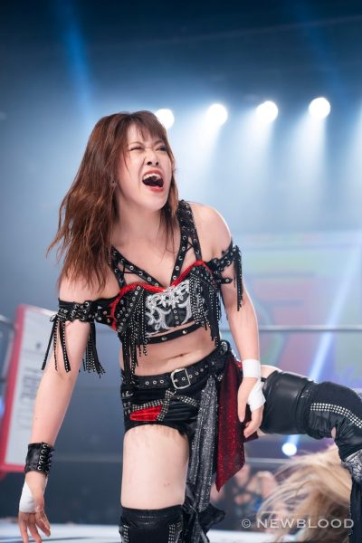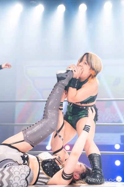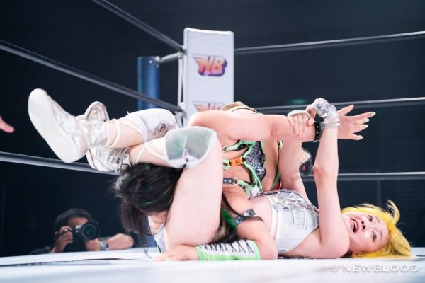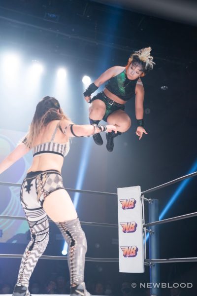 ゴッズアイの壮麗亜美がディアナの美蘭とななみを引きつれてNEW BLOOD出陣。対するはHANAKO&田中きずな&炎華組。waveの田中きずなと炎華はスターダム初参戦となる。