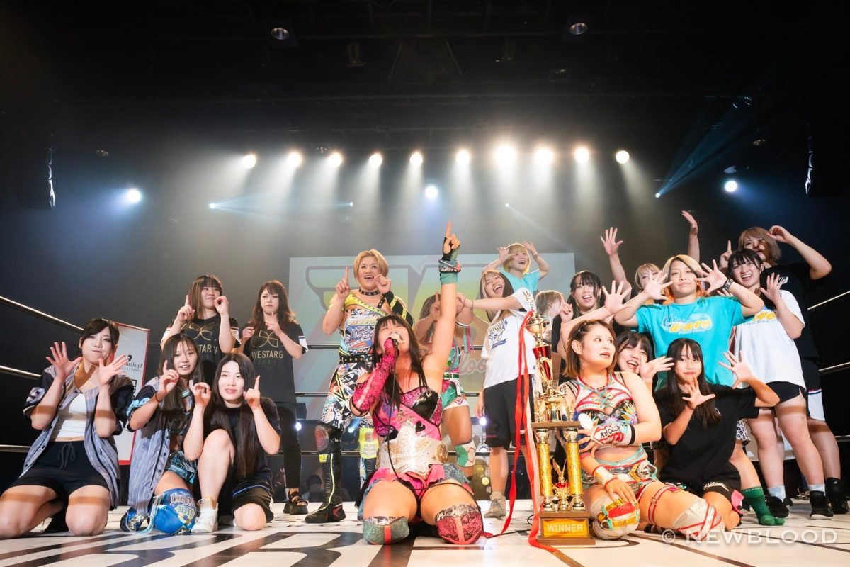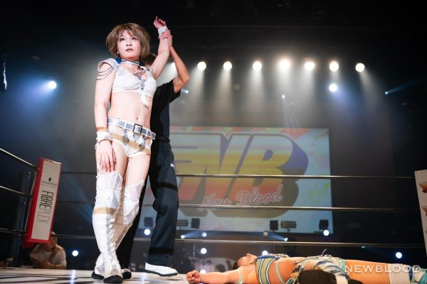 吏南「2度目の防衛成功したぞ! 月山、オマエ、強いじゃん。なに、もう1回やる? やらせねえよ、バーカ! オマエ、そんなに強いんだったら、毎回そのオマエで試合しろよ。いつもなあ、覚悟が見えないんだよ、バーカ。まあ、また、このベルトじゃなくてもやり合えると思ってるから。次も負けねえけど。ということで、NEW BLOOD10(テン)? じゅう? じゅう。どうでしたか。今日、シングル5本あって、そのメインでタイトルマッチってけっこう緊張してたっていうか、なんですけど、NEW BLOODはもう吏南が主役ってことでいいですか? ってことで、今日出た選手リングに上がって恒例の締めをしましょうか。上がってこい、オメエら! 若さを信じて明日に輝け、NEW BLOODテーン!」