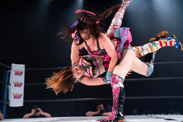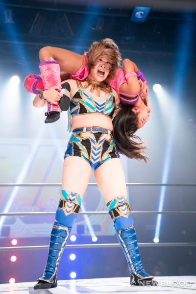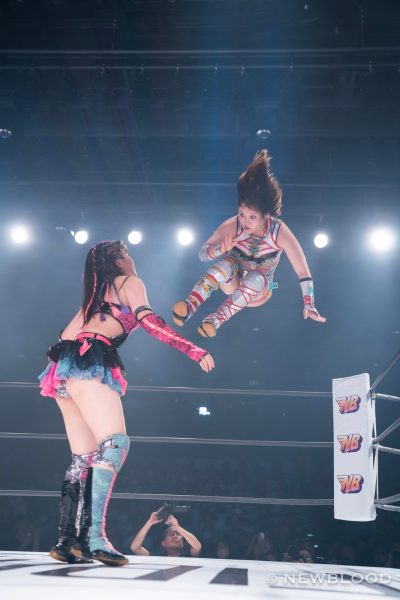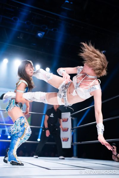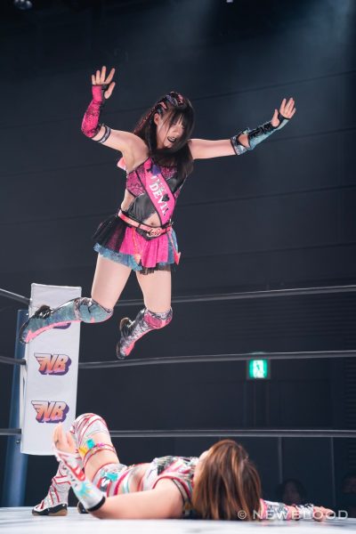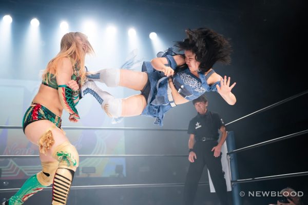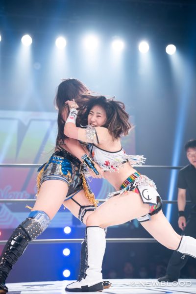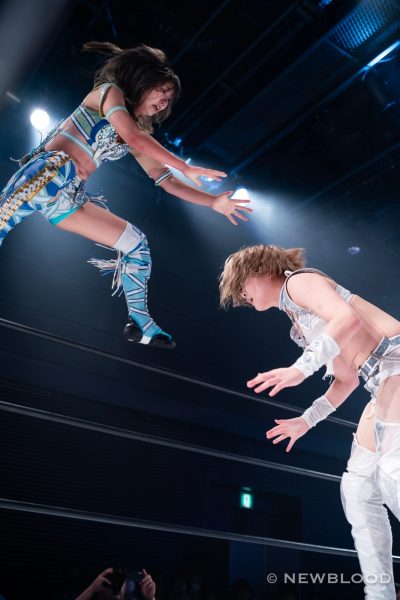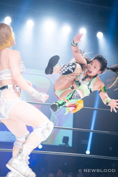 水森の体重は60・8キロとコールされ、試合開始。なつぽいから握手ならぬ「ぽい!」のお誘い。水森が歩み寄り両手での握手でこれに応じる。なつぽいのクロスボディーを水森がキャッチ。なつぽいが張り手を食らわし左右で軽く連打。水森は力強いエルボー。エルボーの応酬から水森が乱打。なつぽいは倒れずカウンターのバックキック、ネックブリーカー。なつぽいが水森をコーナーに追い込み顔面を踏みつけていく。ヘアーホイップから髪を束ねるなつぽいにレフェリーが注意。なつぽいは「持ってない」と何度も否定するもヘアーホイップからコーナーに追い込み顔面を蹴飛ばす。水森が抱えるがなつぽいが回避しエルボー。水森がカウンターでドロップキック。ラリアット、エプロンに出て水車落としの構え。なつぽいが切り返し場外に送り出す。水森がなつぽいを担ぎ、リングまわりを一周して落とす。さらに場外でボディープレス。リングに戻すと水森がダイビングラリアット。なつぽいが迎撃し、変型卍固めで飛びつく。グラウンドに移行し締め上げるが水森がロープへ。なつぽいは右腕をロープに固定し低空ドロップキック。なつぽいがコーナーからダイビングボディーアタックも2カウント。なつぽいは左右で張り手連打。水森が至近距離からラリアット、マウントの張り手の乱打。なつぽいがエルボー、バックキック、ジャーマン狙いを切り返し水森がラリアット。水森が担ぎ上げるがなつぽいが切り返す。なつぽいはトラースキック、ラリアットをかわしてポイ捨てジャーマン。水森が立ち上がりラリアット。再び担ぎ上げるがなつぽいがフェアリングリング。しかし水森が返してみせる。なつぽいがトラースキック、「まだまだまだ!」と叫んでフェアリアルギフト投下。水森が返すと、フェアリーストレイン。水森が返せず、なつぽいが勝利した。