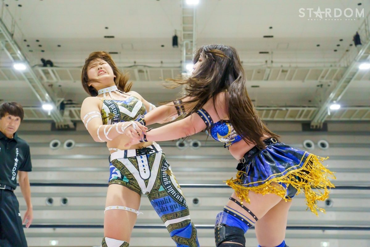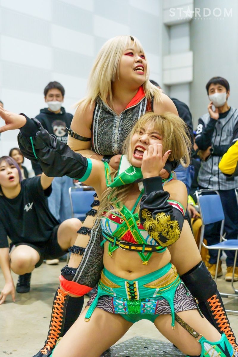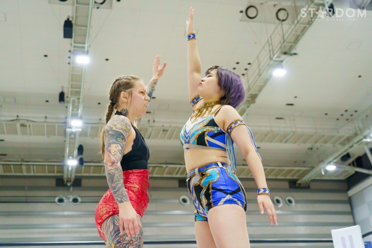 前日に引き続き、タッグリーグ戦覇者の舞華がゴッデス・オブ・スターダムのベルトを持って登場。桜井と羽南が先発し、桜井がヘッドロック。羽南が切り返すと、桜井が元に戻して締め上げる。桜井は羽南にパラダイスロックを仕掛け、「この庶民が!」と罵倒する。すると飯田が羽南を救出。飯田と羽南がダブルで桜井を攻撃。羽南のドロップキックから飯田がヒップドロップ。さらにドロップキックの挟み撃ちから羽南がボディープレス。羽南がラリアットも、桜井がかいくぐってドロップキックを見舞う。舞華が羽南にショルダータックル連打。控えの飯田も落として羽南に滞空時間の長いブレーンバスター。羽南が返すと、コーナーからボディーアタック、後方からニーアタック。舞華が返すと、羽南がエルボースマッシュ、ランニング式でもう一発。飯田が舞華を持ち上げコーナーに追い込むと、逆水平の連打を浴びせる。舞華は飯田のバックエルボーをかわす。しかし、飯田が舞華の足を攻撃しバックエルボーを決める。飯田の突進をキャッチし、舞華がパワースラム。替わった桜井が飯田にビッグブーツ、ドロップキック。羽南が桜井を止めて飯田とサンドイッチ式エルボー。飯田が飯田ロケットを桜井に命中させるが、舞華のカットが間に合う。飯田は桜井にノーザンライト狙い。舞華がカットし、桜井が飯田を叩きつける。飯田が返してラリアット、桜井がビッグブーツ。飯田の突進に桜井がニールキック、飯田がラリアット。ブレーンバスターを切り返して桜井がシャイニングバスター。桜井は飯田にスープレックス狙い、飯田がかわしてスパインバスター。飯田のラリアットを舞華がカットしてブレーンバスター、桜井がダイビングエルボードロップでつづく。羽南のカットも間に合わず、桜井が飯田をフォールした。試合後には、桜井が飯田にアーティストのベルトを誇示。舞華はゴッデスのベルトを持ち出し、羽南に見せつける。羽南はNEW BLOODタッグのベルトを誇示して舞華に対抗した。