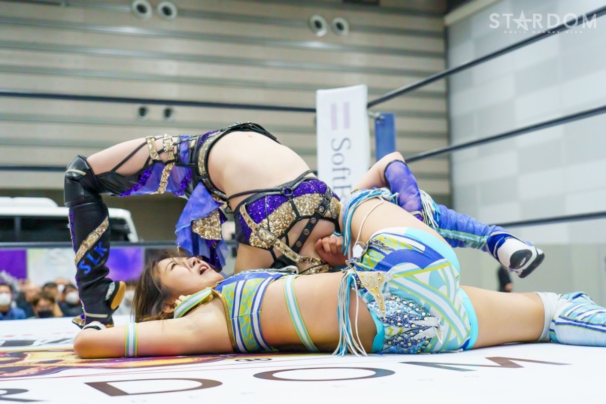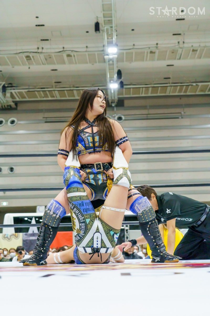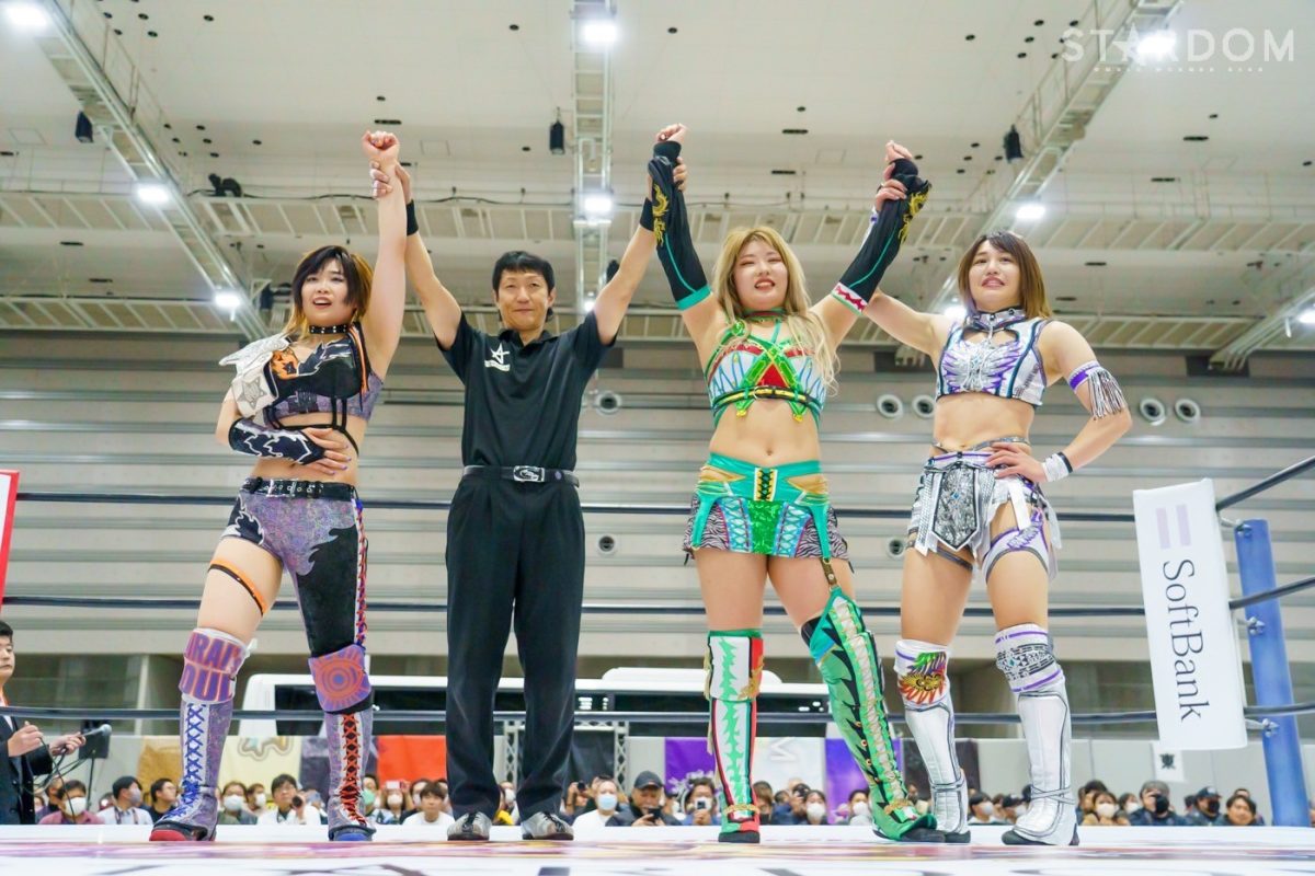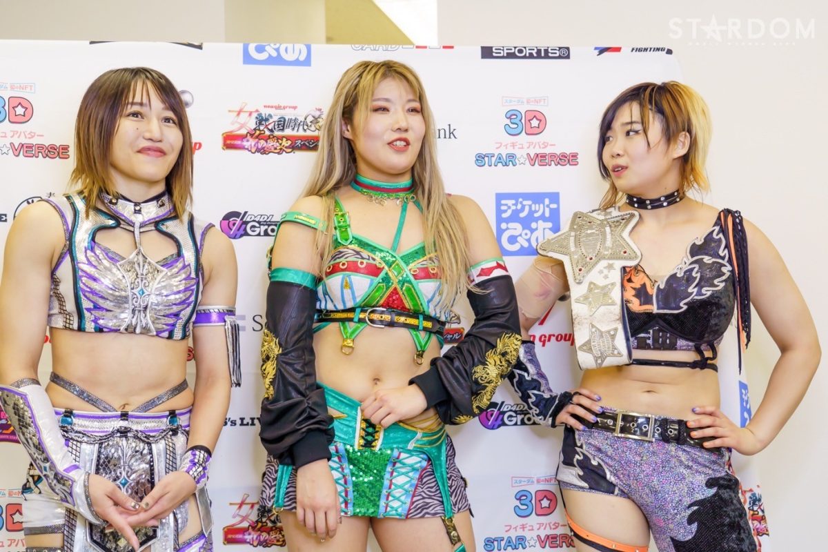 前日に引き続き、タッグリーグ戦覇者の舞華がゴッデス・オブ・スターダムのベルトを持って登場。桜井と羽南が先発し、桜井がヘッドロック。羽南が切り返すと、桜井が元に戻して締め上げる。桜井は羽南にパラダイスロックを仕掛け、「この庶民が!」と罵倒する。すると飯田が羽南を救出。飯田と羽南がダブルで桜井を攻撃。羽南のドロップキックから飯田がヒップドロップ。さらにドロップキックの挟み撃ちから羽南がボディープレス。羽南がラリアットも、桜井がかいくぐってドロップキックを見舞う。舞華が羽南にショルダータックル連打。控えの飯田も落として羽南に滞空時間の長いブレーンバスター。羽南が返すと、コーナーからボディーアタック、後方からニーアタック。舞華が返すと、羽南がエルボースマッシュ、ランニング式でもう一発。飯田が舞華を持ち上げコーナーに追い込むと、逆水平の連打を浴びせる。舞華は飯田のバックエルボーをかわす。しかし、飯田が舞華の足を攻撃しバックエルボーを決める。飯田の突進をキャッチし、舞華がパワースラム。替わった桜井が飯田にビッグブーツ、ドロップキック。羽南が桜井を止めて飯田とサンドイッチ式エルボー。飯田が飯田ロケットを桜井に命中させるが、舞華のカットが間に合う。飯田は桜井にノーザンライト狙い。舞華がカットし、桜井が飯田を叩きつける。飯田が返してラリアット、桜井がビッグブーツ。飯田の突進に桜井がニールキック、飯田がラリアット。ブレーンバスターを切り返して桜井がシャイニングバスター。桜井は飯田にスープレックス狙い、飯田がかわしてスパインバスター。飯田のラリアットを舞華がカットしてブレーンバスター、桜井がダイビングエルボードロップでつづく。羽南のカットも間に合わず、桜井が飯田をフォールした。試合後には、桜井が飯田にアーティストのベルトを誇示。舞華はゴッデスのベルトを持ち出し、羽南に見せつける。羽南はNEW BLOODタッグのベルトを誇示して舞華に対抗した。