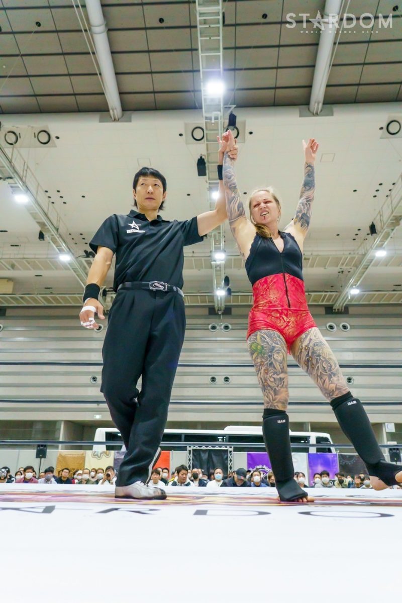 ジュリア「ここどこ?…。郡山大会にお越しの諸君ごきげんよう! 欠場者まみれだよなあ、スターダムいまよう。でもそれでもここに来てくれた諸君は、私とメーガンの初シングルマッチを目撃した特別な諸君だよなあ。オマエらどれだけラッキーなんだよ。メーガン、そこのクソオンナ、必ずリマッチお願いします。そしてピンチだからこそピンチをチャンスに代える力がプロレスにはあると思ってるんだよ。それを私はみんなにもその思いを届けていきたい。だから私は闘い続ける。今日来てくれた諸君ありがとう。アリデベルチ、またな!」