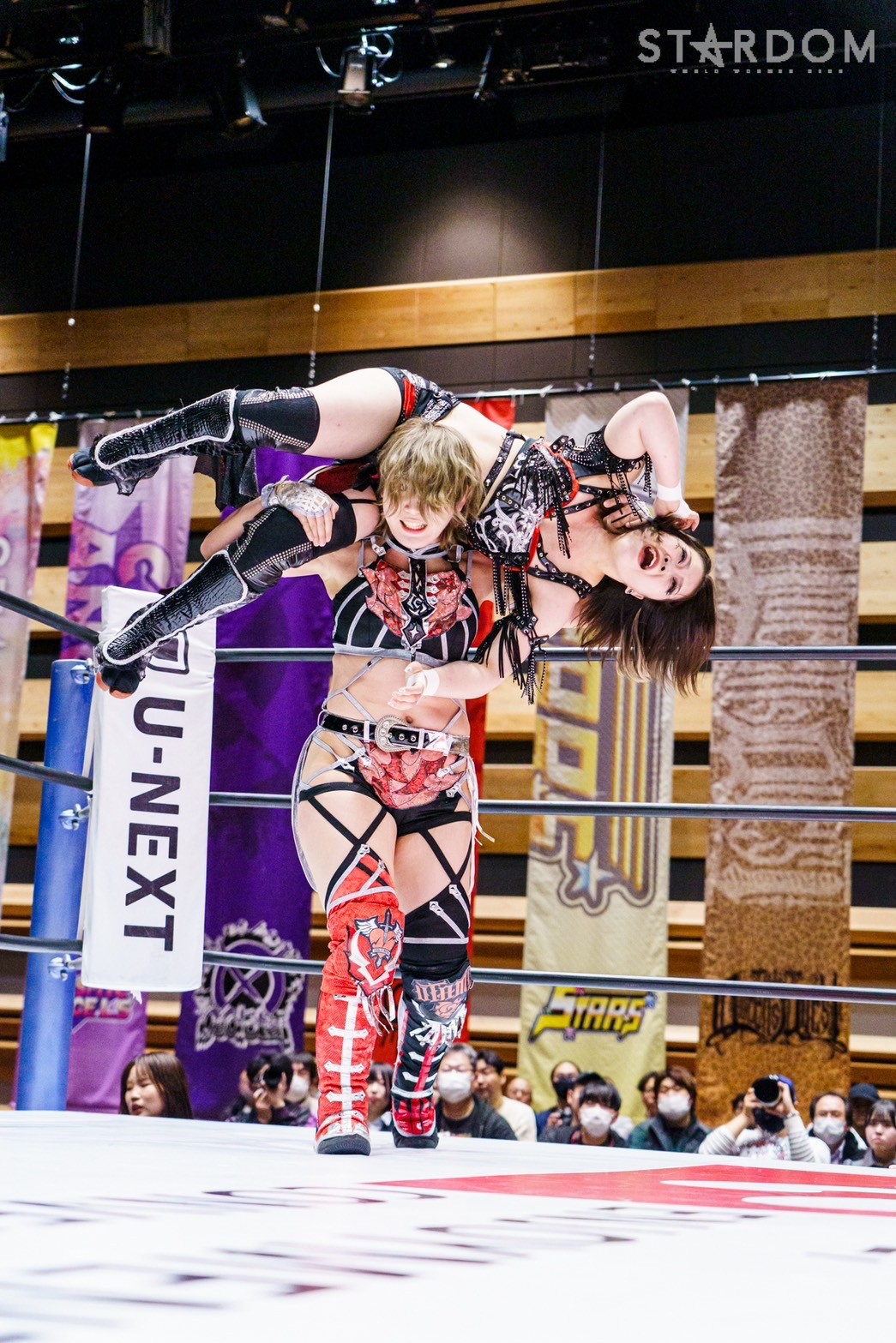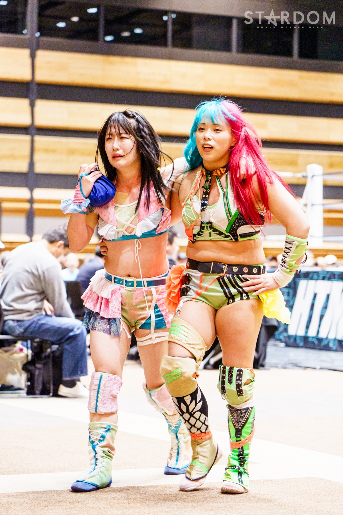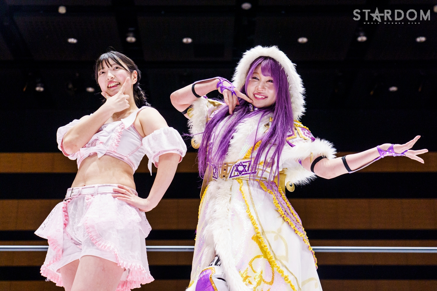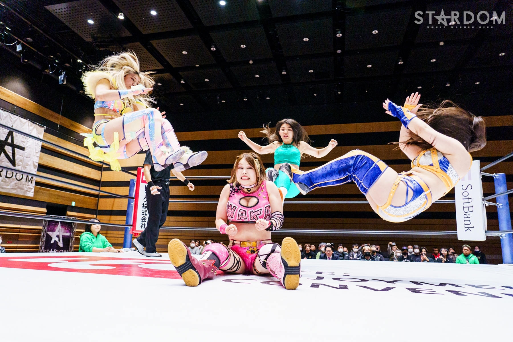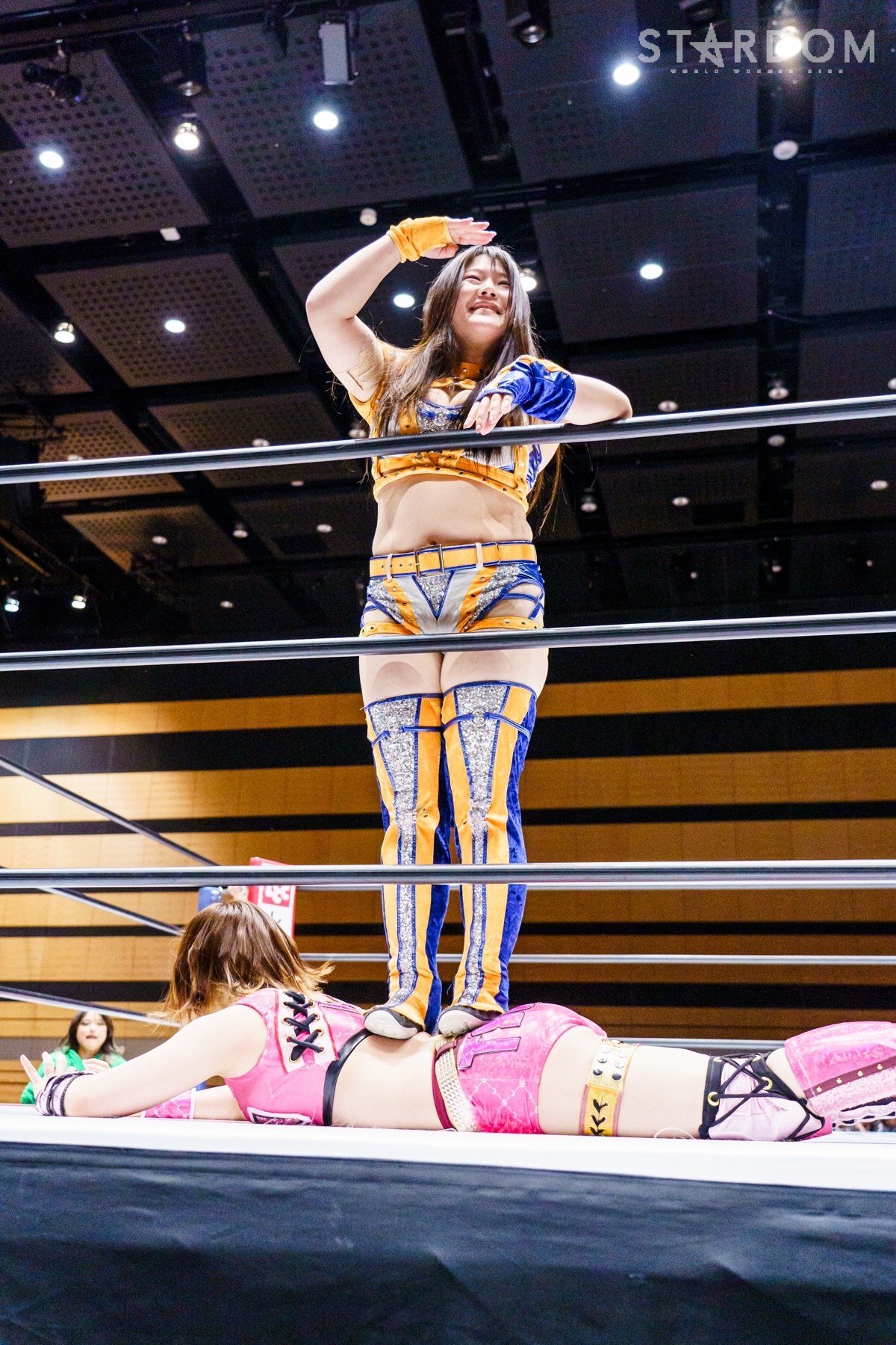 羽南が丸め込むもHANAKOが返してビッグブーツ。月山が羽南にミサイルキック。羽南が返すと、月山は極楽ドンの構え。月山の突進をコグマがガンスタンで阻止、STARSが合体フェースクラッシャー、羽南がフェイマサ―。しかし月山が肩を上げる。羽南はフィニッシュを宣言し、月山にブロックバスター狙い。月山が丸め込むと返した羽南がランニングエルボースマッシュ、HANAKOがビッグブーツで羽南をカットしジーナと合体DDT、HANAKOが月山を羽南の上に投下。羽南が返すとバックドロップ狙い。月山が切り返しオースイスープレックス。羽南が返すと、HANAKOがボディースラム、月山を羽南に叩きつけようとするがかわされる。羽南が丸め込むと月山が3カウントを奪われた。試合後は、羽南が飯田とともに月山&HANAKOにベルトを誇示。
