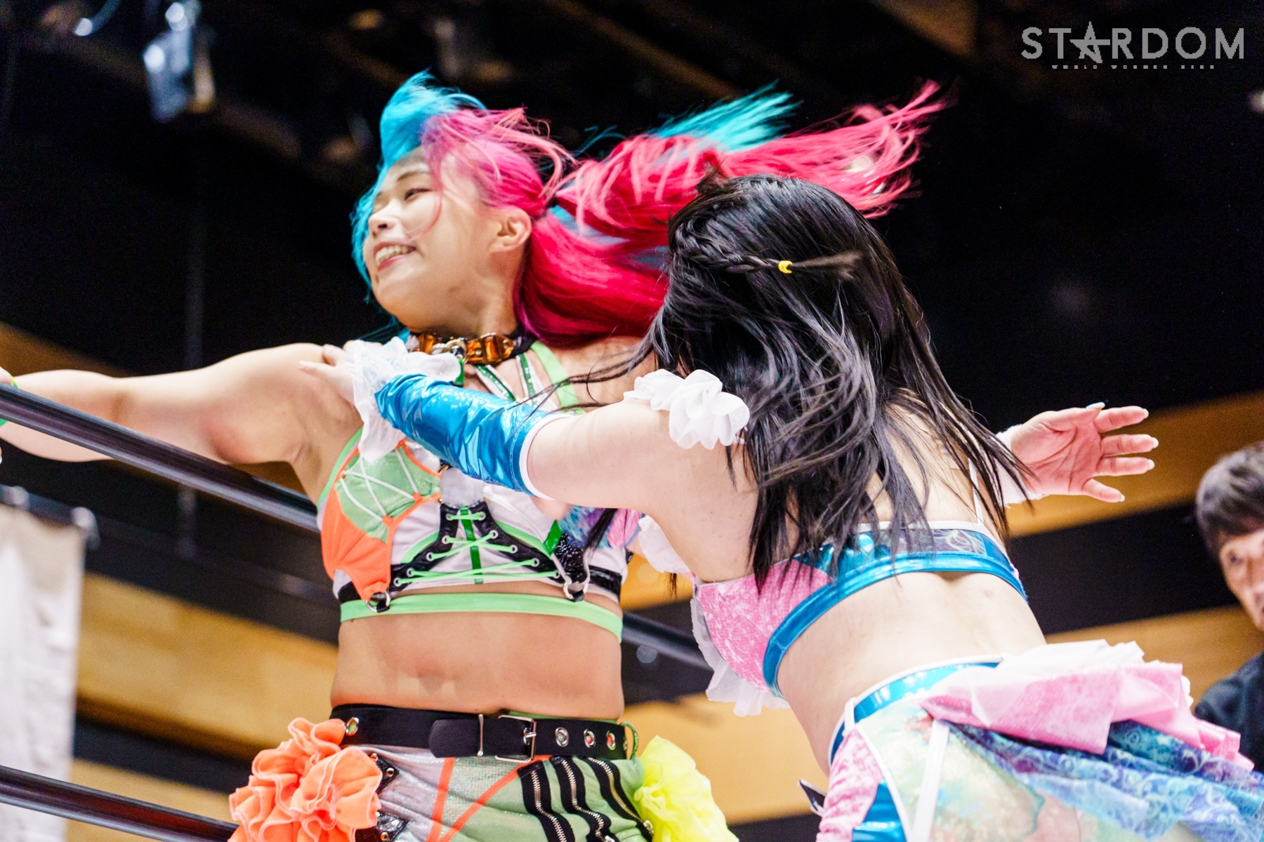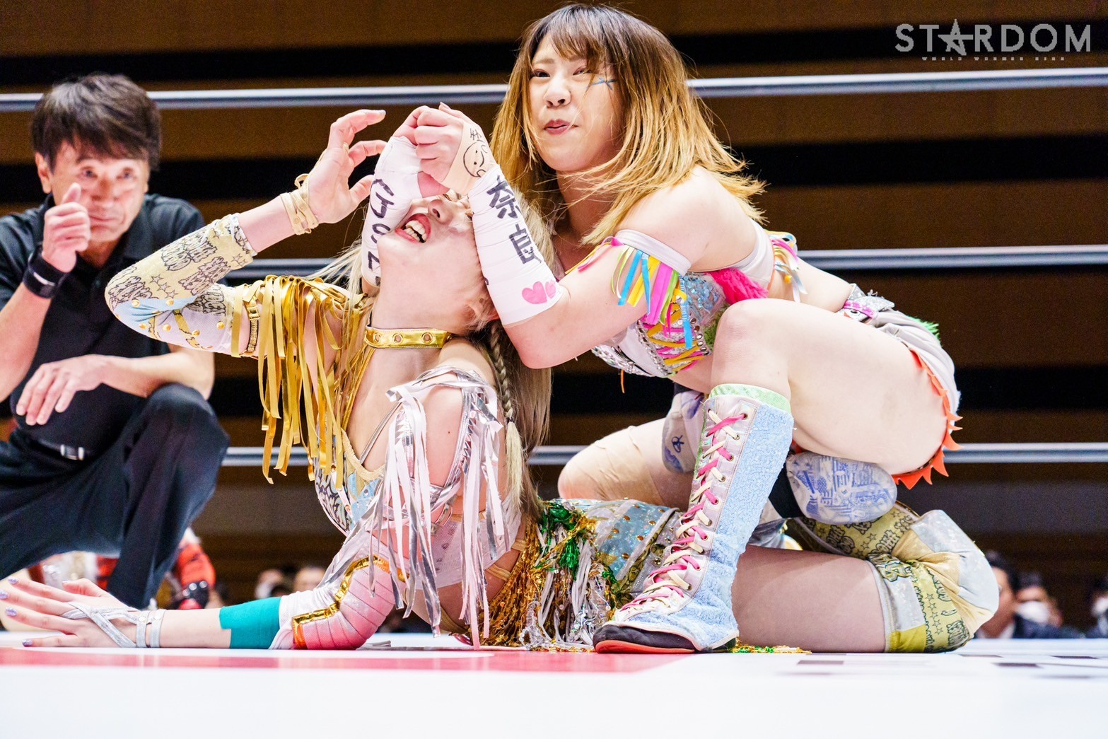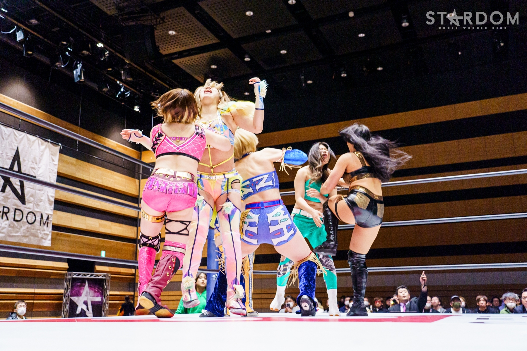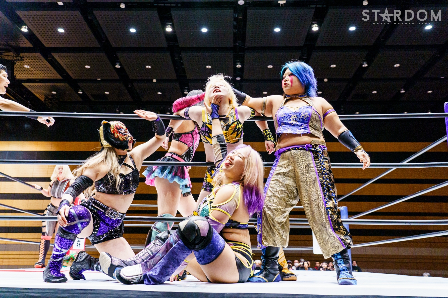 ゴッズアイの朱里&MIRAI&壮麗亜美&鹿島沙希&八神蘭奈組と大江戸隊の刀羅ナツコ&渡辺桃&スターライト・キッド&琉悪夏&吏南組が10人タッグマッチで全面対決。前日、MIRAIのスターダム退団が明らかになった。それはすなわちゴッズアイからの脱退も意味している。ユニット総力戦でMIRAIが何を見せるのか。