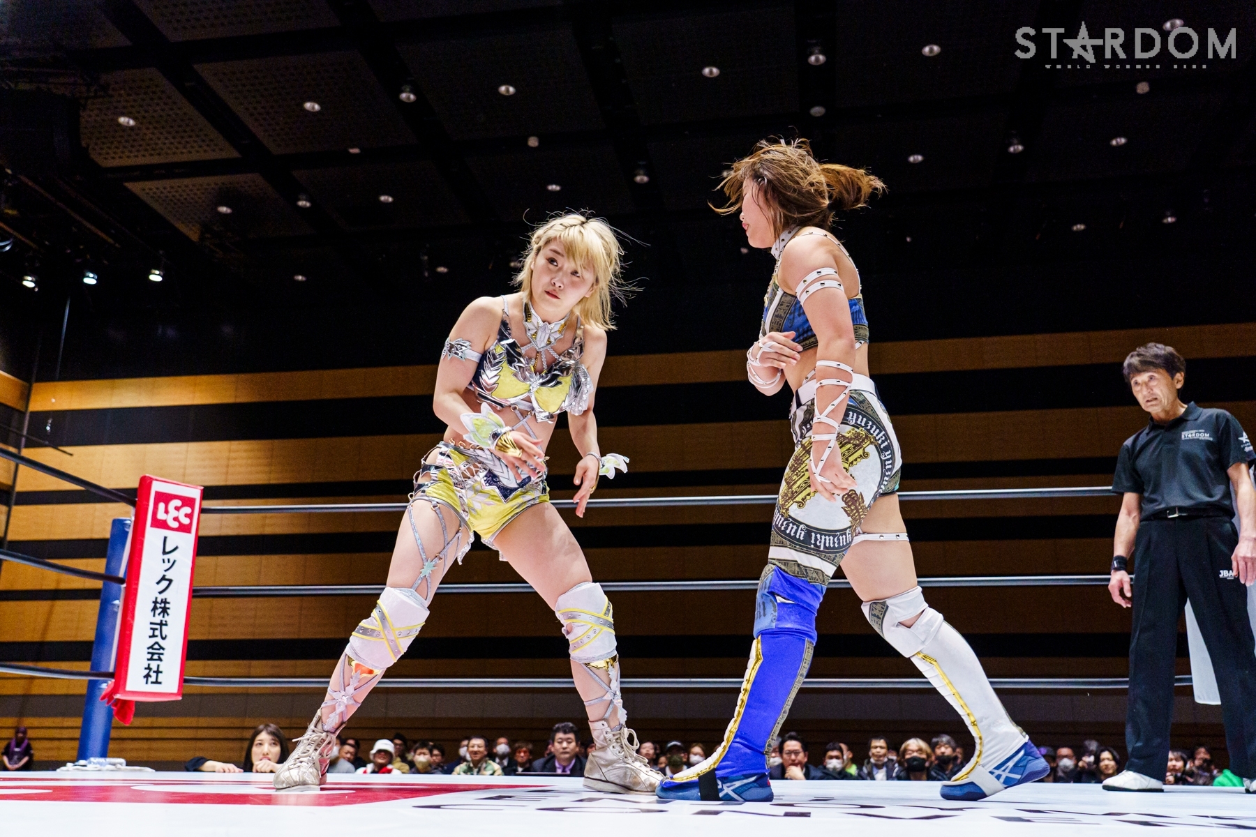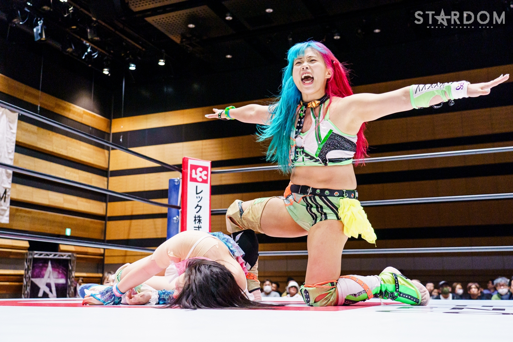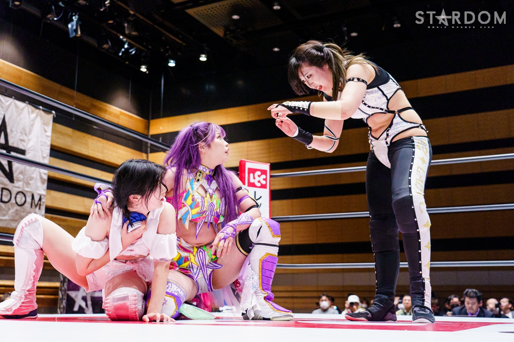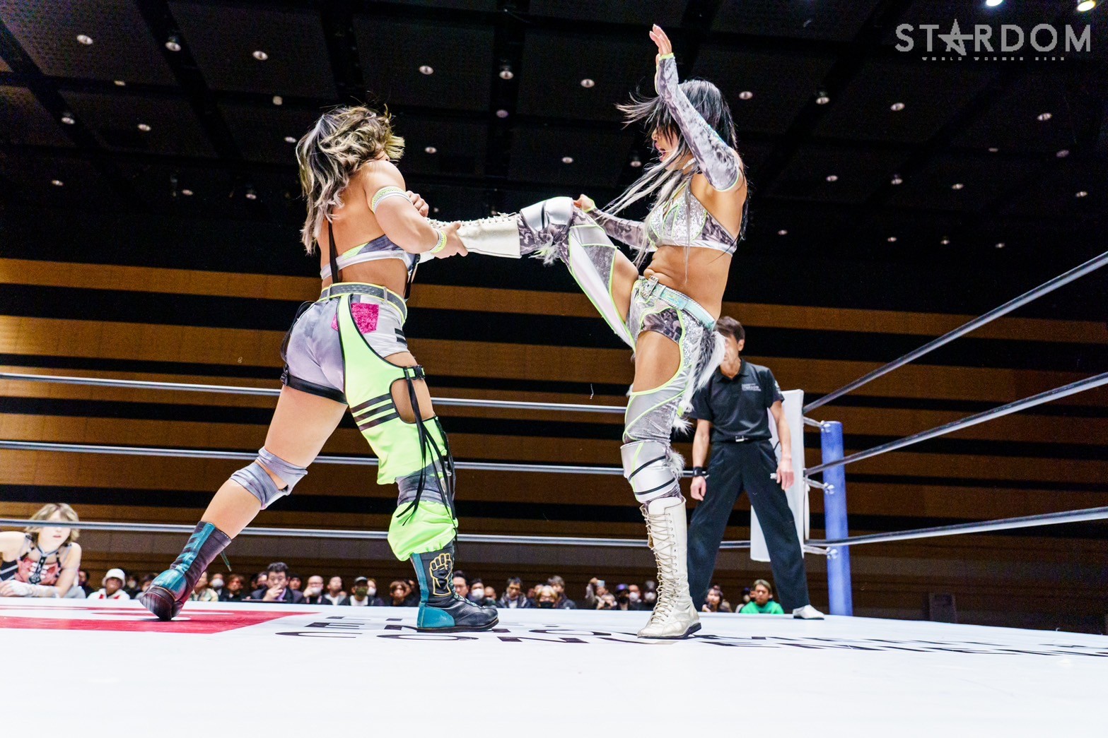 ゴッズアイの朱里&MIRAI&壮麗亜美&鹿島沙希&八神蘭奈組と大江戸隊の刀羅ナツコ&渡辺桃&スターライト・キッド&琉悪夏&吏南組が10人タッグマッチで全面対決。前日、MIRAIのスターダム退団が明らかになった。それはすなわちゴッズアイからの脱退も意味している。ユニット総力戦でMIRAIが何を見せるのか。