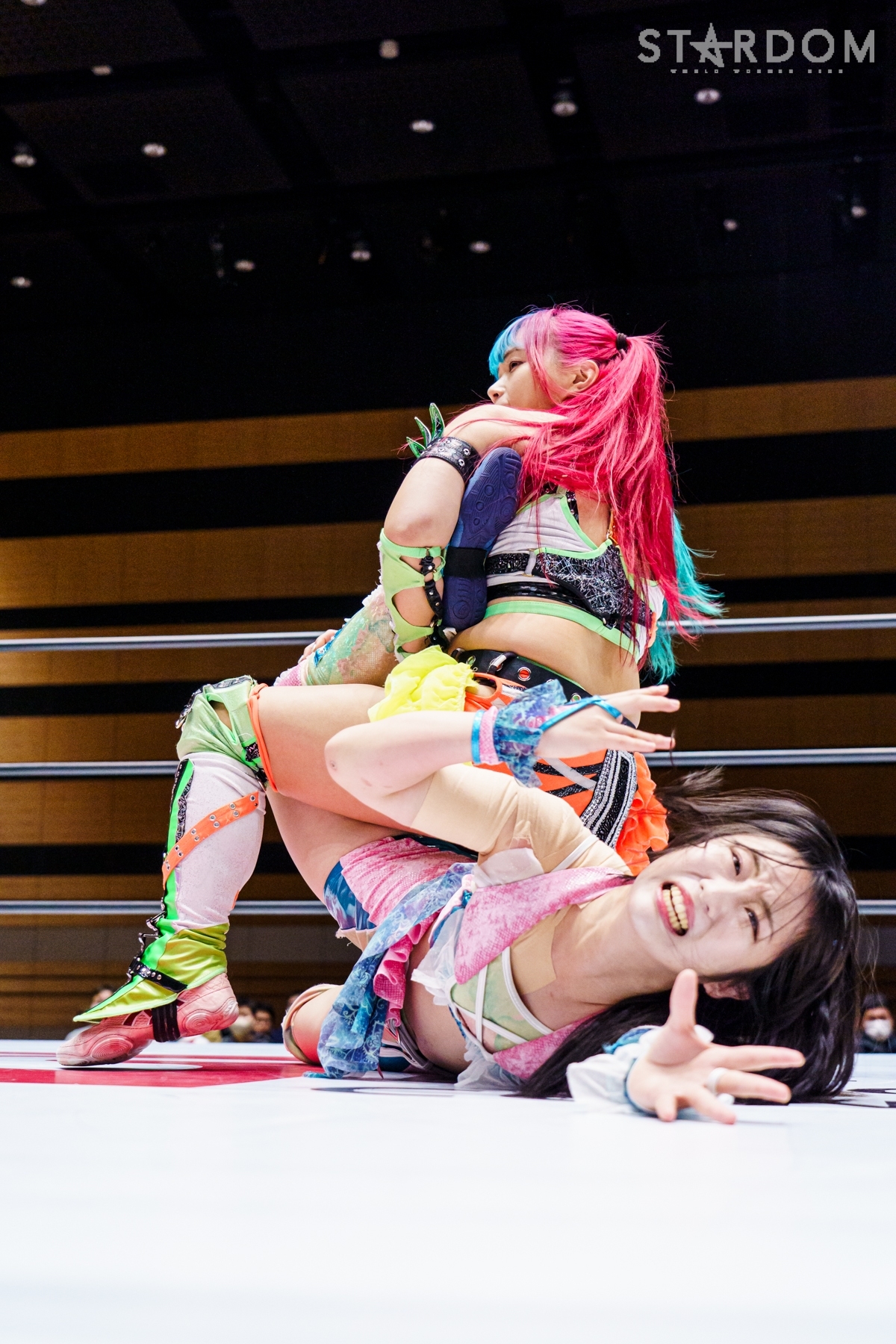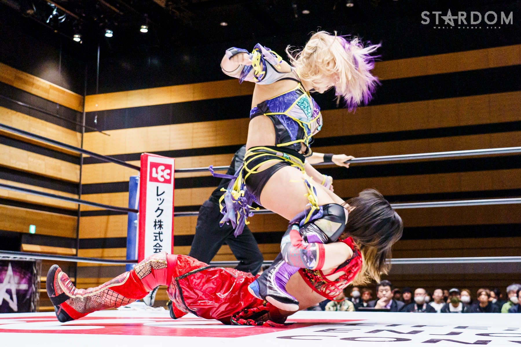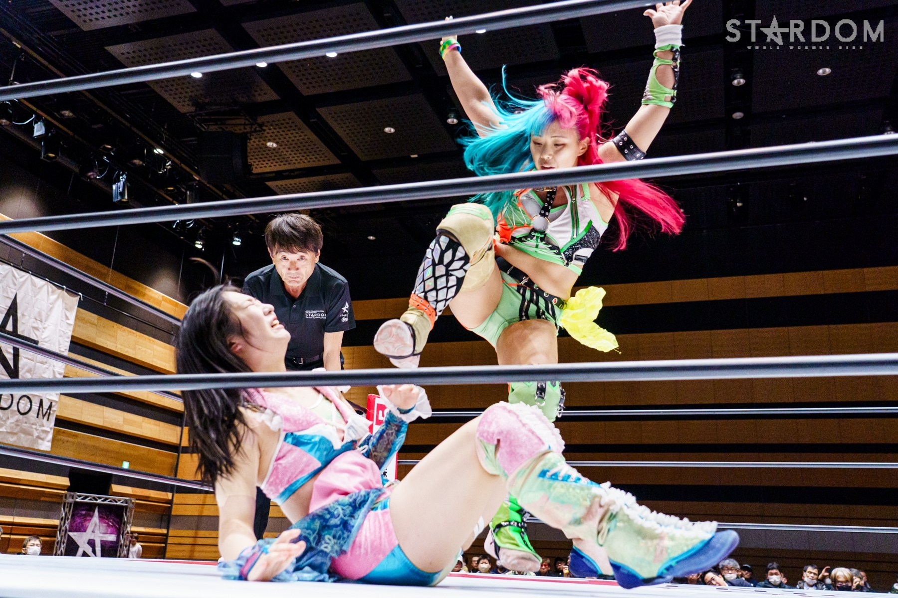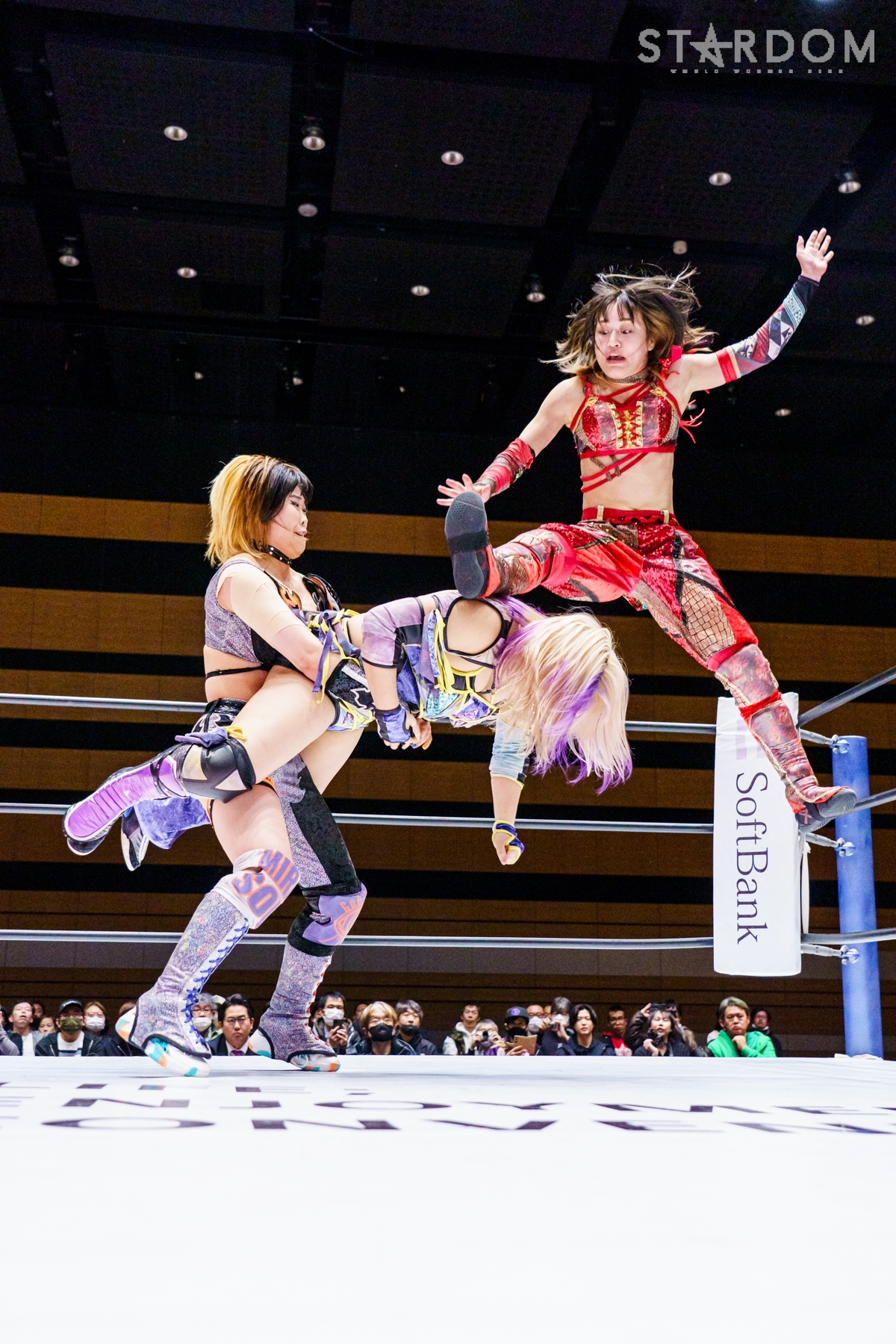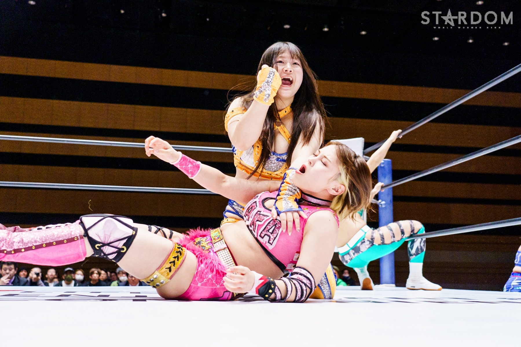 ゴッズアイの朱里&MIRAI&壮麗亜美&鹿島沙希&八神蘭奈組と大江戸隊の刀羅ナツコ&渡辺桃&スターライト・キッド&琉悪夏&吏南組が10人タッグマッチで全面対決。前日、MIRAIのスターダム退団が明らかになった。それはすなわちゴッズアイからの脱退も意味している。ユニット総力戦でMIRAIが何を見せるのか。