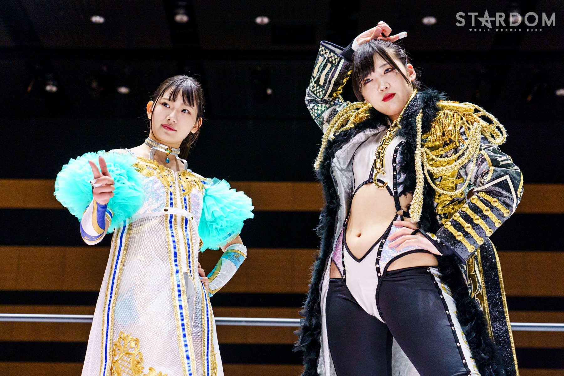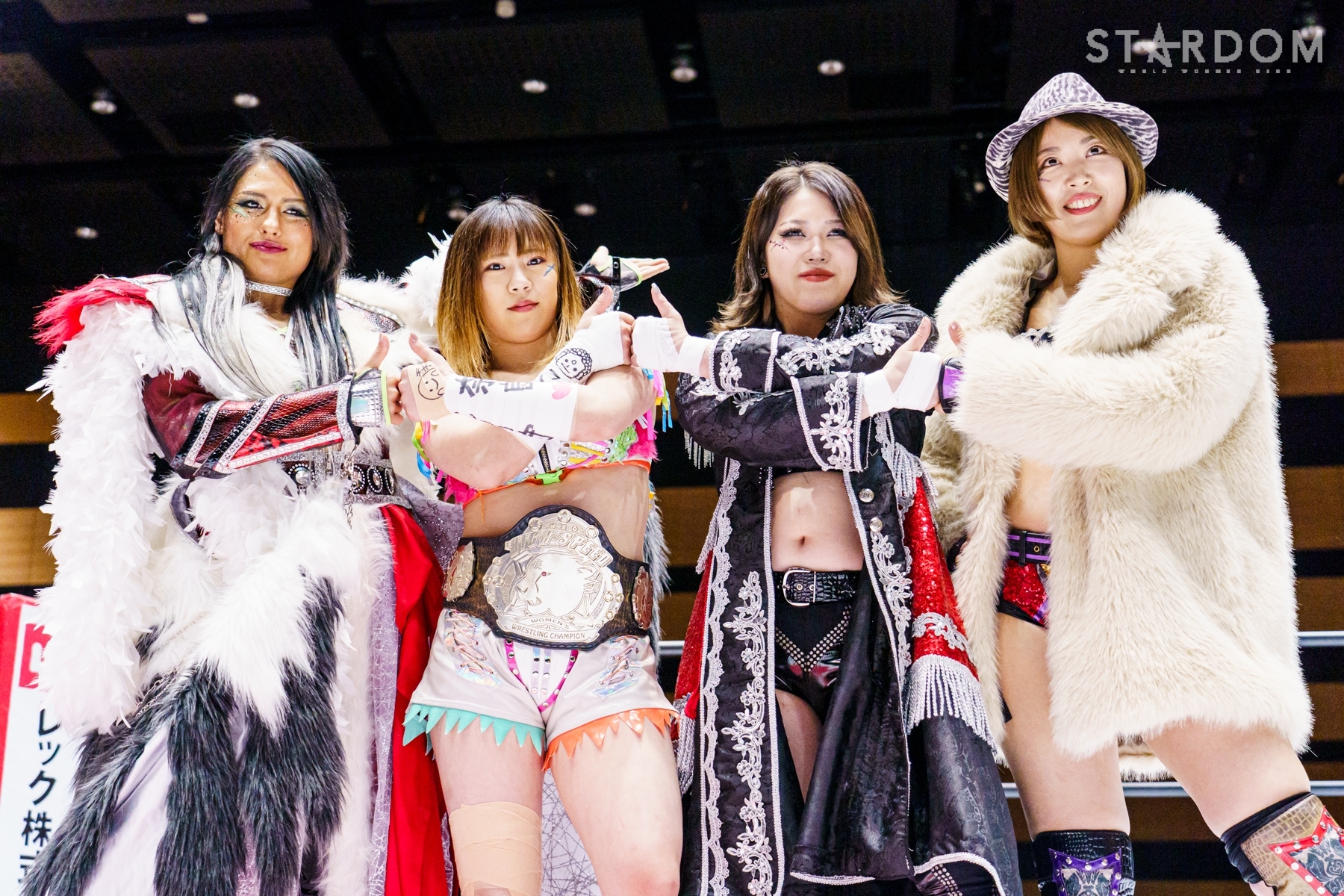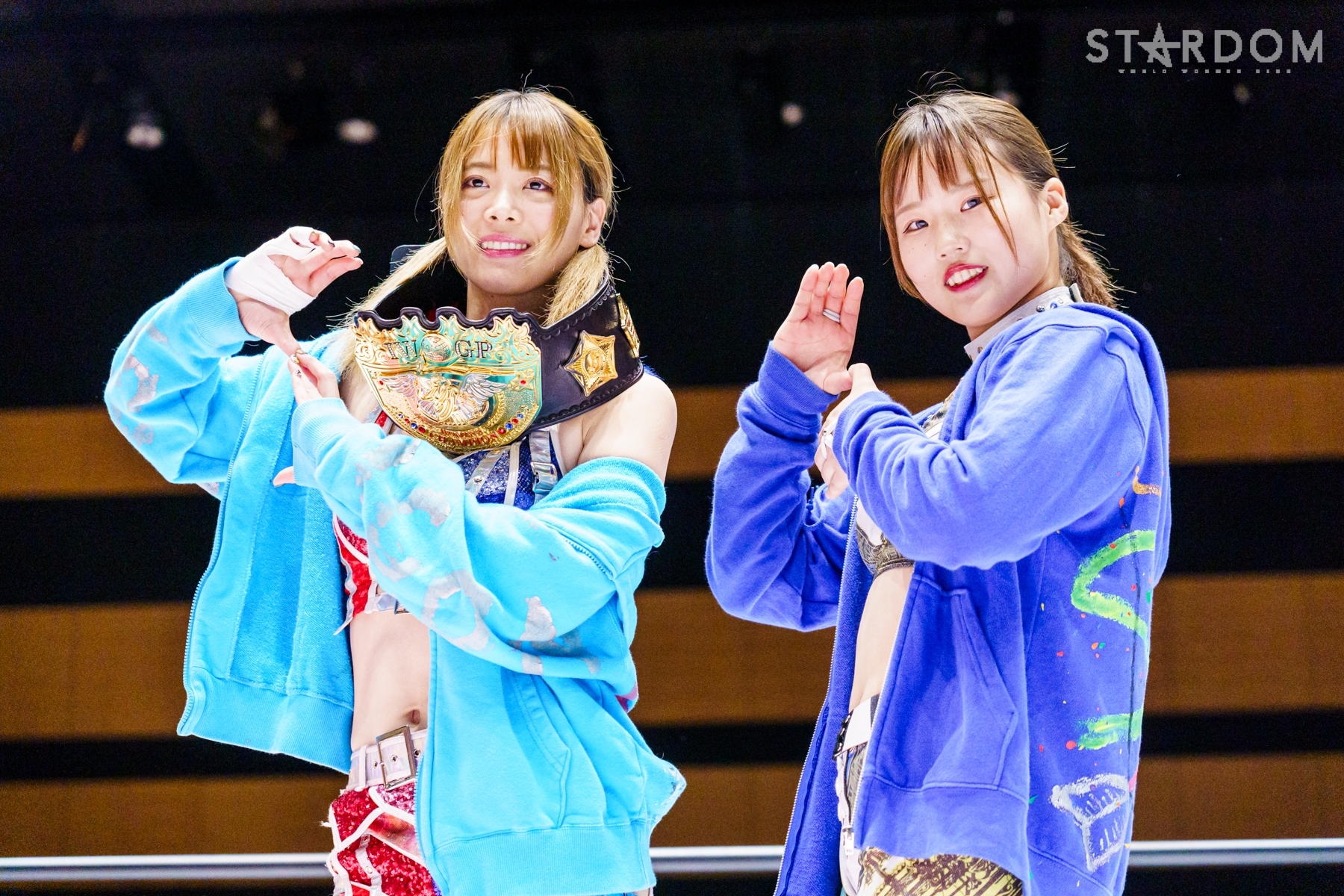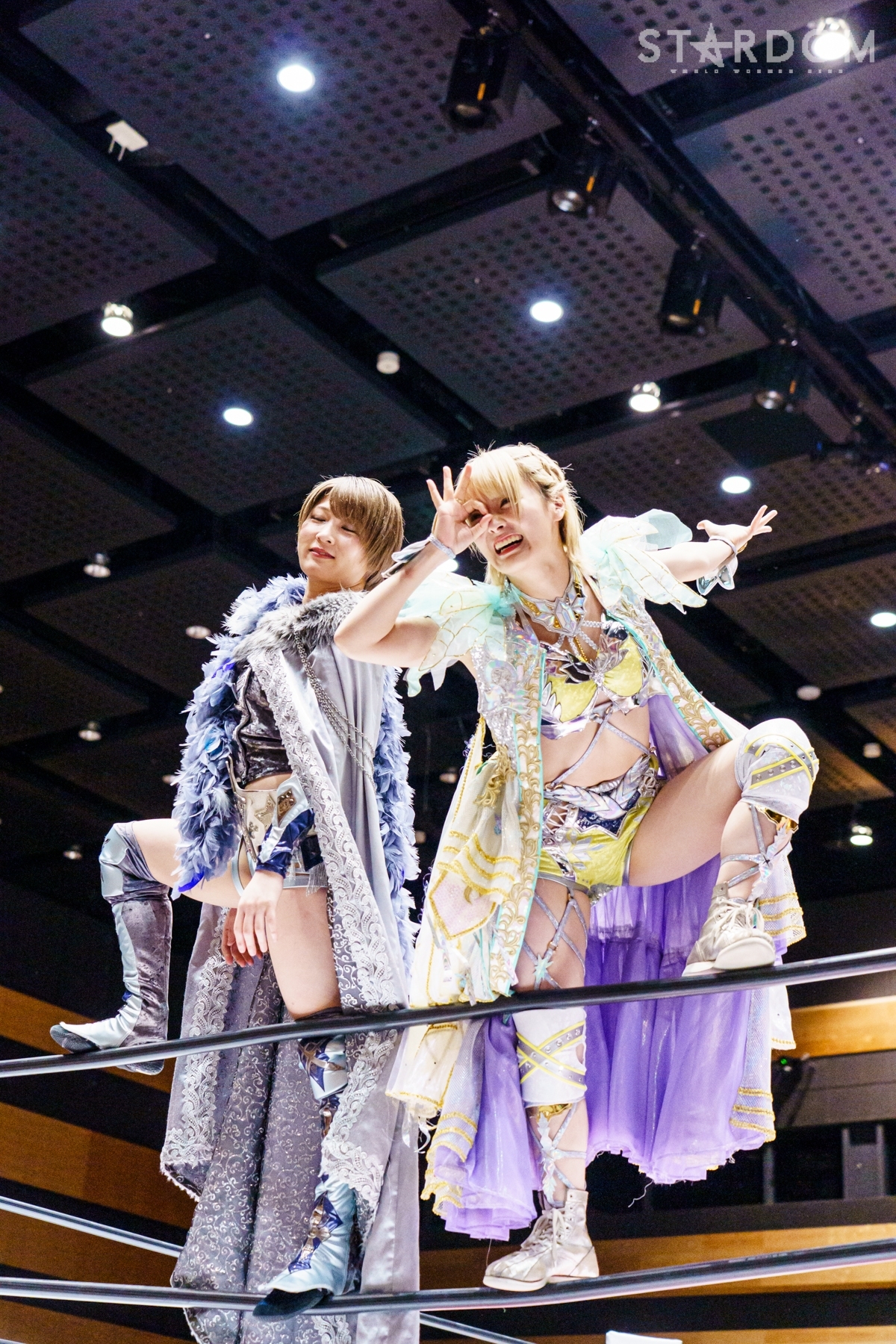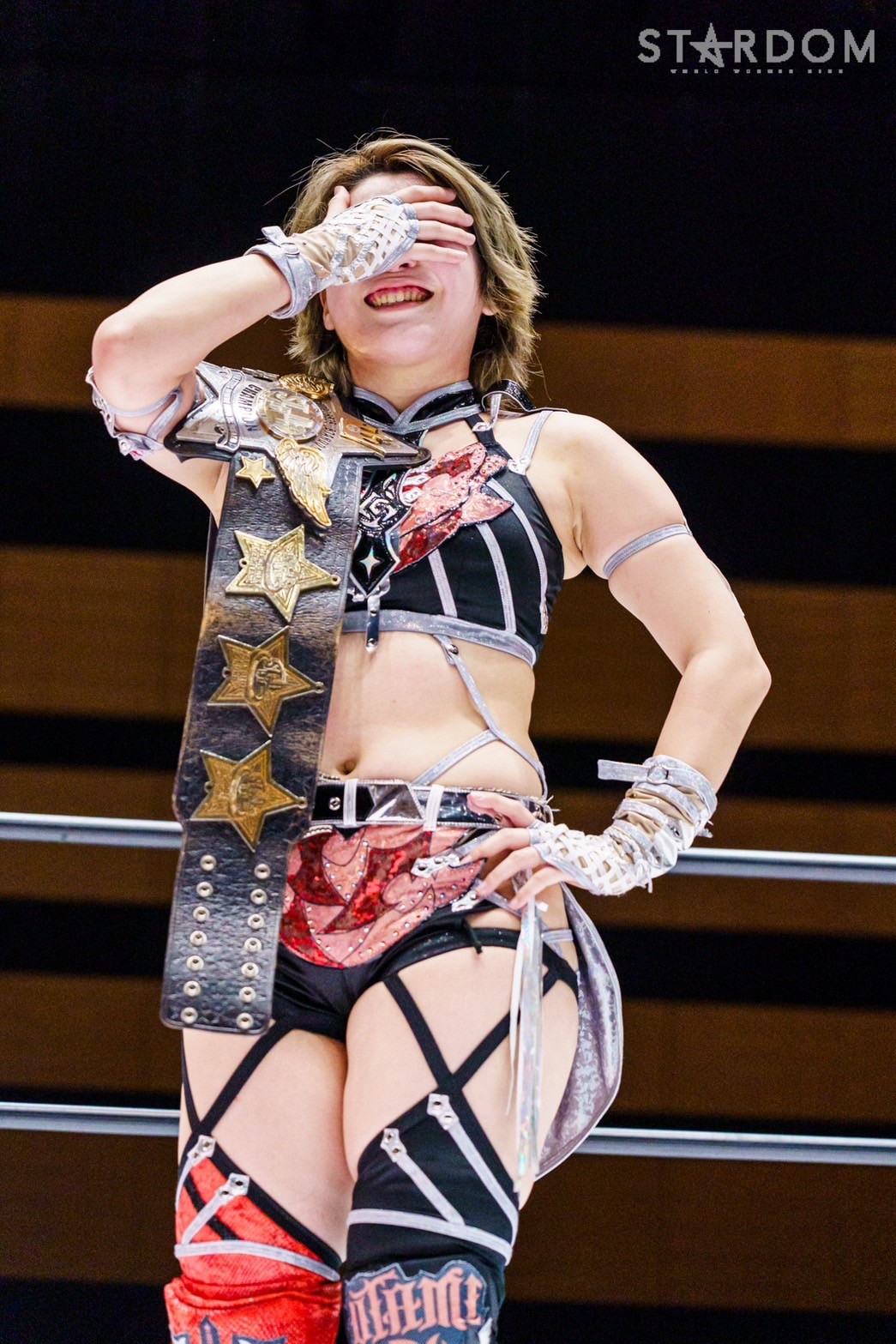 詩美「そうですね、ゴッデスはしっかり防衛して、アフロディーテ最後の防衛戦は勝って、最後とかはアレだけど、勝ってこのベルトはスターダムに返上して終われたらなと思います。なので仙台、アフロディーテの試合楽しみにしていてください。今日は、すごい珍しい2人と組ませてもらって、ひめか引退直後にそれぞれ闘ったことはあるけど、こうやって黄金世代でまとめて組んで、闘っても楽しかったけど、今日も組んでみて、息はなかなか合わないところもあるけど、すごい楽しかった。でもやっぱ、闘いたいなっていうのが本音なんで、どっかのタイミングで黄金世代で闘えたらなと思います」