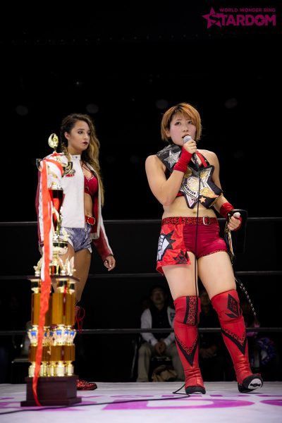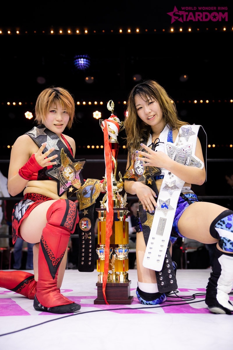 桃「ゴッデス・オブ・スターダム4度目防衛成功しました。まあ私たちのこの防衛は当たり前と言っちゃなんですけど、まあ、なんて言うんですかね、まだ途中に過ぎないというか、まだまだ私たちはこのベルトの価値を上げていくつもりなんで、ご期待ください。そして(3・28)後楽園大会、私は白いベルト、ウタはSWAのベルト。2人ともシングルのタイトルもいっぱい持っているので、大変ですけど、私はアンドラス宮城から必ずスリーを取って、最多防衛記録をもっと更新していきたいと思います」