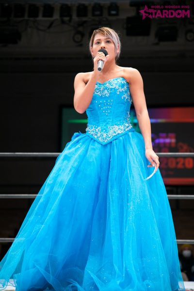 ジュリア「(ティアラが)壊れちゃった…。(観客の「かわいい」の声に)うるせーな! 舐めるなよ! いや、ちょっとでも、刀羅ナツコのドレス姿も見たかったよね。今日、この優勝をまずは第二の母国であるイタリアの親戚や仲間に捧げたいと思います。ジャングル叫女、渡辺桃、朱里、そして刀羅ナツコ。みんなマジで強烈でした。マジでインテンソでした。優勝したら私、ツイッターとかで調べたんですけど、優勝したらこのドレスとティアラが贈呈されるしか見当たらなかったんですけど、さっき願いごと言っていいって言ってたから、やっぱり言っていいんですよね? 願いごとね。じゃあ言わせてもらいます。私には、闘いたいヤツがいる。今日は、この日は、私がその闘いたいヤツと胸張って真っ向勝負、1対1でやりたいから、そのためにこのタイミングを私は待ってたし、私はここまで上がって来ました。でも、そいつは1・4東京ドームでクッソつえー、変態で、私を一発で黙らせた女だけど……今日不在です。でも、私は星輝ありさと一騎打ちがしたい。だけど、正直できるかどうかがいまはわからない。でも、アイツとやりたくて、やりたくてたまらないこの気持ちは変わらないから。できないんだったらしょうがないけど、さっさと治して出て来いよ。4・29大田区総合体育館で。私はお前の持つ白いベルトに挑戦したい。叶うならば。だから私は待ってます。4・29大田区総合体育館、合ってますよね? もし、もし、もしダメだったら私が白いベルトを、そのままいただいきます。異議があるならドンドン言ってきてほしいなと思っております。そして、私はスターダムに来て半年。来たばっかのときは正直ドン底だった。けど、ここからがジュリアの本当のシンデレラストーリーだと思ってるから、そこから上がって行くところをみんなによく見ててほしいなと思います。ジュリアのことが好きで、好きでたまらない諸君、一瞬たりともジュリアから目を逸らすなよ! アリベデルチ、またな!」