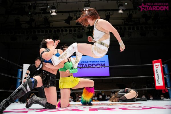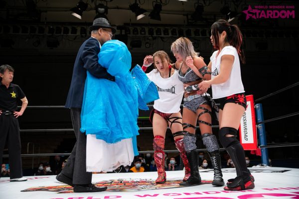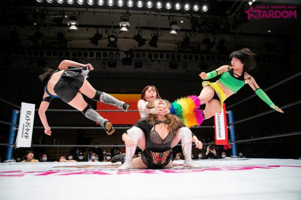 手四つにいこうとする輪から夏が離れる。するとほかの3人が襲いかかり次々と串刺しドロップキックを浴びせていく。星野がキャメルに決めると左右から双子姉妹がドロップキックの挟み撃ち。さらに左右からの腕十字に夏を捕らえる。星野がカットし姉妹にドロップキック。夏は星野が助けてくれたと解釈し抱き寄せる。夏は星野に結託を呼びかけ、合体攻撃。夏が吏南を捕らえると星野は妃南をコーナーに追い込む。夏がブロンコバスターを指示するが、姉妹は先に攻撃。吏南は夏と妃南をコーナーに追い込む。星野をかわした吏南が3人めがけて突進。しかしあえなくかわされる。夏が星野と妃南にムチ攻撃。コーナーに追い込むが背後から吏南がムチを奪いにかかる。吏南が奪い取るが使用せずに卍固め狙い。切り返した夏が“掌底”。3人をコーナーに追い込んでブロンコバスターの餌食にしてみせる。夏は吏南にブロックバスターホールド。これで3カウントが入り、夏の勝利が宣告された。