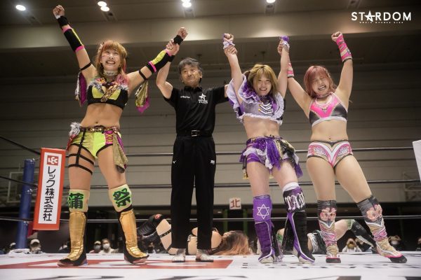 ゴングが鳴ると3人で探り合いも朱里と桃がやり合い、レディは蚊帳の外に。ブレイクしてからレディが入ろうとすると朱里と桃が一時結託。レディが朱里に突進の連続。朱里が受けて立つと、倒せないレディが痺れを切らしたか手を差し上げて挑発する。しかし朱里はグラウンドに持っていきサッカーボールキックから腕固め。しかし桃がカットにミドルキックの連打を浴びせる。桃が突進しようとすると朱里が先回り。桃に飛ばせずストンピングとニーの連打。桃がコーナーに振って串刺しドロップキック。レディが先回りして朱里にビッグブーツ、怒った桃にもビッグブーツ。さらに河津落としからチョークスラムを狙う。しかし桃が受けずにドロップキック。レディが返すと、桃がBドライバー狙い。レディが丸め込むと桃も反転。朱里がミドルをぶち込み乱入。朱里が串刺しニーアタックからフロントネックチャンスリーも桃がカットしレディに蒼魔刀からドラゴンスリーパー。レディがエスケープすると、桃がバックを取る。朱里が割って入り桃と打撃の打ち合い。桃が逆さ押さえ込みを狙うとレディがまとめてカバーする。朱里が桃にハイキック、レディを起こすとフィニッシュを予告してバズソーキック。しかしレディがかわして丸め込む。レディは朱里のニーアタックもクリアー。しかし朱里が腕固めに入るとレディがギブアップした。
