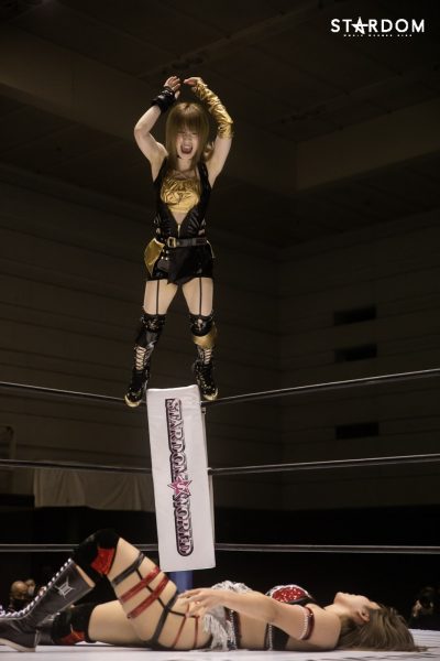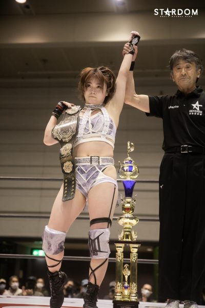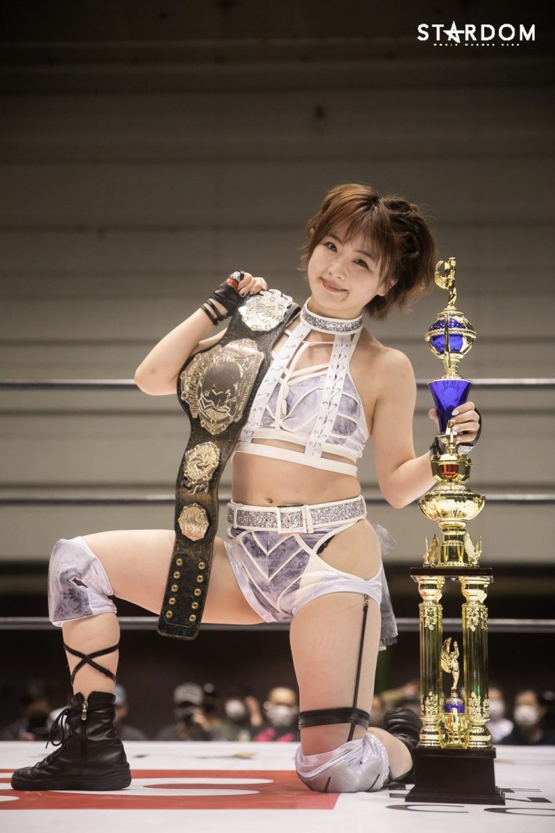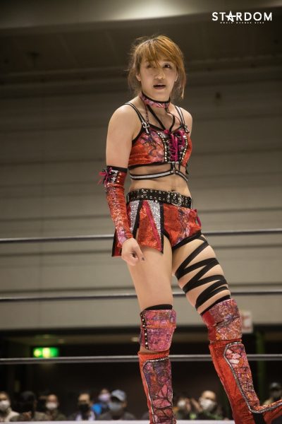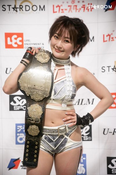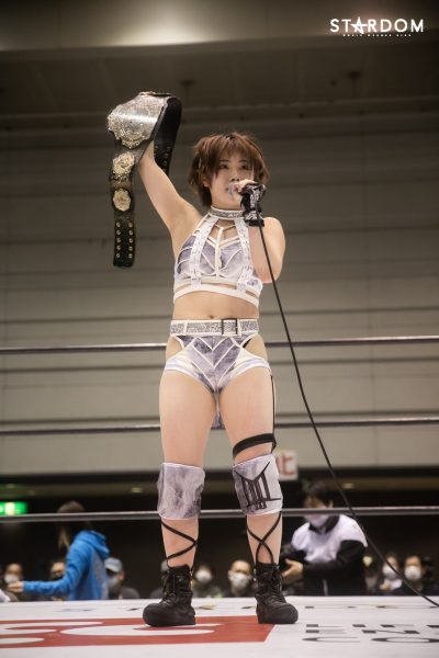 「ハイ、ハイスピード初防衛成功しました。キッチャンとは、遅かれ早かれ絶対に闘いたいと思ってたし、闘うべき相手だと思ってたので、ここで勝てたことホントにうれしいです。キッチャンはさあ、かわいい顔してるけど、絶対性格悪いよね。私も人のこと言えないけどさ。なんか、うざいくらいしつこい執着心というか、死ぬほどあきらめない気持ちみたいな。あらためてキッチャンから感じて、私もこれからどんなことがあっても、あきらめないし、小っちゃい身体から出る最高のスーパーパワーでこれからスターダムを駆け上がっていきたいなと思いました。キッチャンと闘えてよかったです。バイポイ」