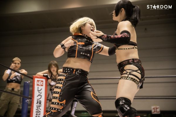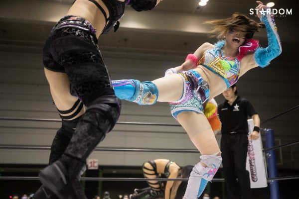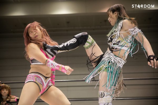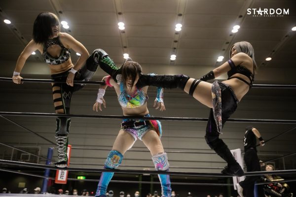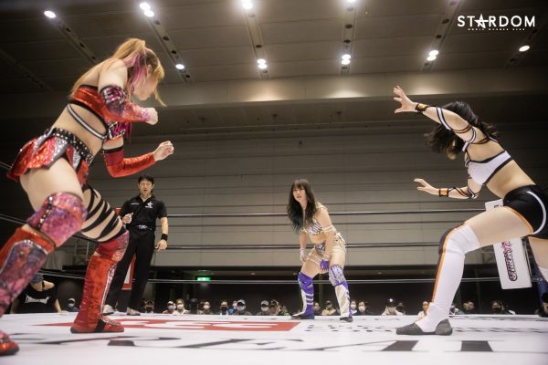 朱里vs渡辺桃vsレディ・Cの3WAYマッチで大阪昼夜大会がスタート。朱里と桃の蹴り合いにどこまでレディが食い込めるか。