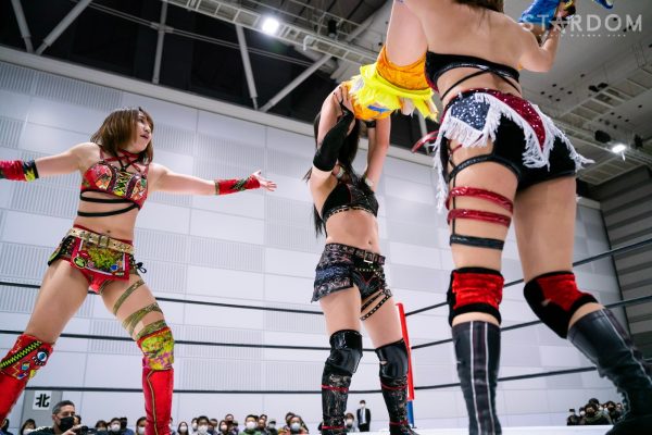 ゴングが鳴ると桃とキッドが睨み合い。レディが手を挙げて誘うが場外に送り出され、リング上では桃とキッドがエルボーの打ち合い。レディが割って入り桃にショルダータックル、しかしキッドがコルバタからドロップキック。キッドはレディを捕獲しロープに固定すると後方から馬乗り。さらにエプロンから顔面目掛けてビッグブーツ。返したレディにキッドはキャメルクラッチ。桃が割って入りキッドに持っておくように指示。桃がロープを走りレディではなくキッドにミドルキック。桃はレディに逆エビ固め。するとキッドが「お返しだ」と桃にドロップキックを食らわせる。桃はキッドとレディをコーナーに追い込んで串刺しドロップキック。レディがかわしたためキッドにヒット。レディはビッグブーツを食らわし2人まとめてマットに叩きつける。さらにレディは2人に逆水平チョップの連打。しのいだキッドが桃とレディにまとめてコルバタ、その場飛びムーンサルトプレス。キッドはレディのビッグブーツをかわすが脳天唐竹割りをもらってしまう。レディはキッドにジャイアントスイング右回転から左回転。そこへ桃がキッドにミドルキックで分断。桃はレディにミドルの連打、レディはビッグブーツで対抗する。レディは桃にコブラツイスト。キッドが割って入りカットする。レディはキッドにビッグブーツ、2人まとめてチョークスラムを狙うがこらえられてしまう。桃が2人まとめて蒼魔刀、キッドにもう一発蒼魔刀。キッドが返すと、桃はチキンウイングフェースロックからBドライバー狙い。キッドが切り返し丸め込むが桃がハイキック。レディが割って入りキッドにビッグブーツ。食らったキッドが勢いで桃を丸め込む。レディは桃の上にキッドをチョークスラム。しかしキッドが2カウントでクリアー。レディがキッドを引き起こしジャイアントバックブリーカー狙い。切り返したキッドがモモ☆ラッチで丸め込むとレディが3カウントを奪われた。