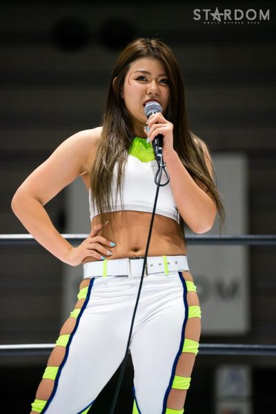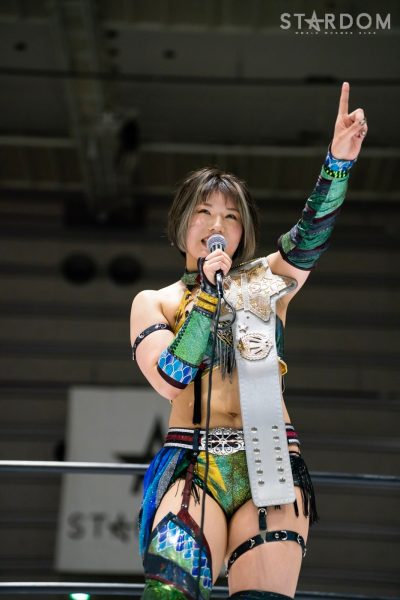 壮麗「福島県のみなさん、こんにちは! そして、ただいま! 私がプロレスラーになってから立てていた目標ふたつ達成することができました。ひとつめは福島県で試合をすること。もうひとつは、ベルトを巻いて帰ってくることです! そして、もうひとつかないました。福島県のメインで勝利を挙げて、自分の曲が最後に流れることです。でも、この3つの目標がかなったからといって、私はまだまだ満足しません。フューチャーのベルトだけではなくもっともっと上の上のベルトもちゃんと福島にまた持ってこられるようにまだまだスターダムのリングで揉まれて揉まれて強くなってまた福島のリングに帰ってきたいと思います。今日はホントにたくさんのお客さんにご来場いただいてホントにありがとうございました。自分に負けるな限界を越えろ、ゴッズアイ!」