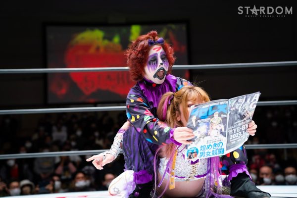 1勝2敗のAZM&天咲光由組と3勝1敗の舞華&ひめか組が公式戦で対戦。パワーでは舞華組が圧倒も、今年の5★STAR GPではAZMがひめかからフォール勝ちをおさめている。体格差を克服しての価値をおさめてきたAZMがこの試合でもハイスピード王者としての実力を見せつけるか。そのためにも、天咲の奮闘がカギを握りそうだ。対する舞華組は3勝1敗で好位置につけているといっていい。油断せず、確実に2点を奪っておきたいところだろう。