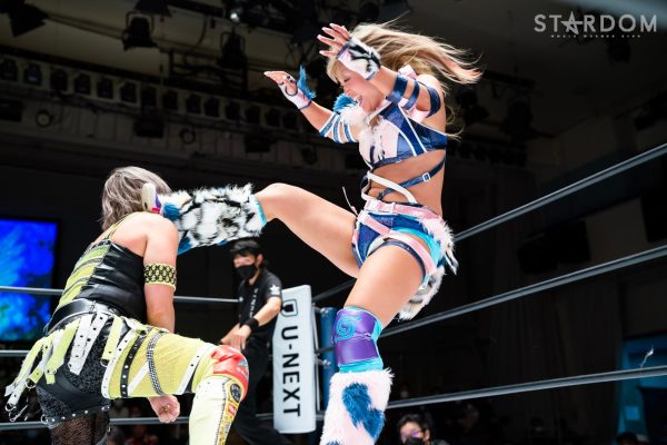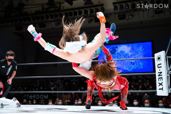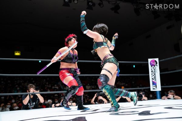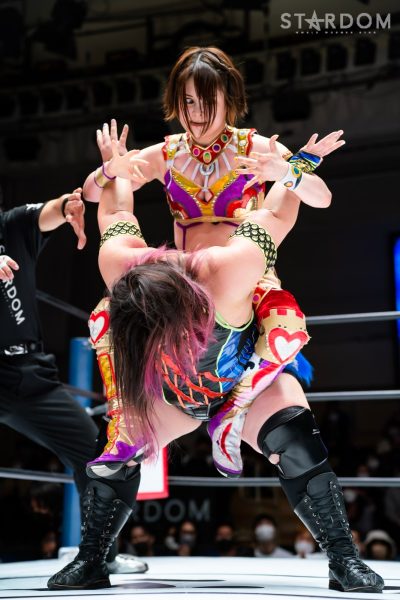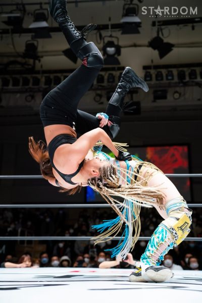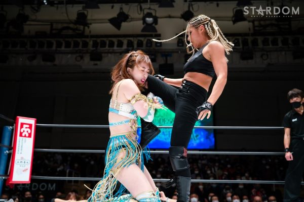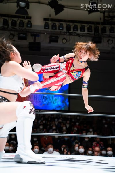 1勝1敗の岩谷麻優&向後桃組と1勝1敗1分けの朱里&稲葉ともか組の公式戦。赤いベルトの王者・朱里と、初代IWGP女子王者の座を逃してしまった岩谷が激突、STARSの向後と、朱里との空手タッグを組む稲葉の遭遇も興味深いカードだ。