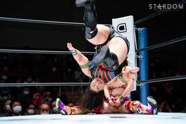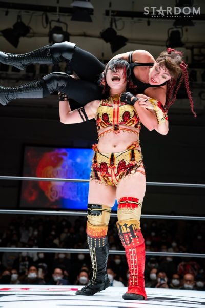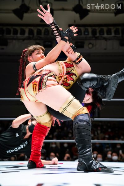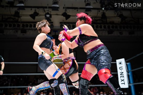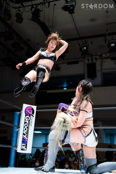 1勝2敗1分けのスターライト・キッド&渡辺桃組と4連敗中の桜井まい&レディ・C組による公式戦。キッド&桃組はゴッデス・オブ・スターダム王座戦、タッグリーグ公式戦、さらには新日本との合同興行におけるミックスド8人タッグマッチでも中野たむ&なつぽい組のメルティアに敗れてしまった。ここは心機一転、あらためてタッグリーグ制覇に臨む。いまだ白星のない桜井組を相手に確実に2点をゲットしたい。とはいえ、桜井組も負けてばかりではいられない。ドンナ・デル・モンドとクイーンズクエストの越境チームも徐々に連係が取れてきた。大江戸隊超えで初勝利を目指す。